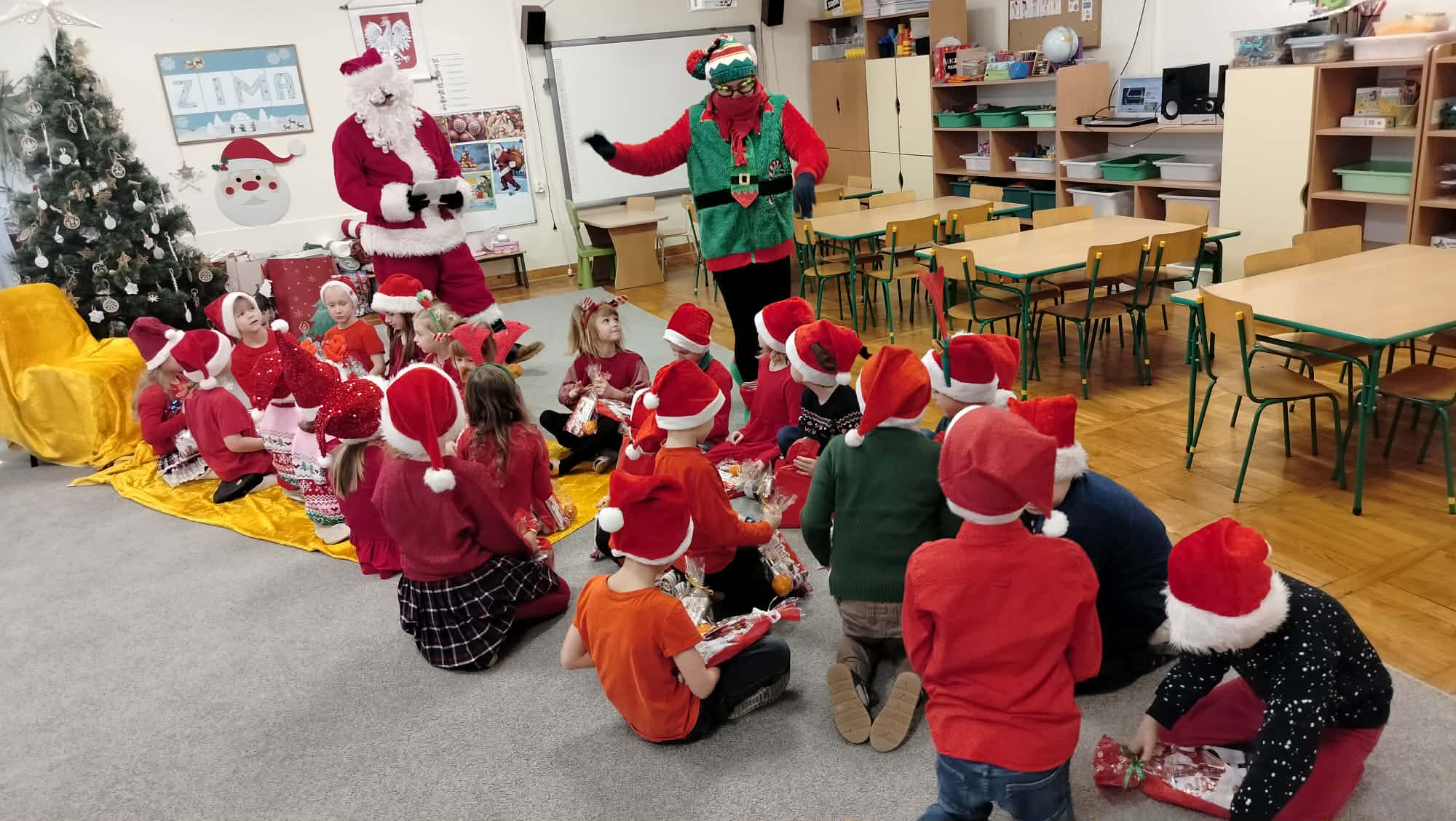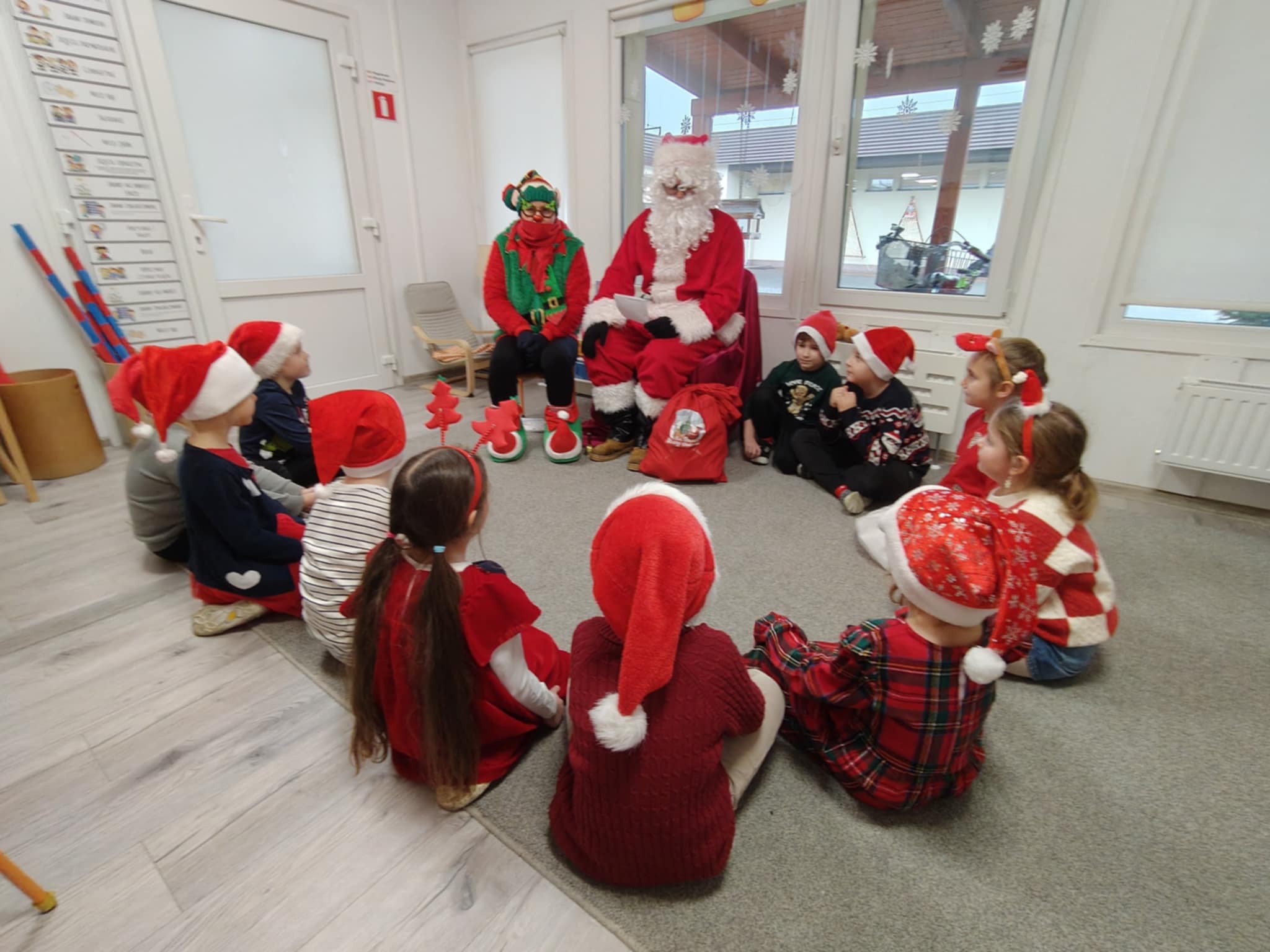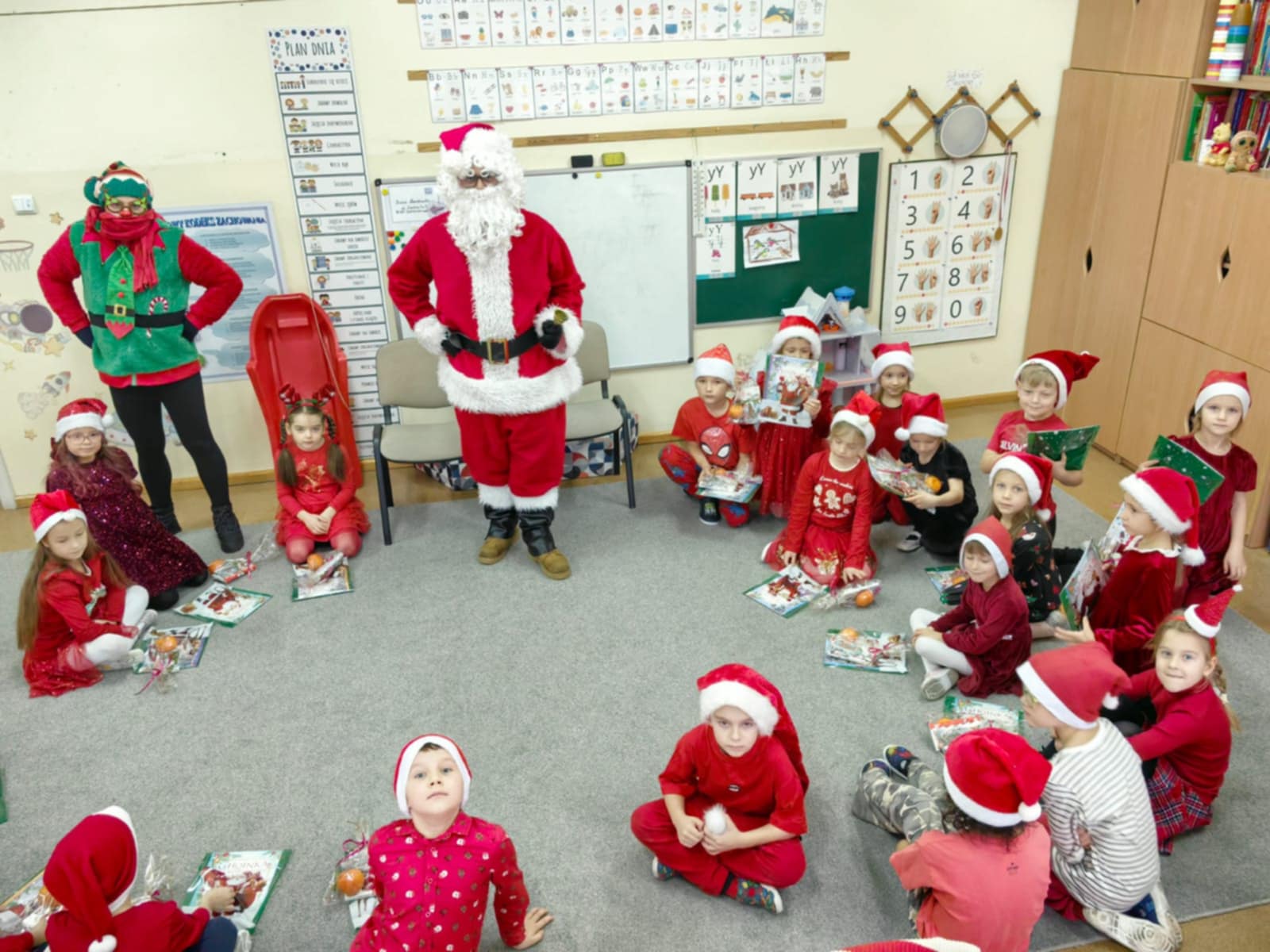 W piątek 5 grudnia nasze przedszkole odwiedził wyjątkowi goście – Święty Mikołaj oraz jego pomocnik Elf! Dzieci z ogromnym przejęciem i radością powitały Mikołaja, prezentując przygotowane piosenki i wierszyki. Po wspólnej rozmowie i zabawie nadszedł najbardziej wyczekiwany moment – rozdanie prezentów. Każde dziecko otrzymało piękny upominek i pamiątkowe zdjęcie. Atmosfera była pełna uśmiechu, wzruszeń i świątecznej magii. Dziękujemy Mikołajowi za wspaniałą wizytę i już nie możemy doczekać się kolejnego spotkania!