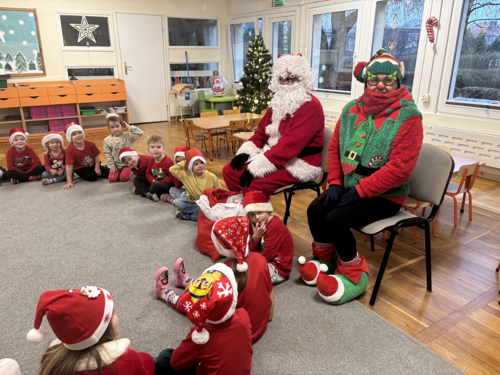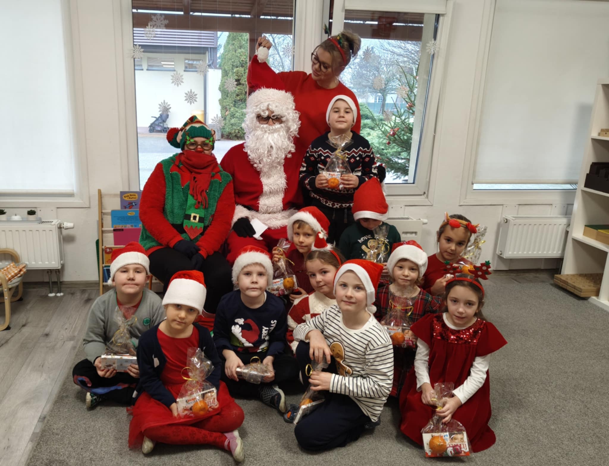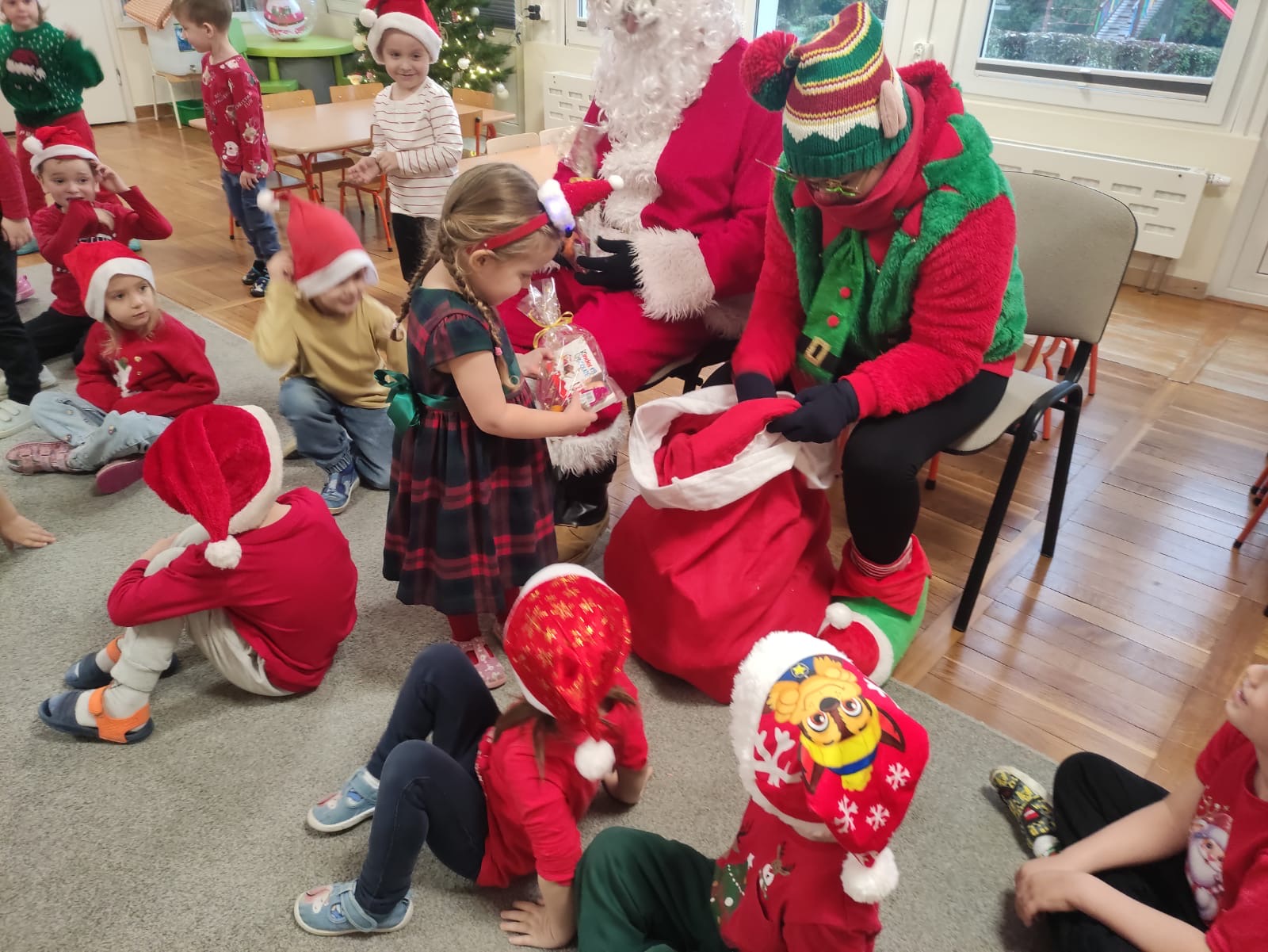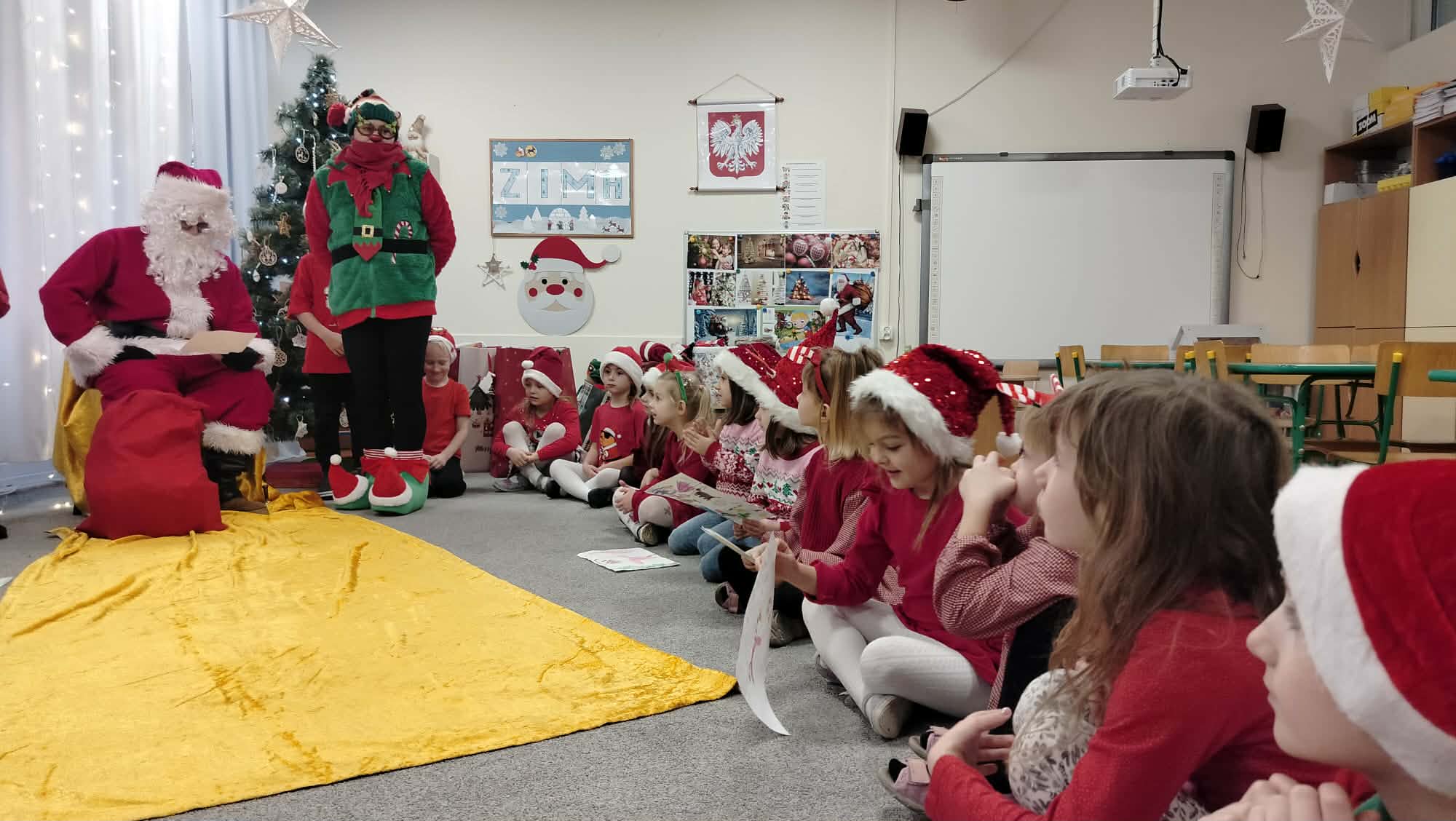 W piątek 5 grudnia nasze przedszkole odwiedził wyjątkowi goście – Święty Mikołaj oraz jego pomocnik Elf! Dzieci z ogromnym przejęciem i radością powitały Mikołaja, prezentując przygotowane piosenki i wierszyki. Po wspólnej rozmowie i zabawie nadszedł najbardziej wyczekiwany moment – rozdanie prezentów. Każde dziecko otrzymało piękny upominek i pamiątkowe zdjęcie. Atmosfera była pełna uśmiechu, wzruszeń i świątecznej magii. Dziękujemy Mikołajowi za wspaniałą wizytę i już nie możemy doczekać się kolejnego spotkania!