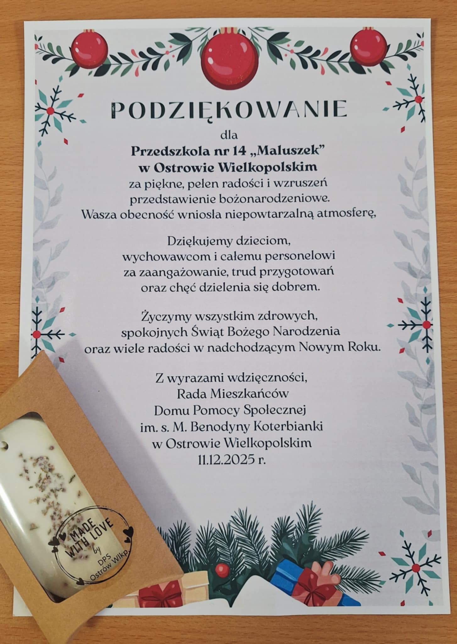 11 grudnia 2025r. grupa Motylki postanowiła umilić czas podopiecznym Domu Pomocy Społecznej w Ostrowie Wielkopolskim przy ul. Staroprzygodzkiej i wybrała się z niespodzianką z okazji zbliżających się Świąt Bożego Narodzenia. Wraz z wychowawcami grupy Panią Anetą i Panią Anią oraz dyrekcją naszego przedszkola wybraliśmy się z występem o tematyce świątecznej oraz upominkami dla pensjonariuszy.