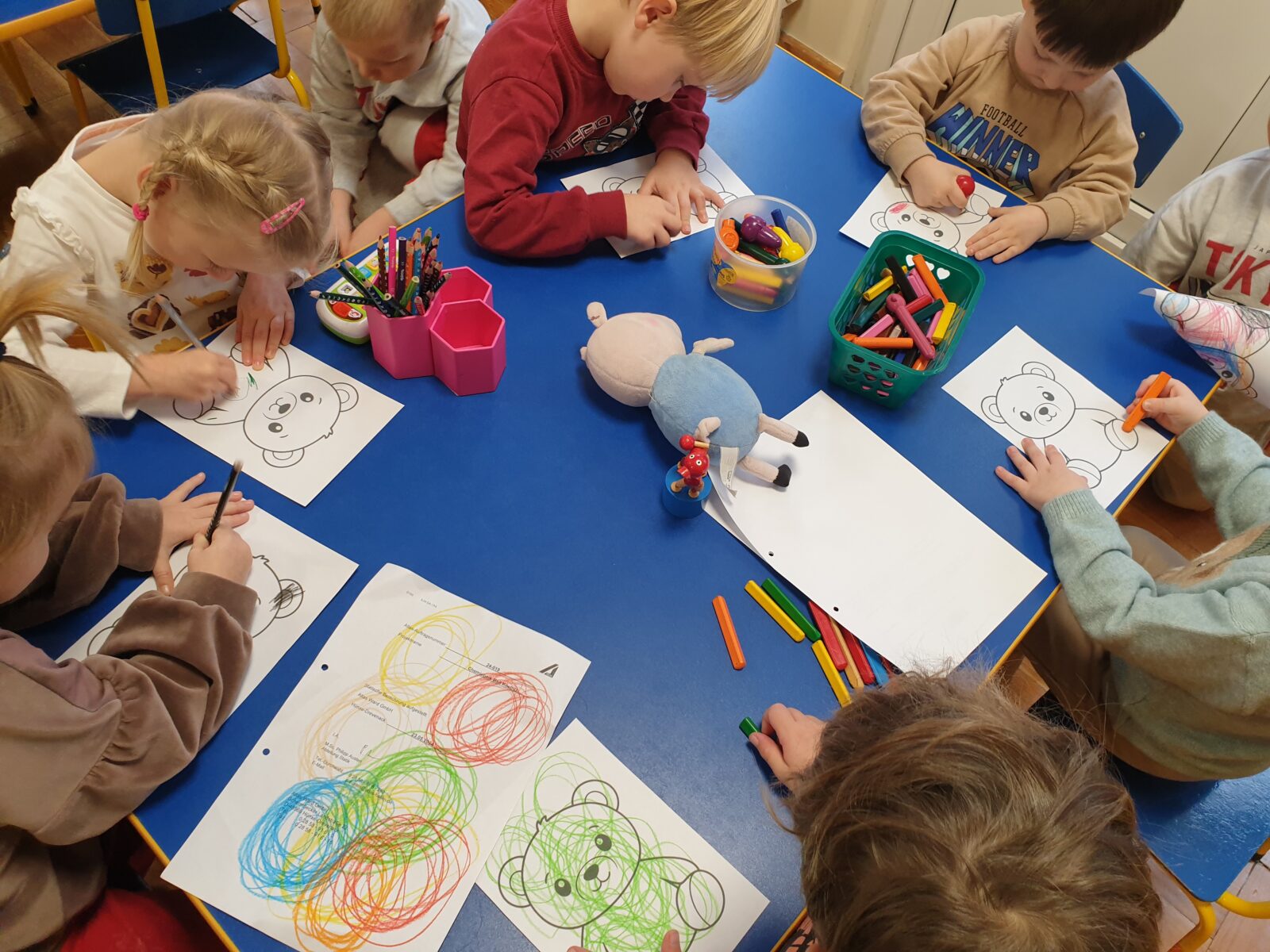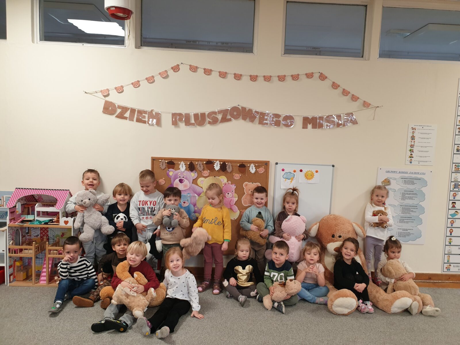 25 listopada w grupie Mróweczki obchodziliśmy Dzień Pluszowego Misia – wyjątkowe święto naszych ulubionych pluszowych przyjaciół. Dzieci przyszły wraz ze swoimi pluszowymi przyjaciółmi, a świętowanie rozpoczęło się od prezentacji misiów i rozmów o ich cechach. Pluszaki stały się towarzyszami wspólnych zabaw, rymowanek i piosenek o misiowej tematyce. Podczas tego wyjątkowego dnia odbyły się zabawy ruchowe z misiami i zajęcia plastyczne, w których dzieci tworzyły własne prace z motywem misia.