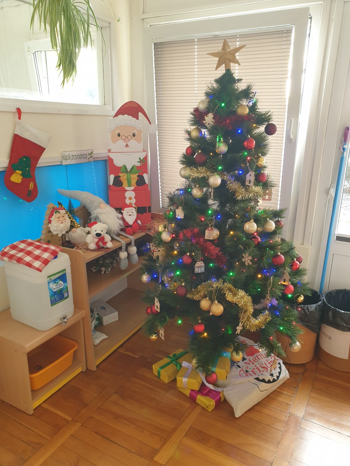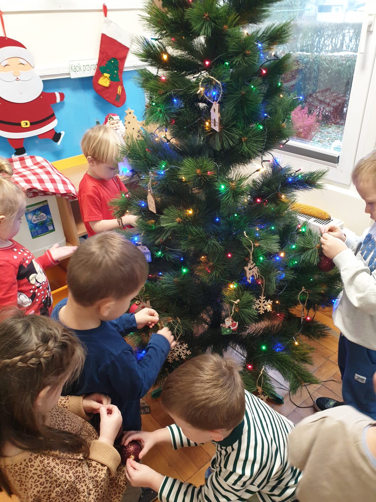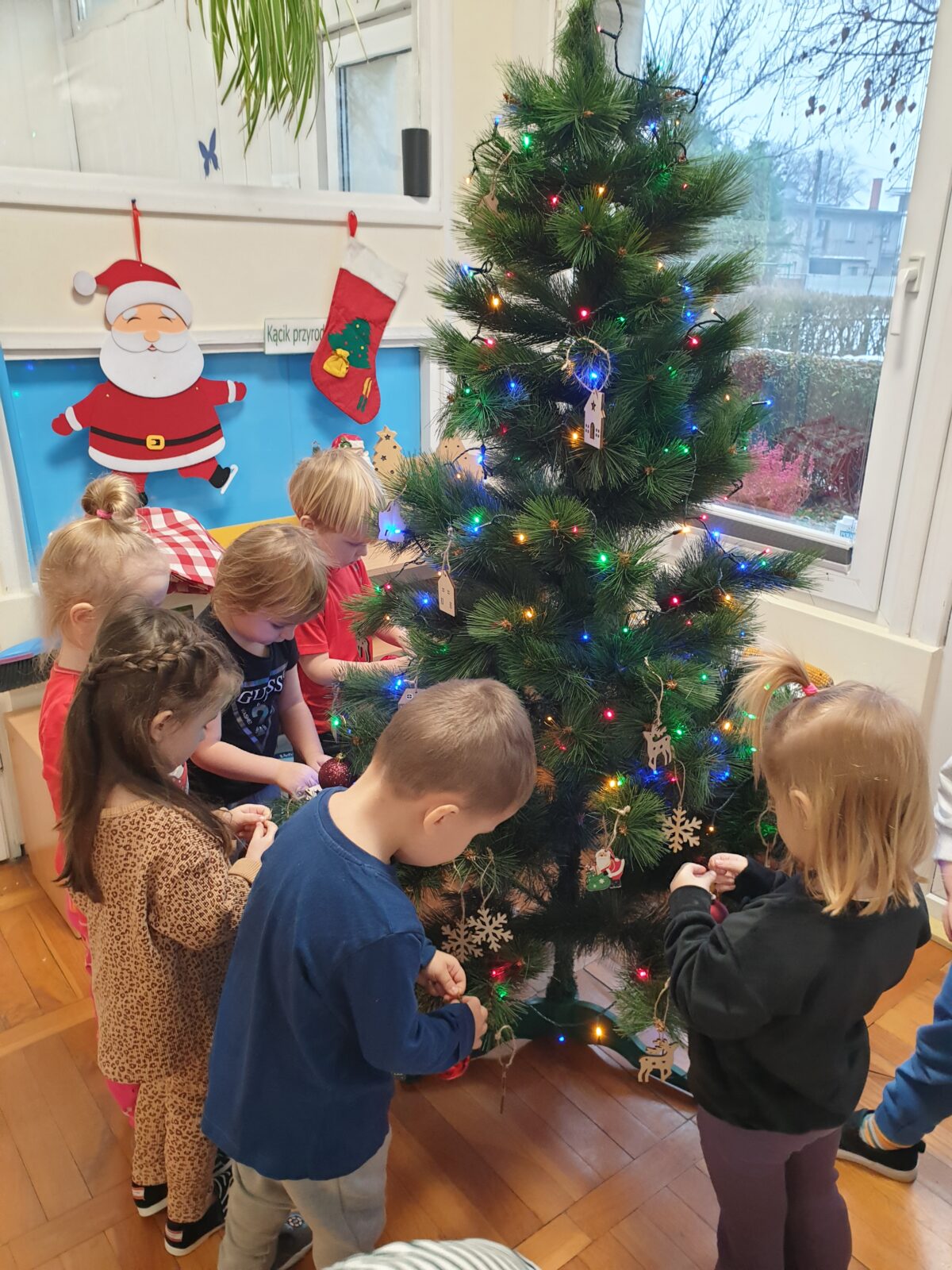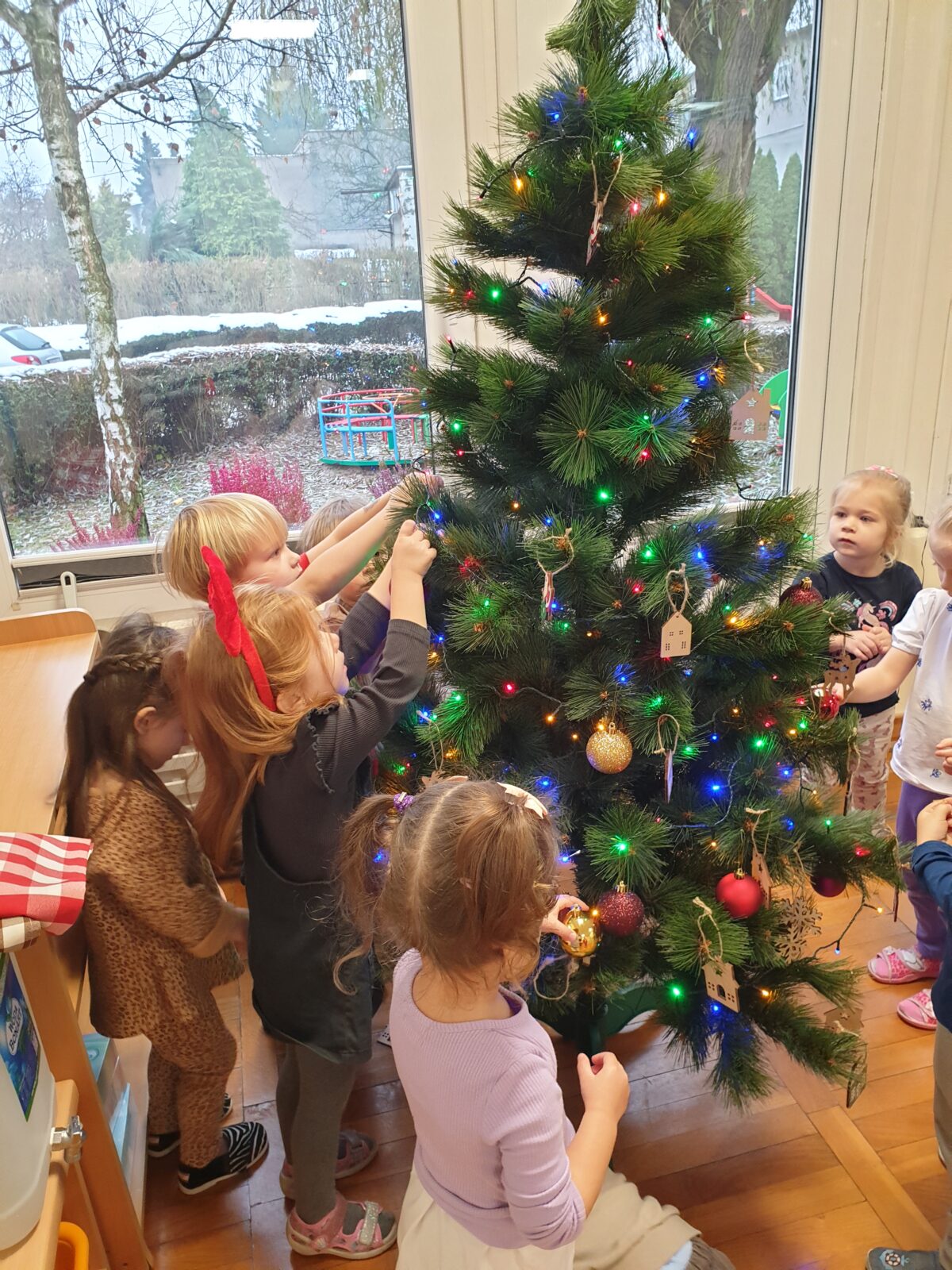 Grupa Mróweczki z radością i zaangażowaniem przystąpiła do dekorowania choinki, która już rozświetlała salę przedszkolną. Dzieci wspólnie zawieszały kolorowe bombki, łańcuchy oraz inne ozdoby. W trakcie pracy panowała miła, świąteczna atmosfera, a uczestniczące przedszkolaki uczyły się współpracy i dzielenia się obowiązkami. Ubieranie choinki stało się dla grupy okazją do rozmów o tradycjach świątecznych oraz wartości wspólnego przygotowywania się do świąt. Dzieci z dumą podziwiały efekt swojej pracy, który wprowadził świąteczny nastrój i wzbudził uśmiechy na wszystkich twarzach, umilając czas spędzany w przedszkolu. Choinka stała się głównym elementem kącika świątecznego, który pełen ozdób umila nam czas w grudniu.
