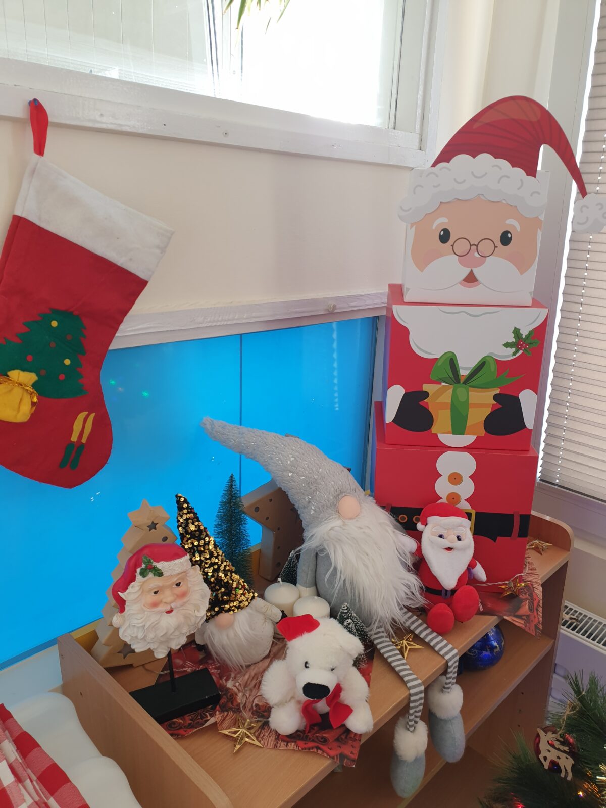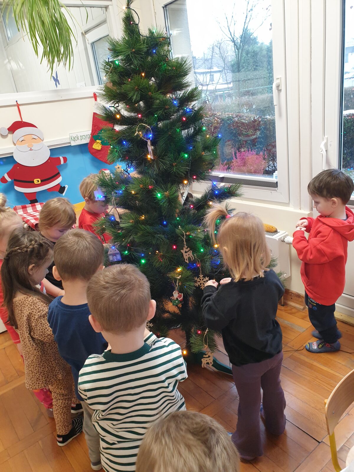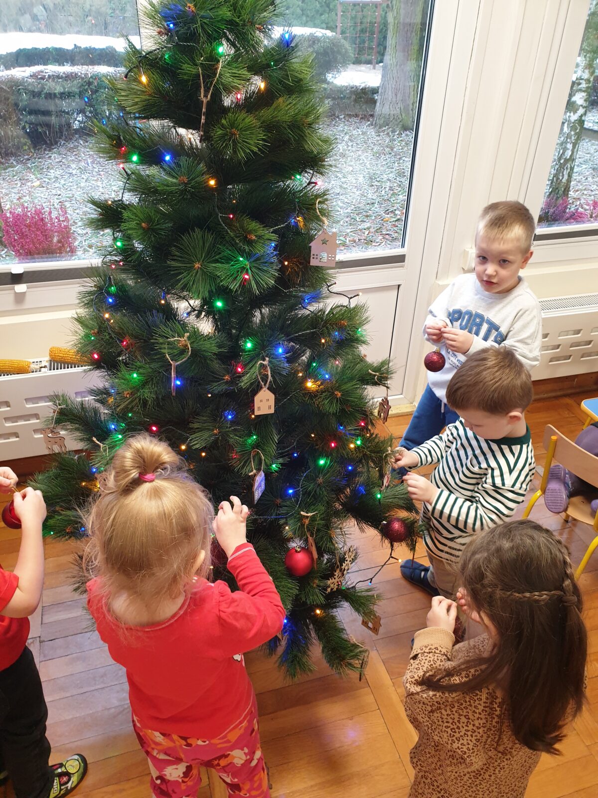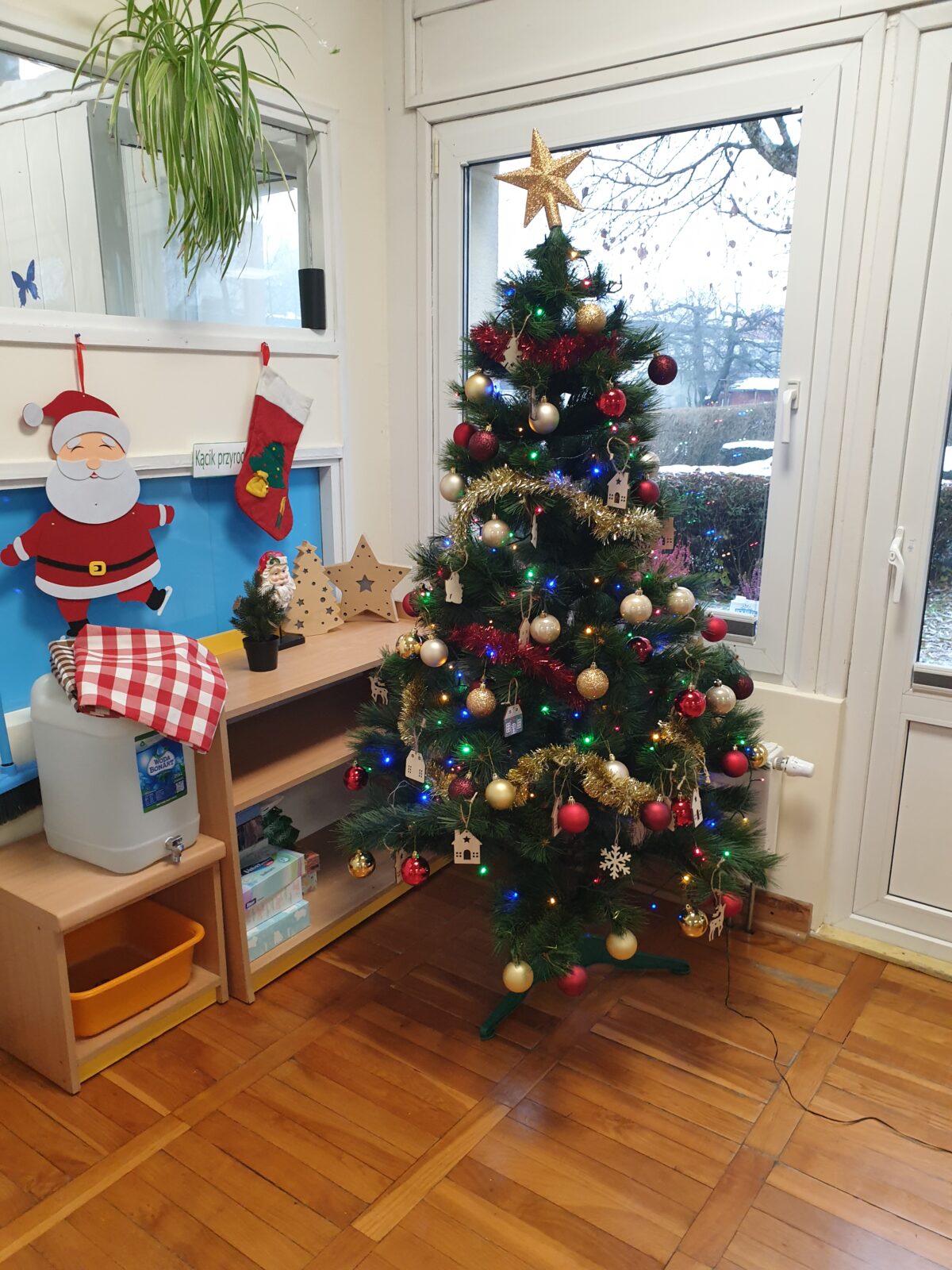 Grupa Mróweczki z radością i zaangażowaniem przystąpiła do dekorowania choinki, która już rozświetlała salę przedszkolną. Dzieci wspólnie zawieszały kolorowe bombki, łańcuchy oraz inne ozdoby. W trakcie pracy panowała miła, świąteczna atmosfera, a uczestniczące przedszkolaki uczyły się współpracy i dzielenia się obowiązkami. Ubieranie choinki stało się dla grupy okazją do rozmów o tradycjach świątecznych oraz wartości wspólnego przygotowywania się do świąt. Dzieci z dumą podziwiały efekt swojej pracy, który wprowadził świąteczny nastrój i wzbudził uśmiechy na wszystkich twarzach, umilając czas spędzany w przedszkolu. Choinka stała się głównym elementem kącika świątecznego, który pełen ozdób umila nam czas w grudniu.
