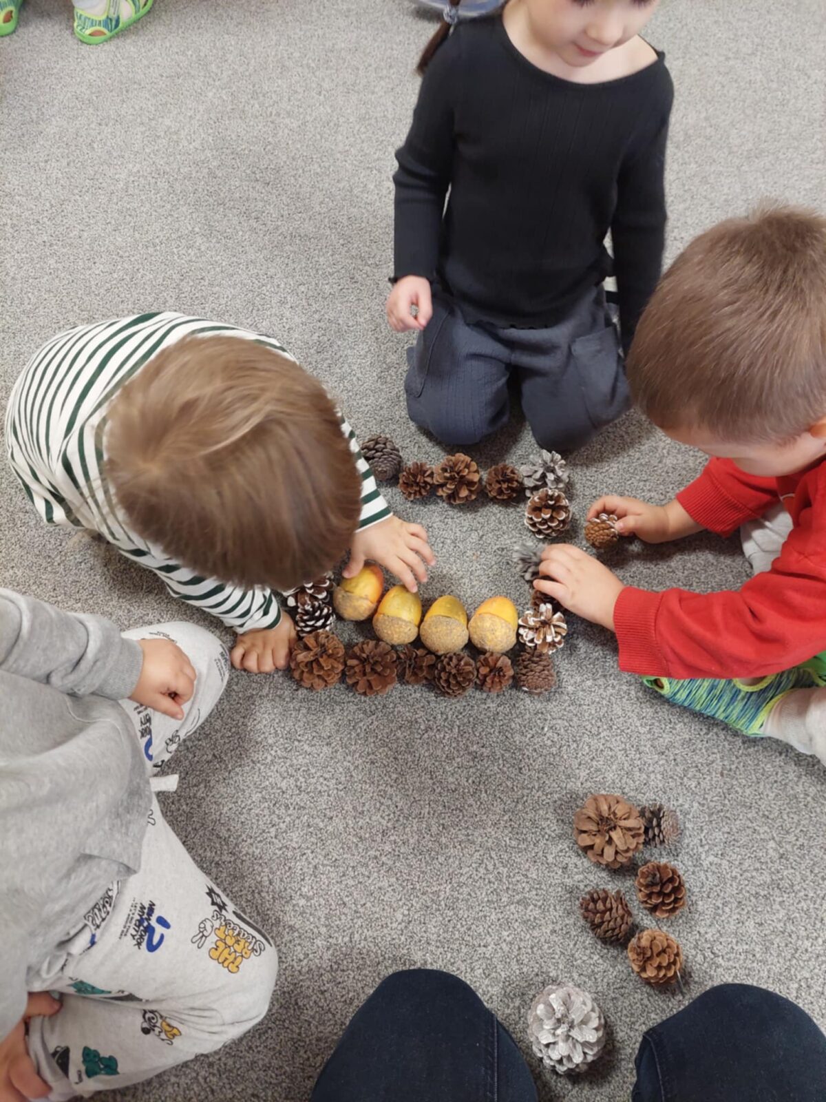W październiku w grupie Mróweczek zrealizowane zostały dwa zadania z projektu edukacyjnego „Matematyka w darach natury ukryta”. Podczas pierwszego zadania, „Naturalne figury”, dzieci, wykorzystując kasztany, szyszki i żołędzie układały różne figury geometryczne – koła, trójkąty i kwadraty. W drugim zadaniu, „Liściowa symetria”, dzieci obserwowały kształty liści i porównywały ich strony, dostrzegając zjawisko symetrii w przyrodzie, następnie wykonały pracę plastyczną.