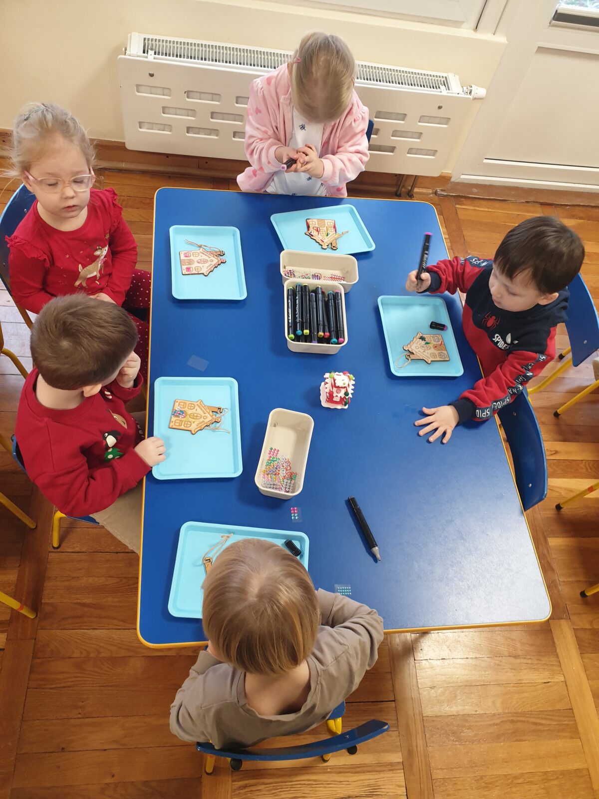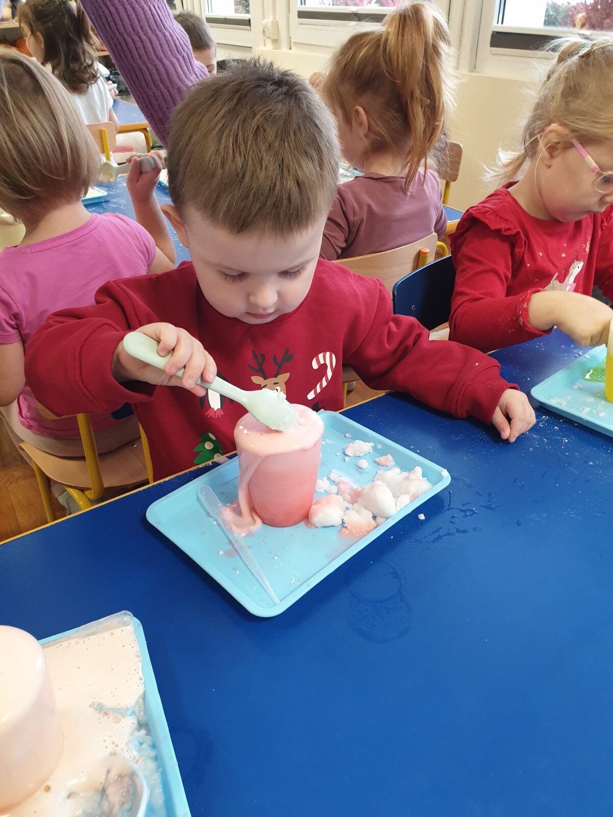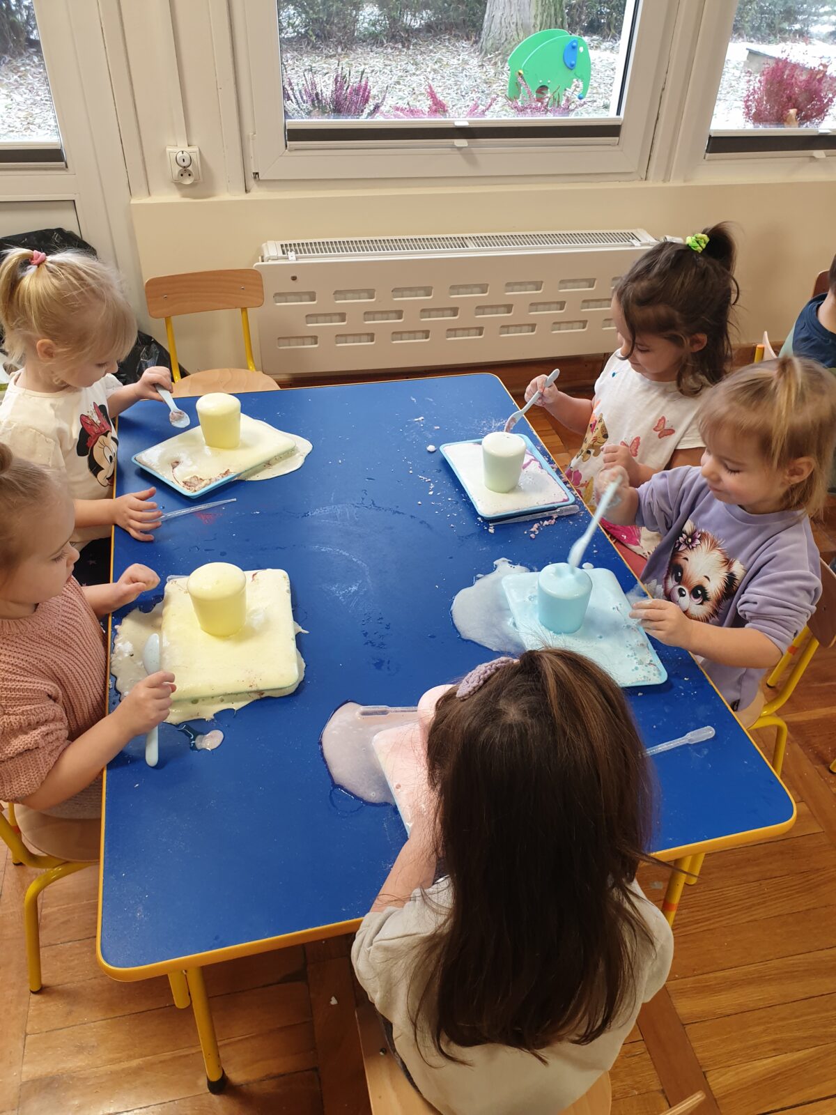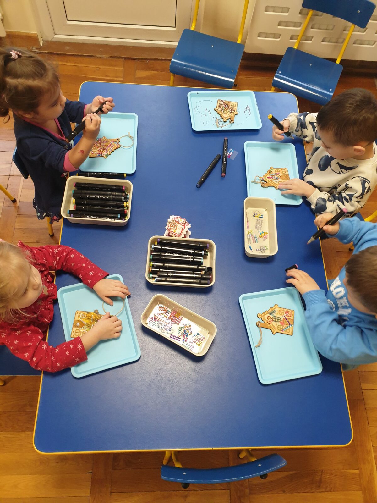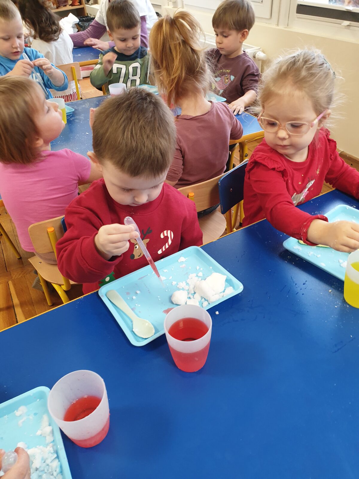 1 grudnia w grupie Mróweczki odbyły się świąteczne warsztaty plastyczne, wprowadzające dzieci w magię nadchodzących świąt Bożego Narodzenia. Przedszkolaki z wielkim zaangażowaniem ozdabiały zawieszki na choinkę, według własnych pomysłów. Następnie dzieci przygotowały sztuczny śnieg z bezpiecznych składników, lepiąc z niego urocze bałwany, co dostarczyło mnóstwo radości. Na zakończenie wykonano efektowny „wulkan”, a obserwacja kolorowej „erupcji” stała się niezapomnianą atrakcją edukacyjną.