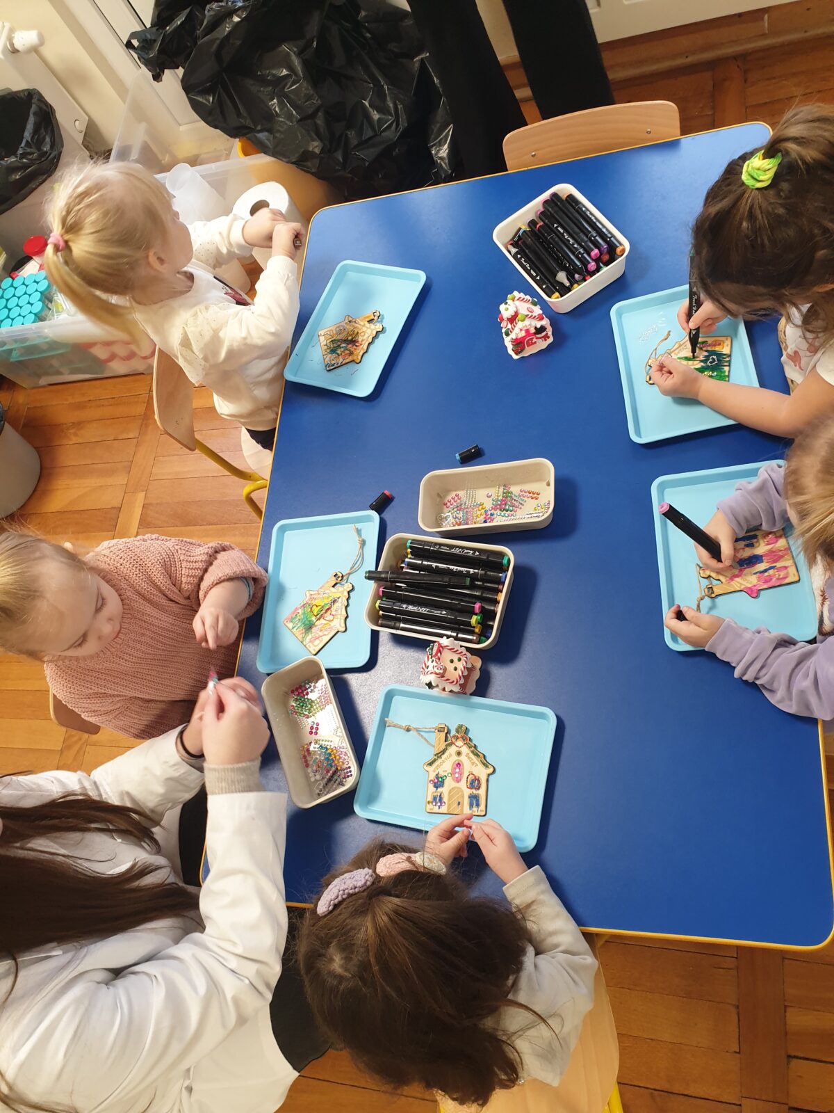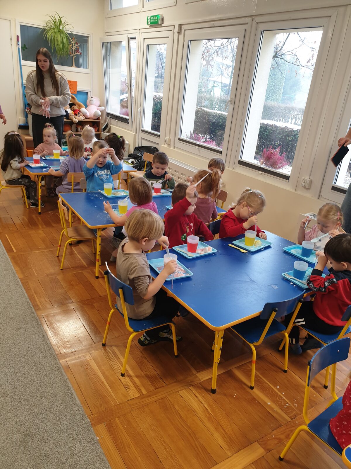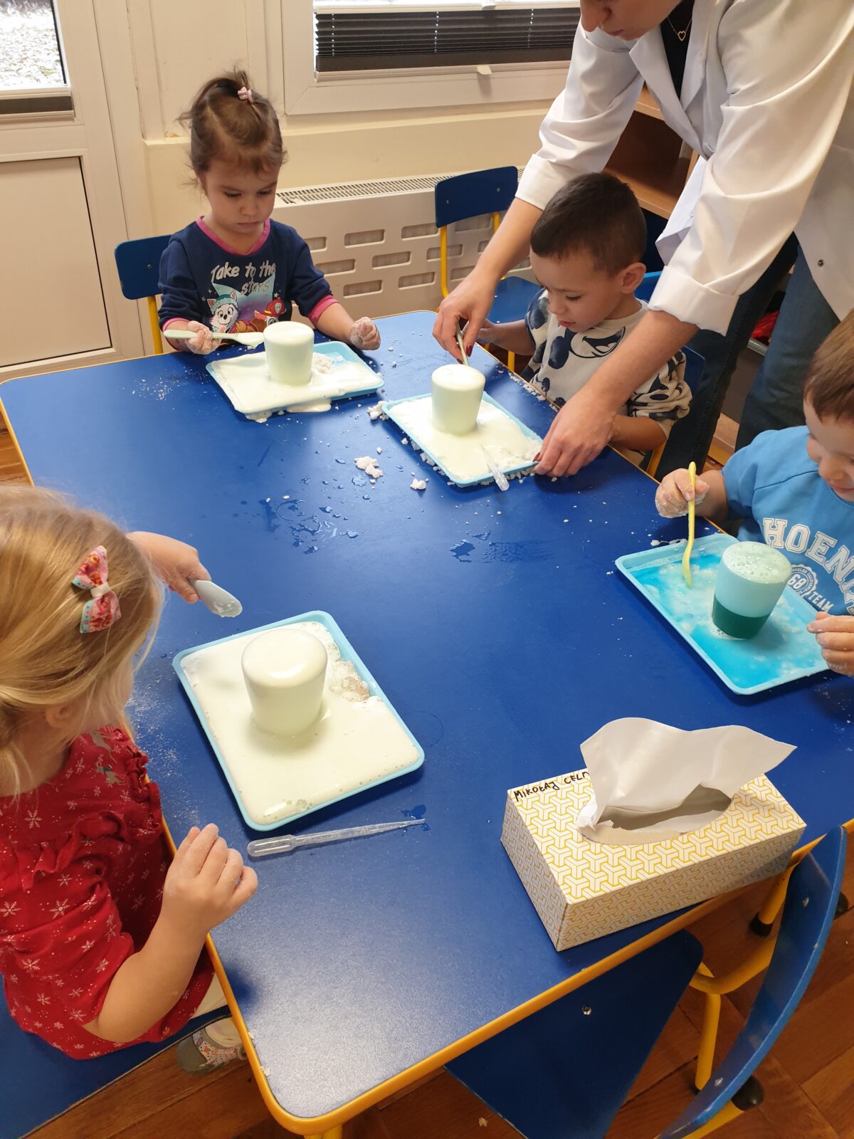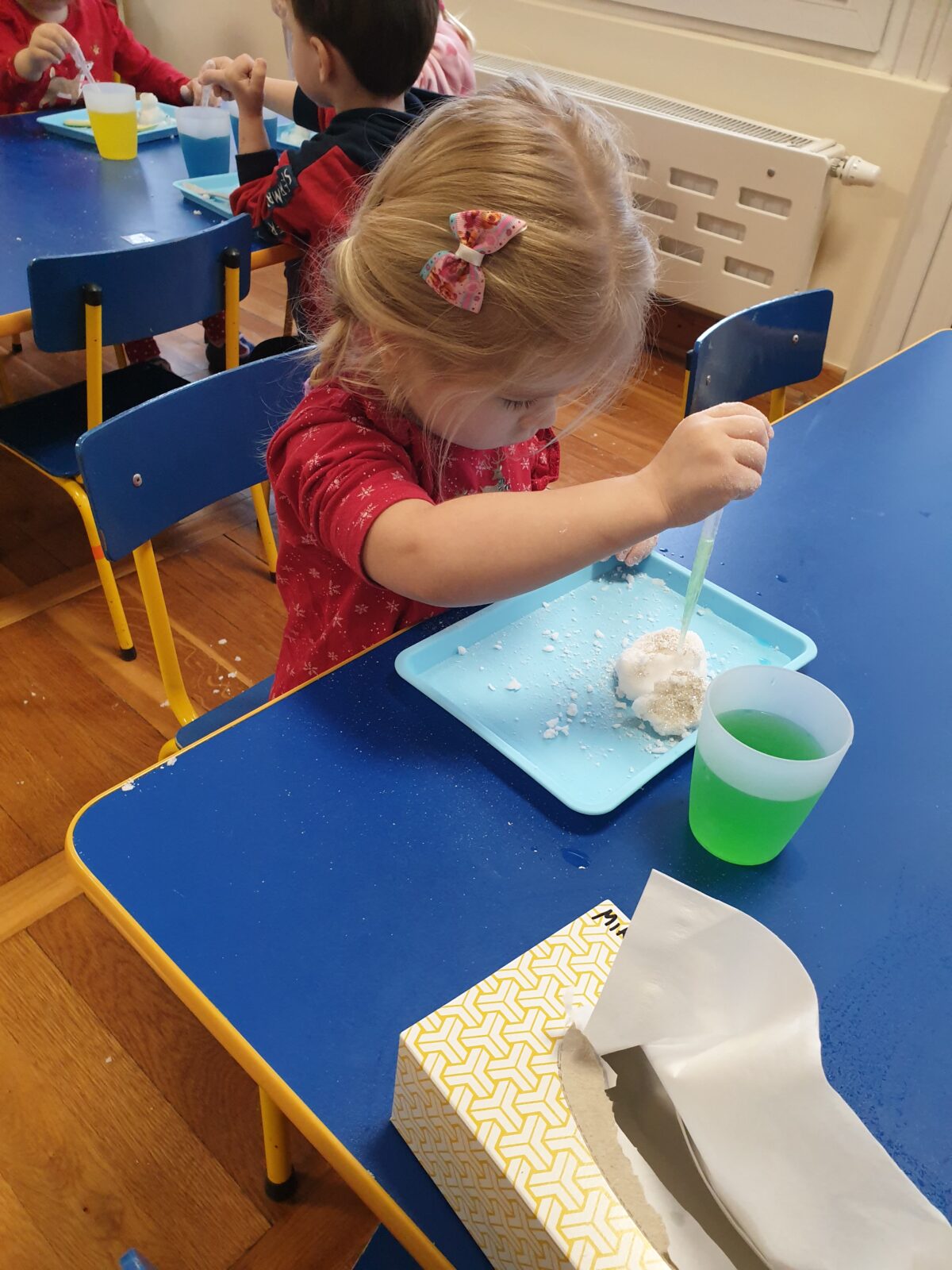 1 grudnia w grupie Mróweczki odbyły się świąteczne warsztaty plastyczne, wprowadzające dzieci w magię nadchodzących świąt Bożego Narodzenia. Przedszkolaki z wielkim zaangażowaniem ozdabiały zawieszki na choinkę, według własnych pomysłów. Następnie dzieci przygotowały sztuczny śnieg z bezpiecznych składników, lepiąc z niego urocze bałwany, co dostarczyło mnóstwo radości. Na zakończenie wykonano efektowny „wulkan”, a obserwacja kolorowej „erupcji” stała się niezapomnianą atrakcją edukacyjną.
