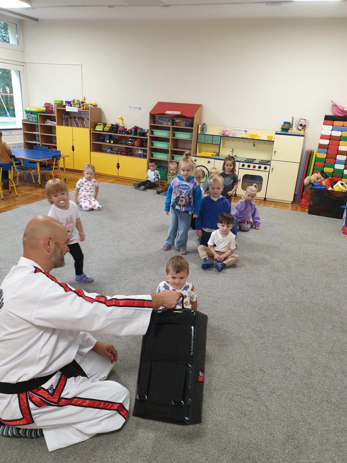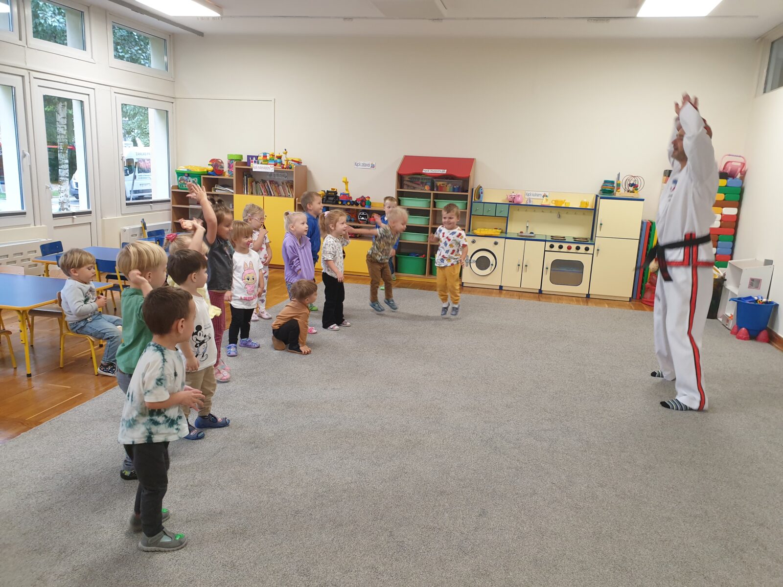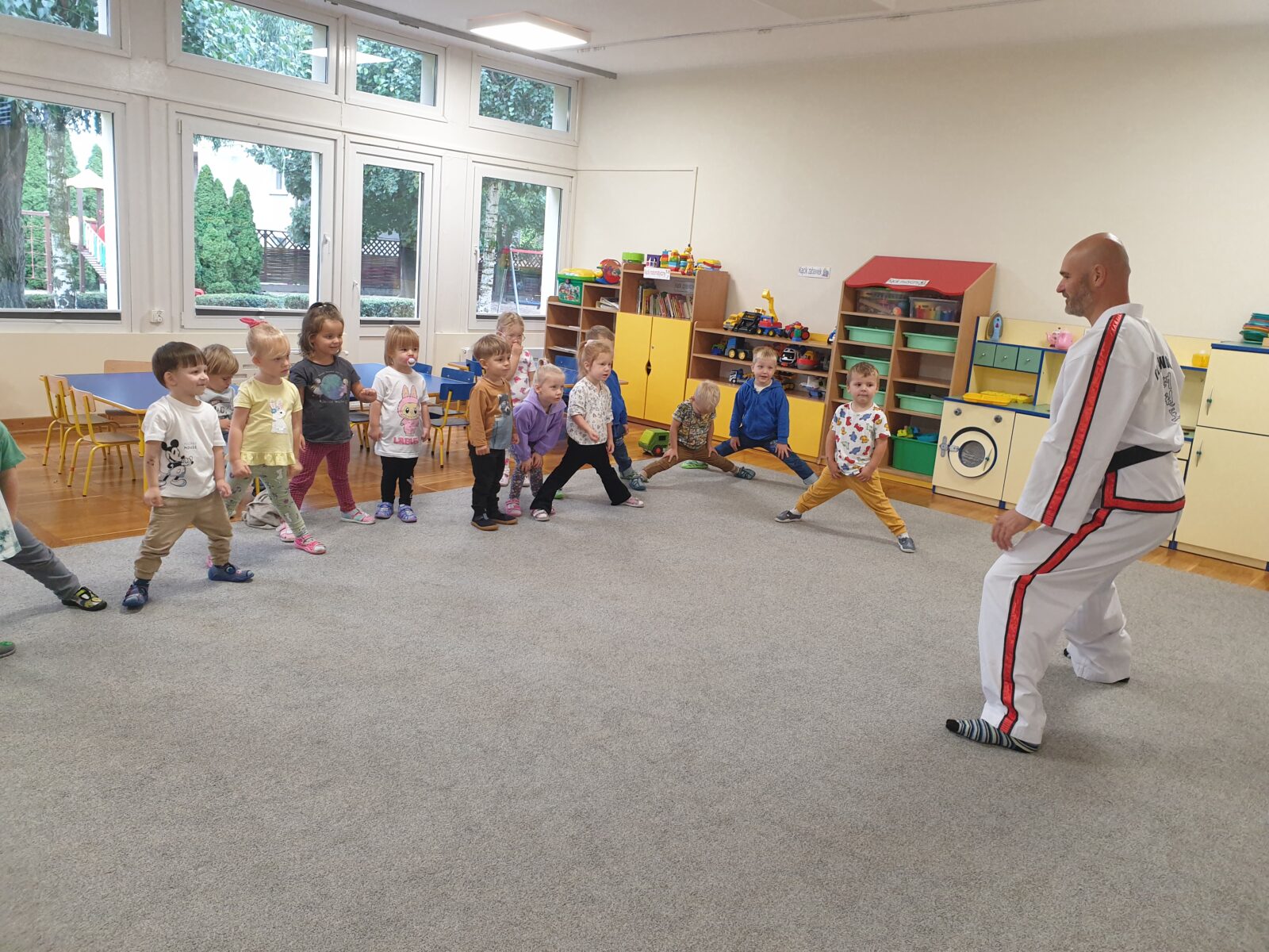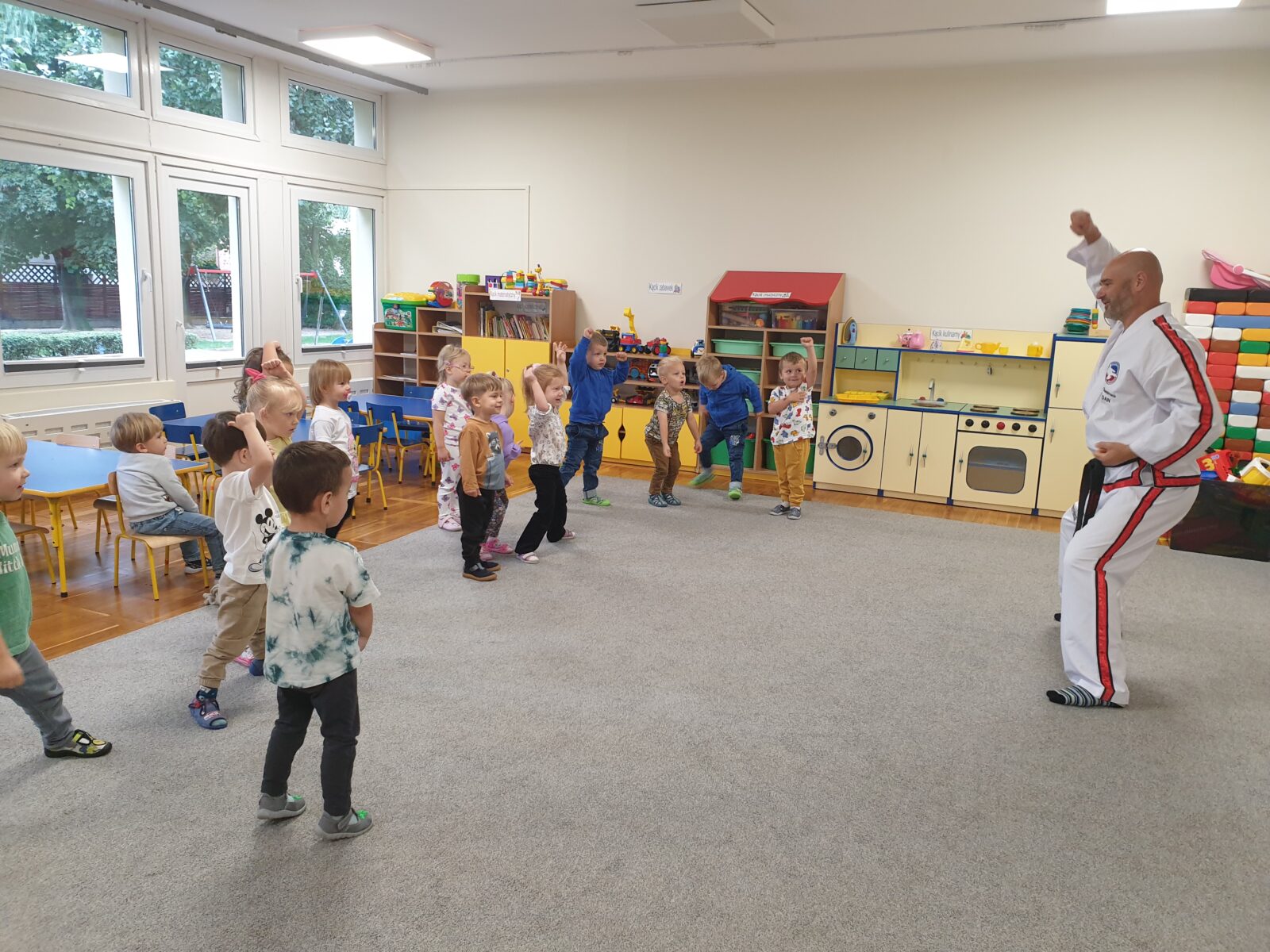 W grupie „Mróweczek” 23 września odbyły się zajęcia pokazowe z taekwon-do. Instruktor zaprezentował podstawowe elementy tej sztuki walki, a następnie poprowadził z dziećmi proste ćwiczenia ruchowe i wesołe zabawy. Przedszkolaki z zaangażowaniem i radością uczestniczyły w aktywnościach, rozwijając sprawność fizyczną i koordynację ruchową.