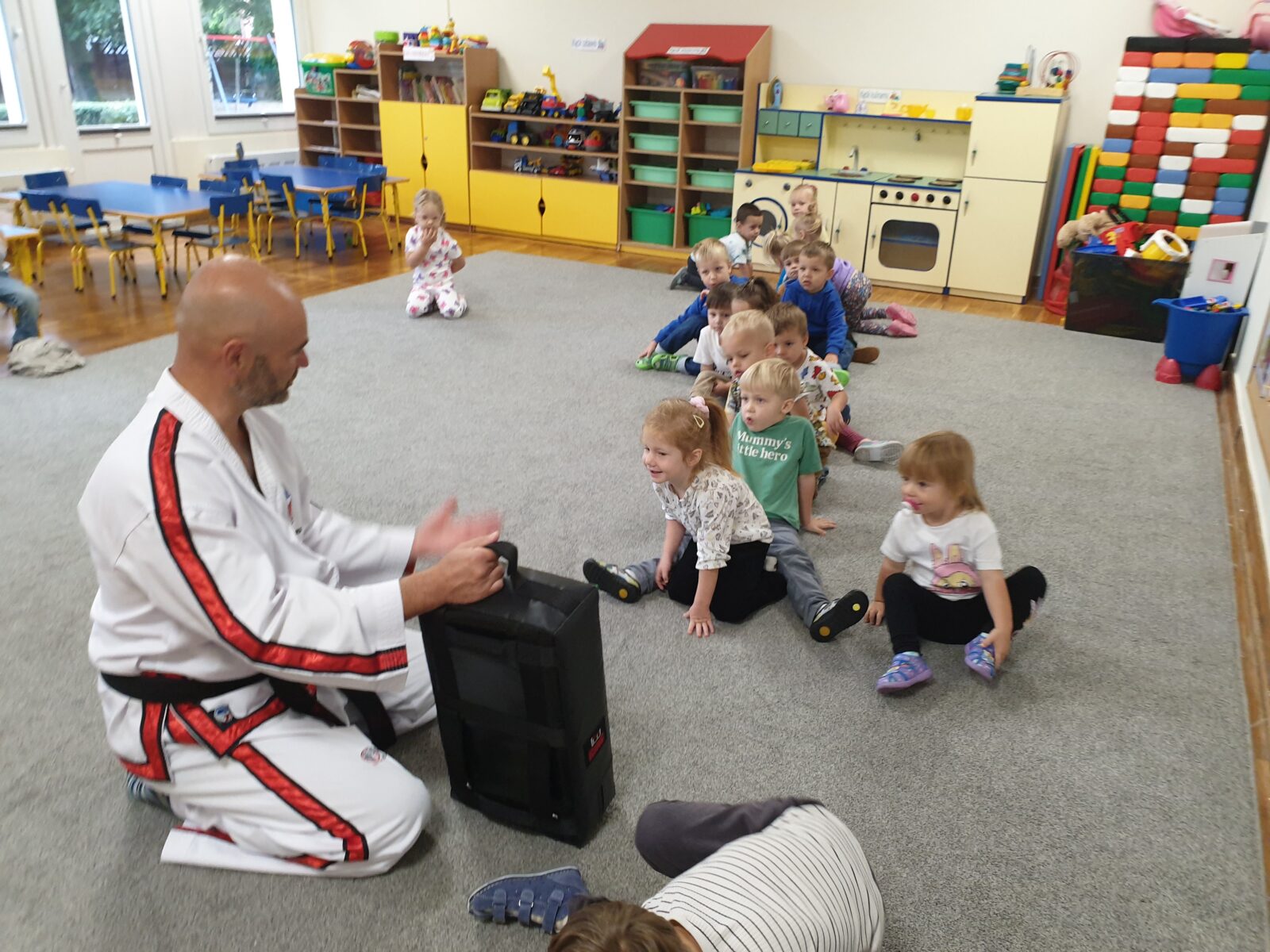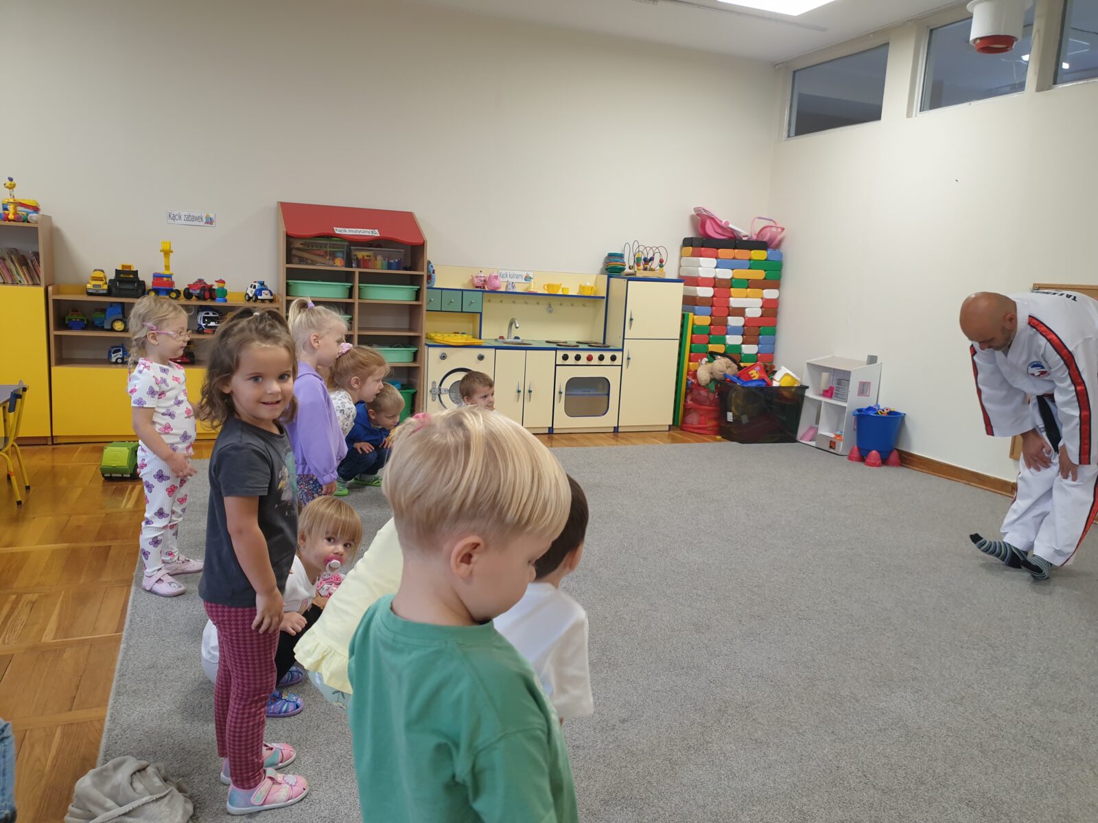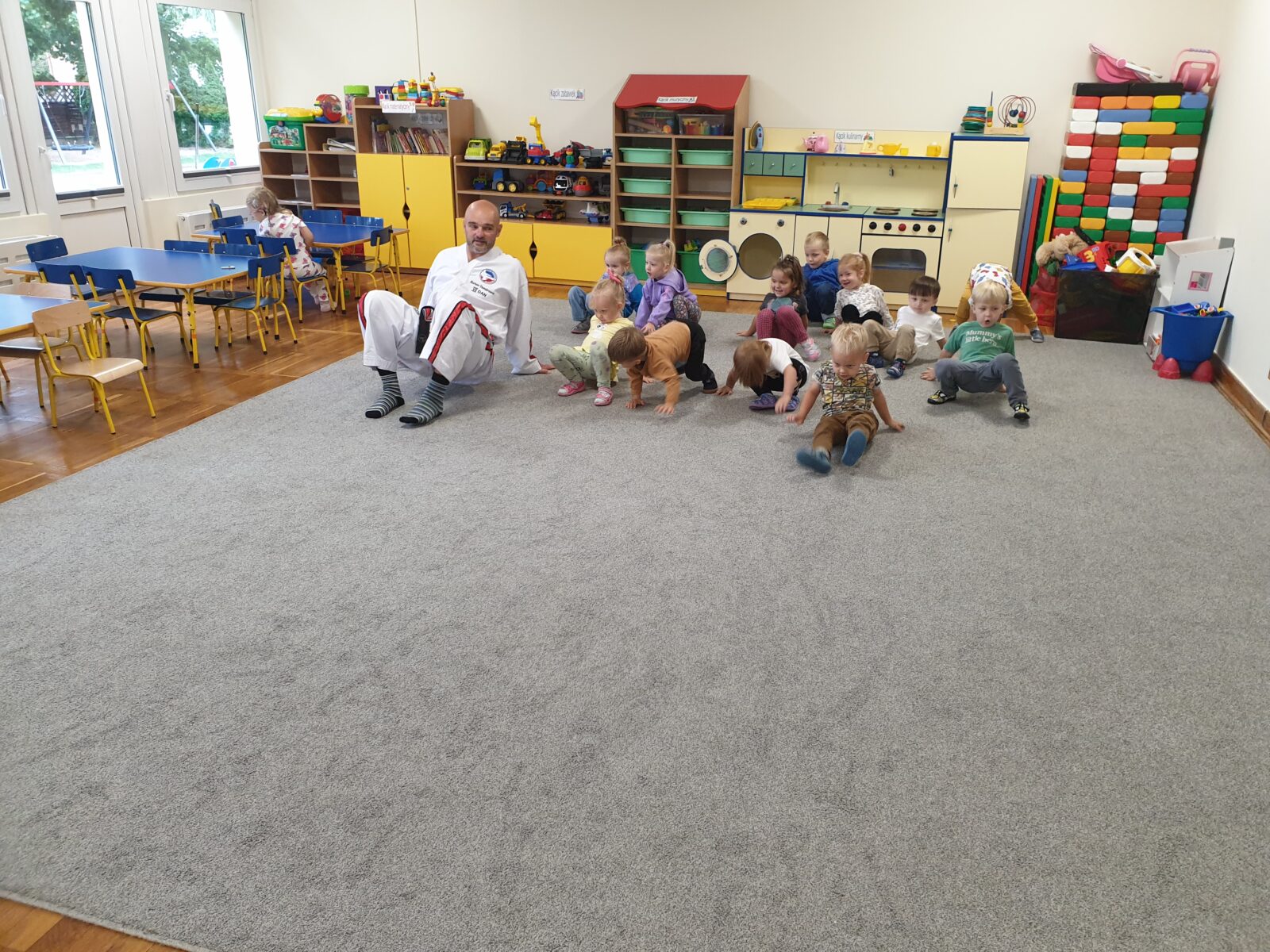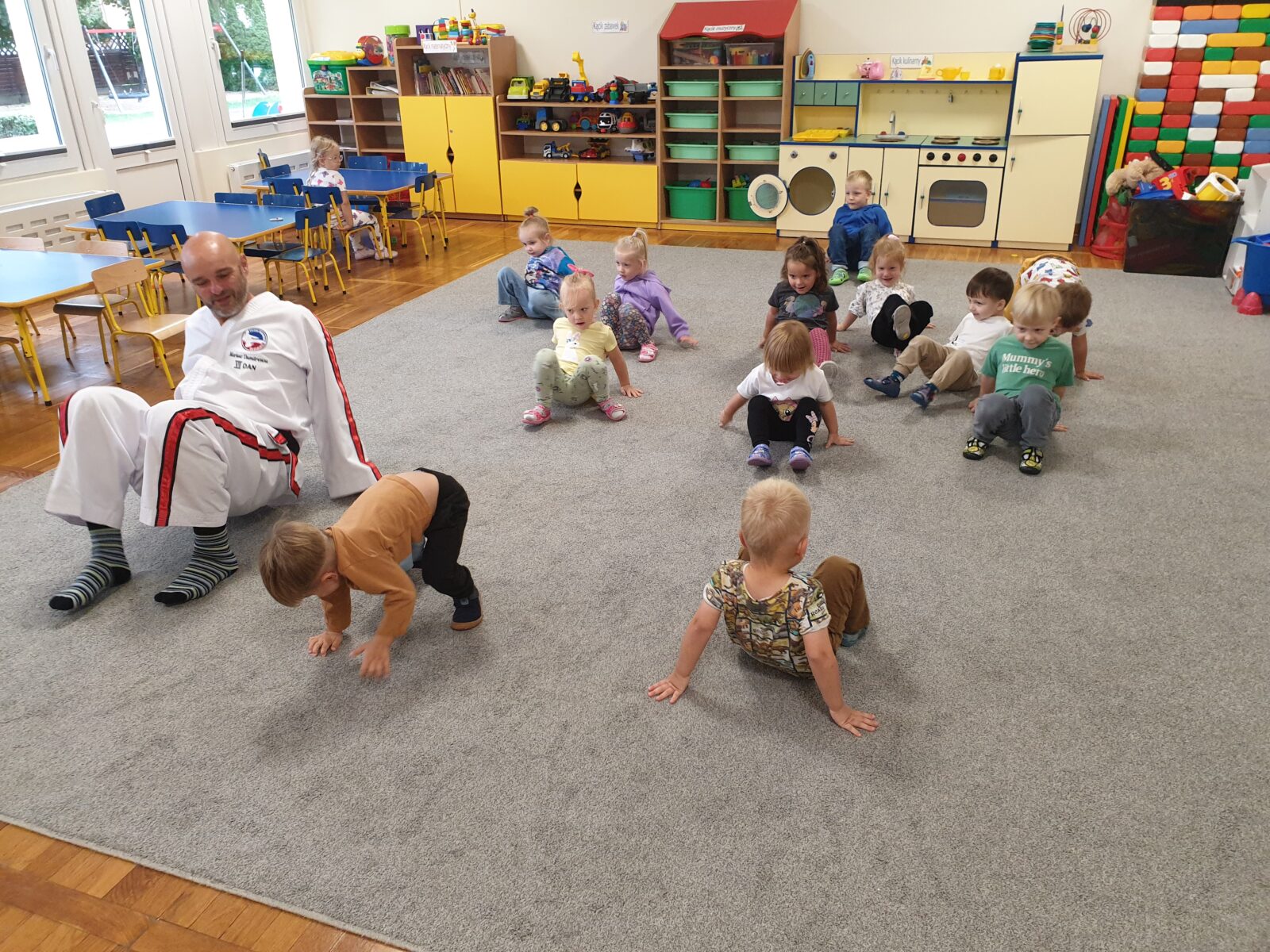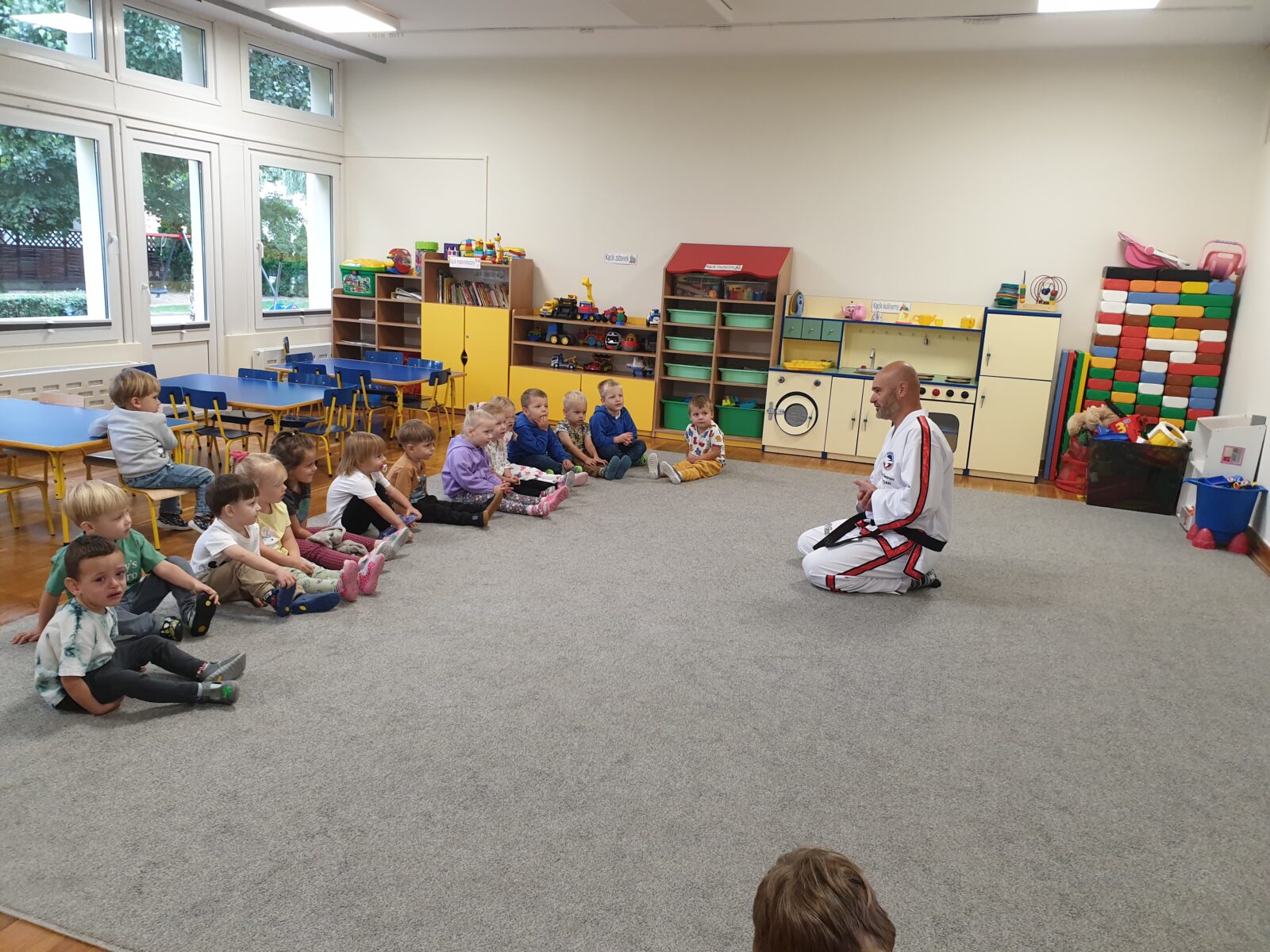 W grupie „Mróweczek” 23 września odbyły się zajęcia pokazowe z taekwon-do. Instruktor zaprezentował podstawowe elementy tej sztuki walki, a następnie poprowadził z dziećmi proste ćwiczenia ruchowe i wesołe zabawy. Przedszkolaki z zaangażowaniem i radością uczestniczyły w aktywnościach, rozwijając sprawność fizyczną i koordynację ruchową.