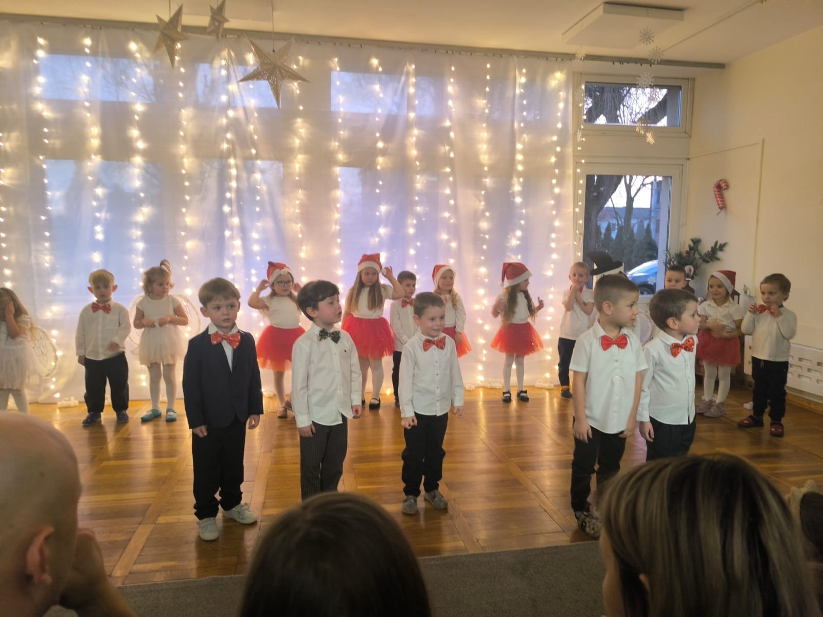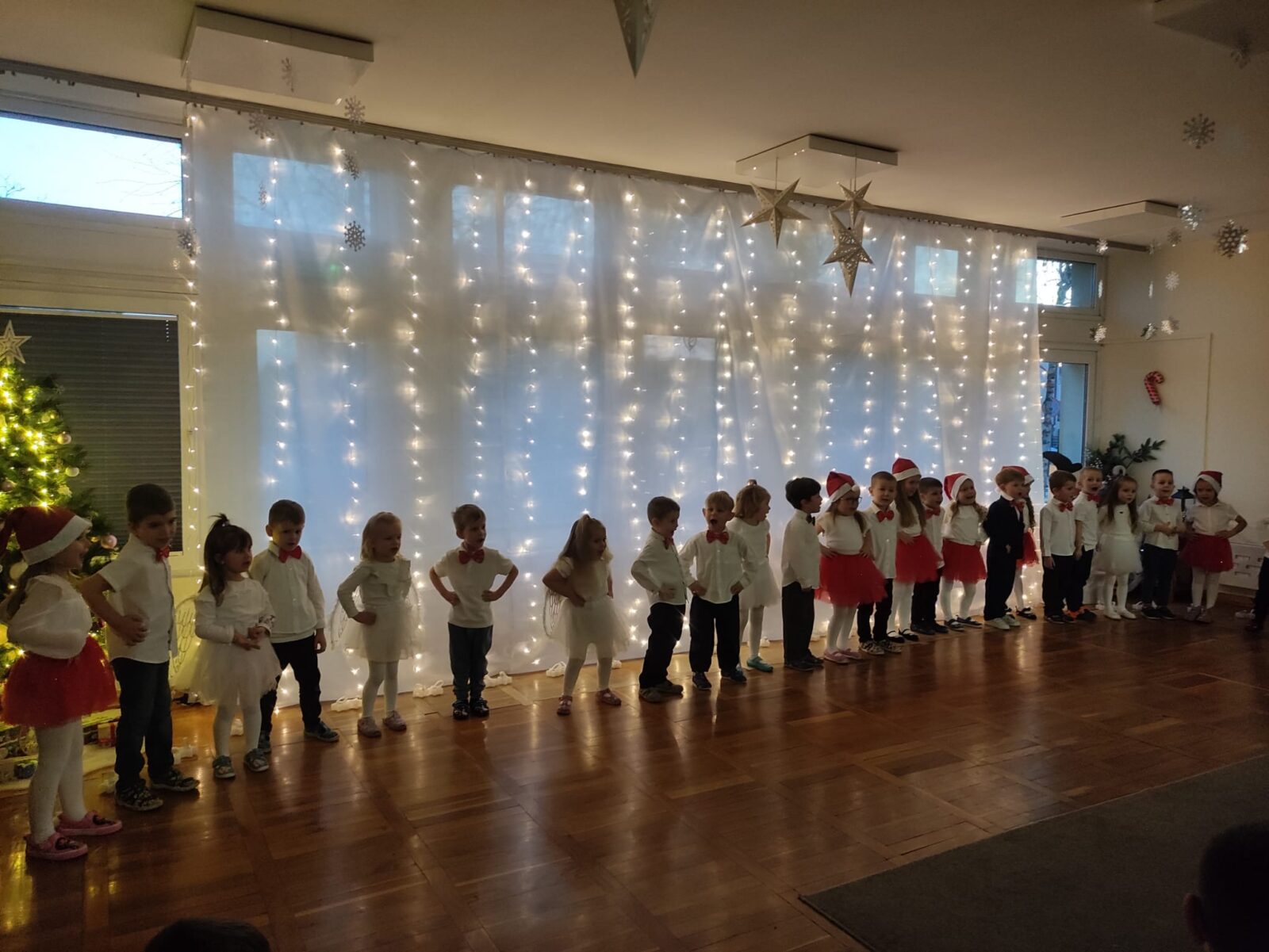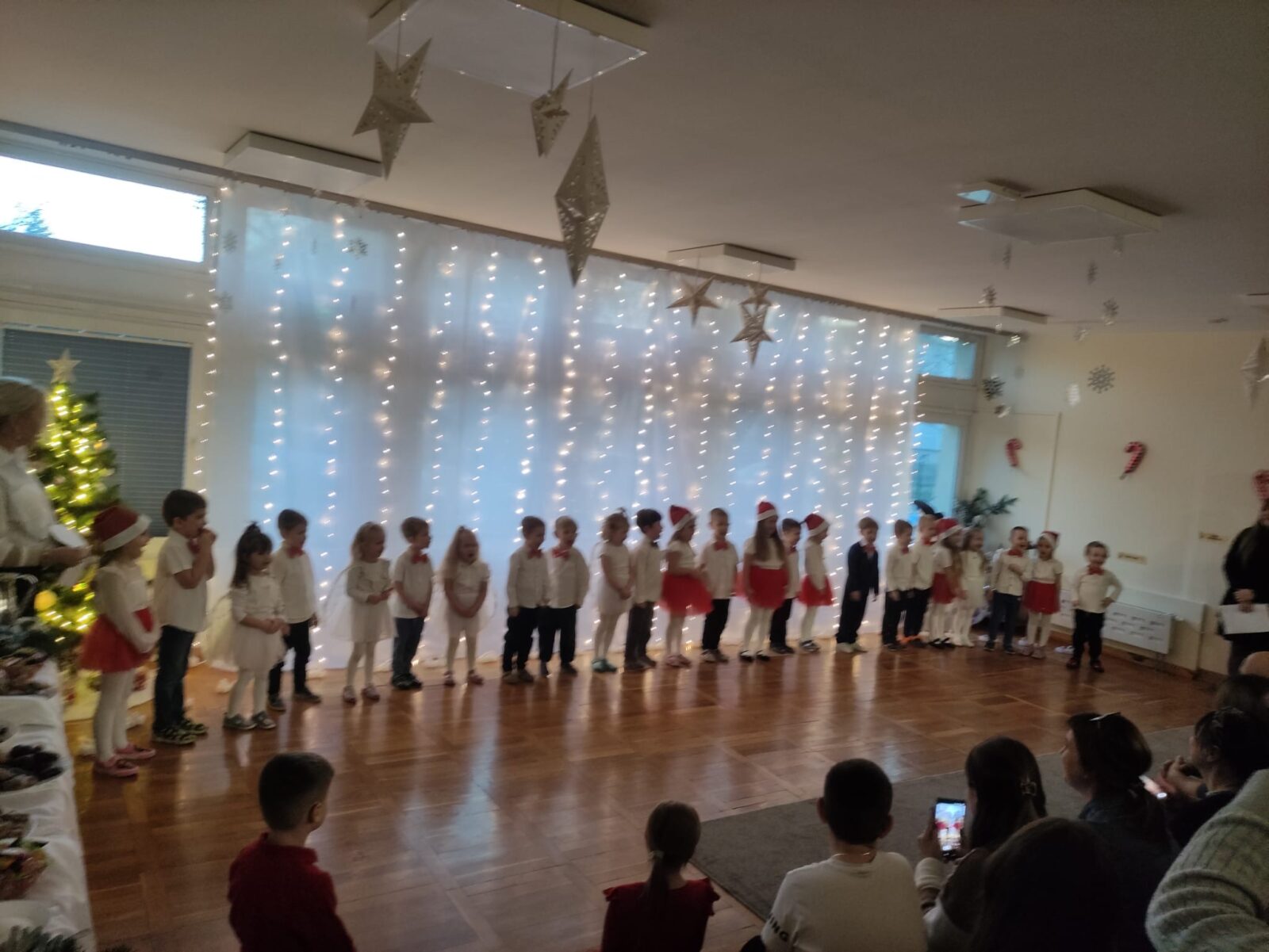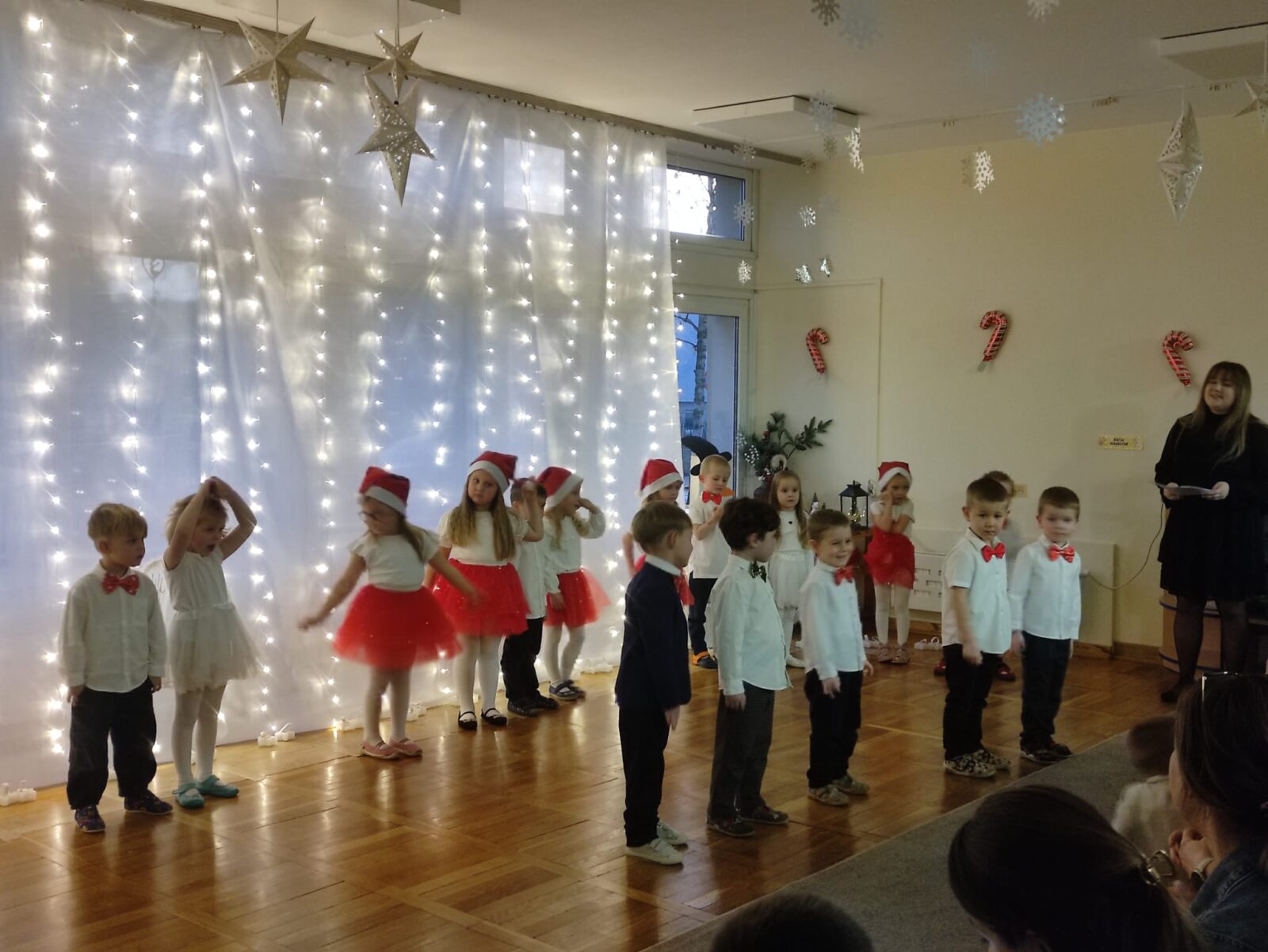 W dniu 16 grudnia 2025 roku odbyło się przedstawienie świąteczne dla rodziców dzieci z grupy Pszczółki. W trakcie przedstawienia dzieci zaprezentowały swoje umiejętności wokalne, recytatorskie i taneczne. Nasze spotkanie przebiegło w bardzo miłej, świątecznej atmosferze, a rodzice z dziećmi mogli pogłębiać rodzinne więzi i spędzić razem piękny, magiczny przedświąteczny czas w blasku choinki.