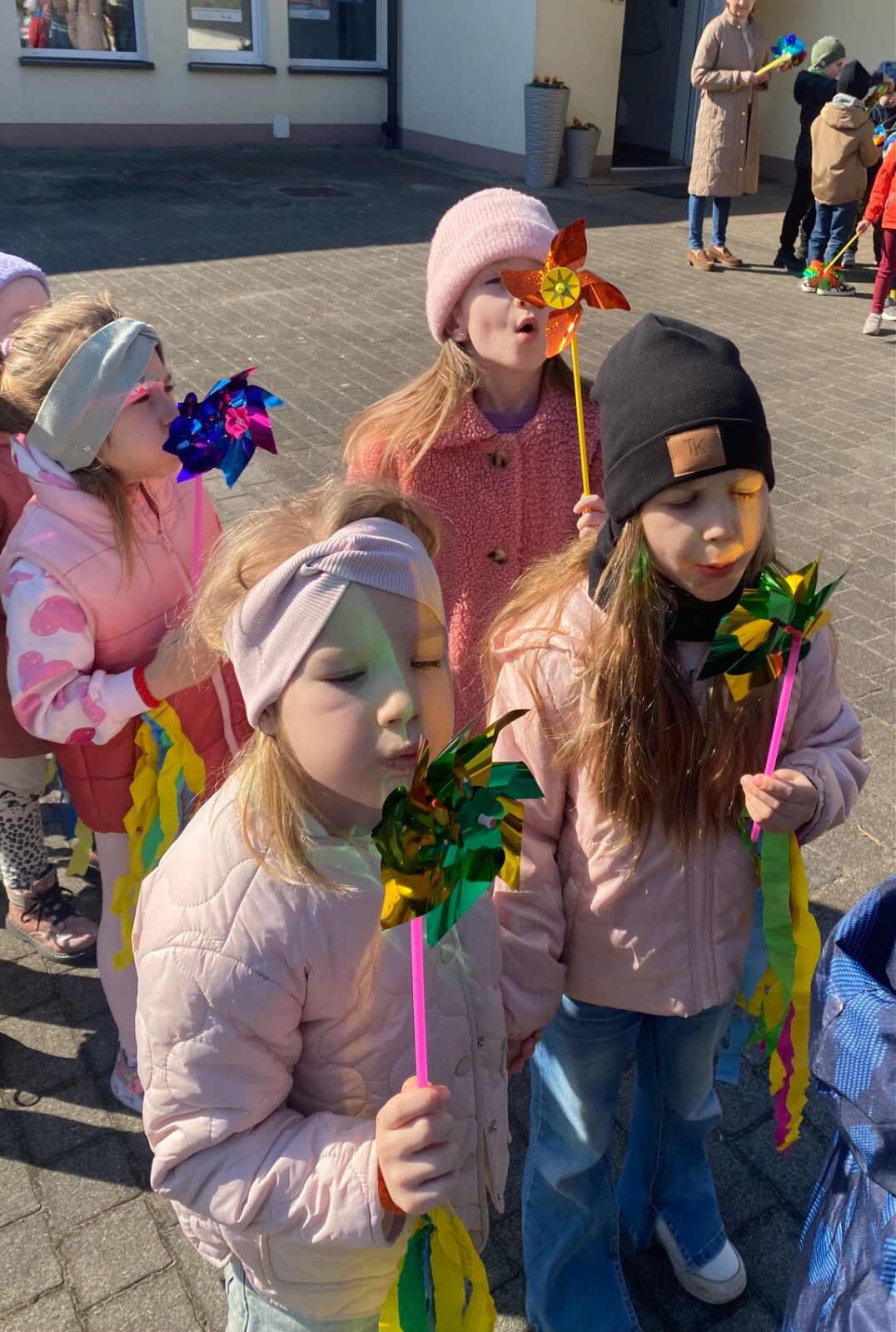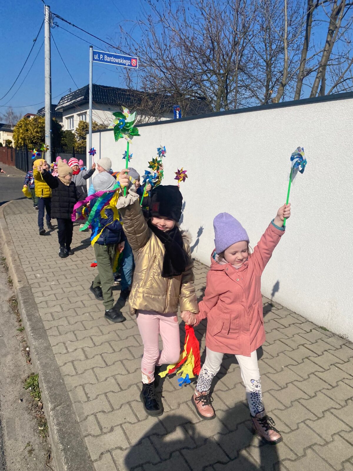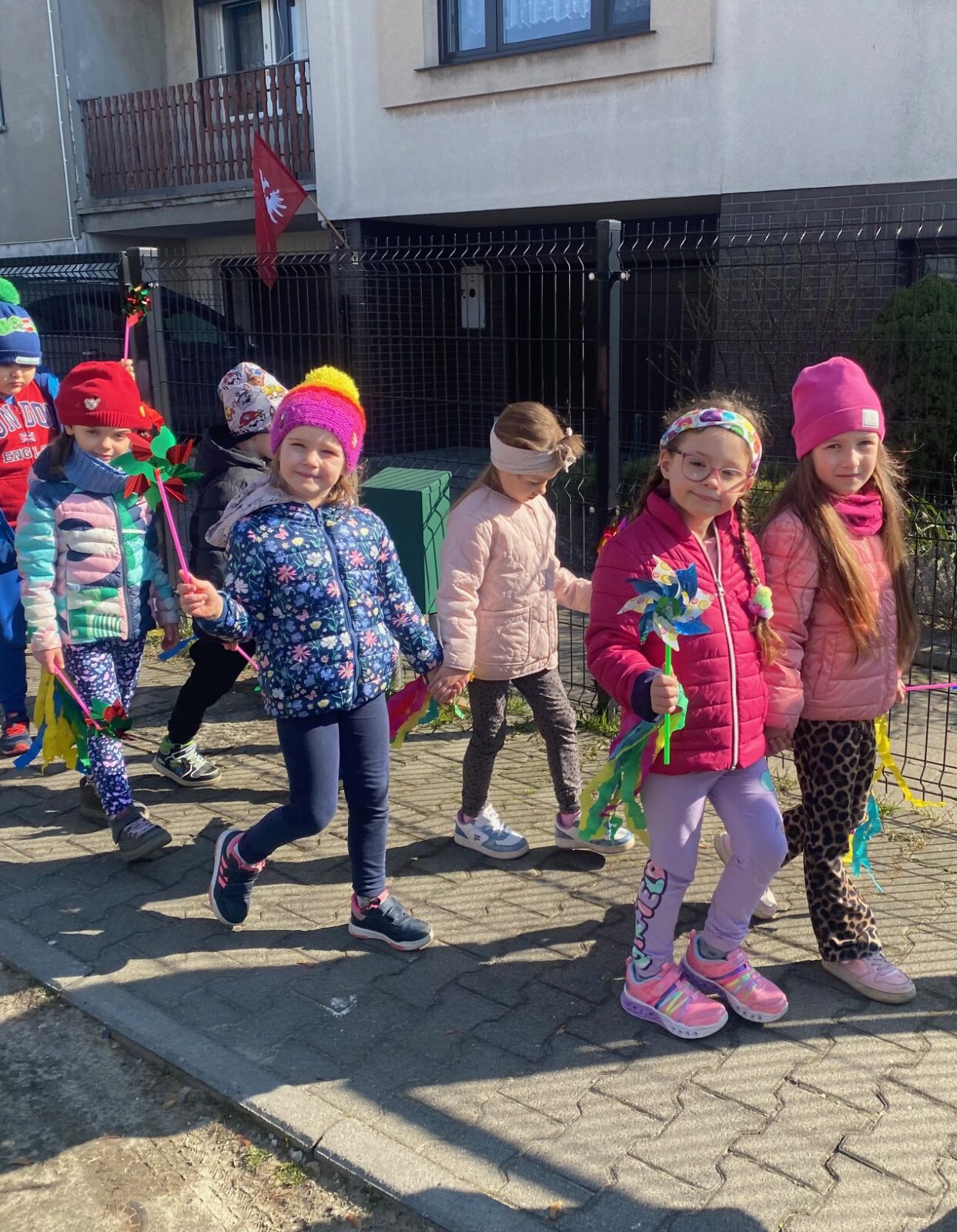 Ubrane w barwne stroje, z wiatraczkami i wiosennymi ozdobami w dłoniach, maszerowały z uśmiechami na twarzach, ciesząc się piękną pogodą i budzącą się do życia przyrodą. Spacer był nie tylko radosnym powitaniem nowej pory roku, ale też świetną okazją do wspólnej zabawy i integracji grup.