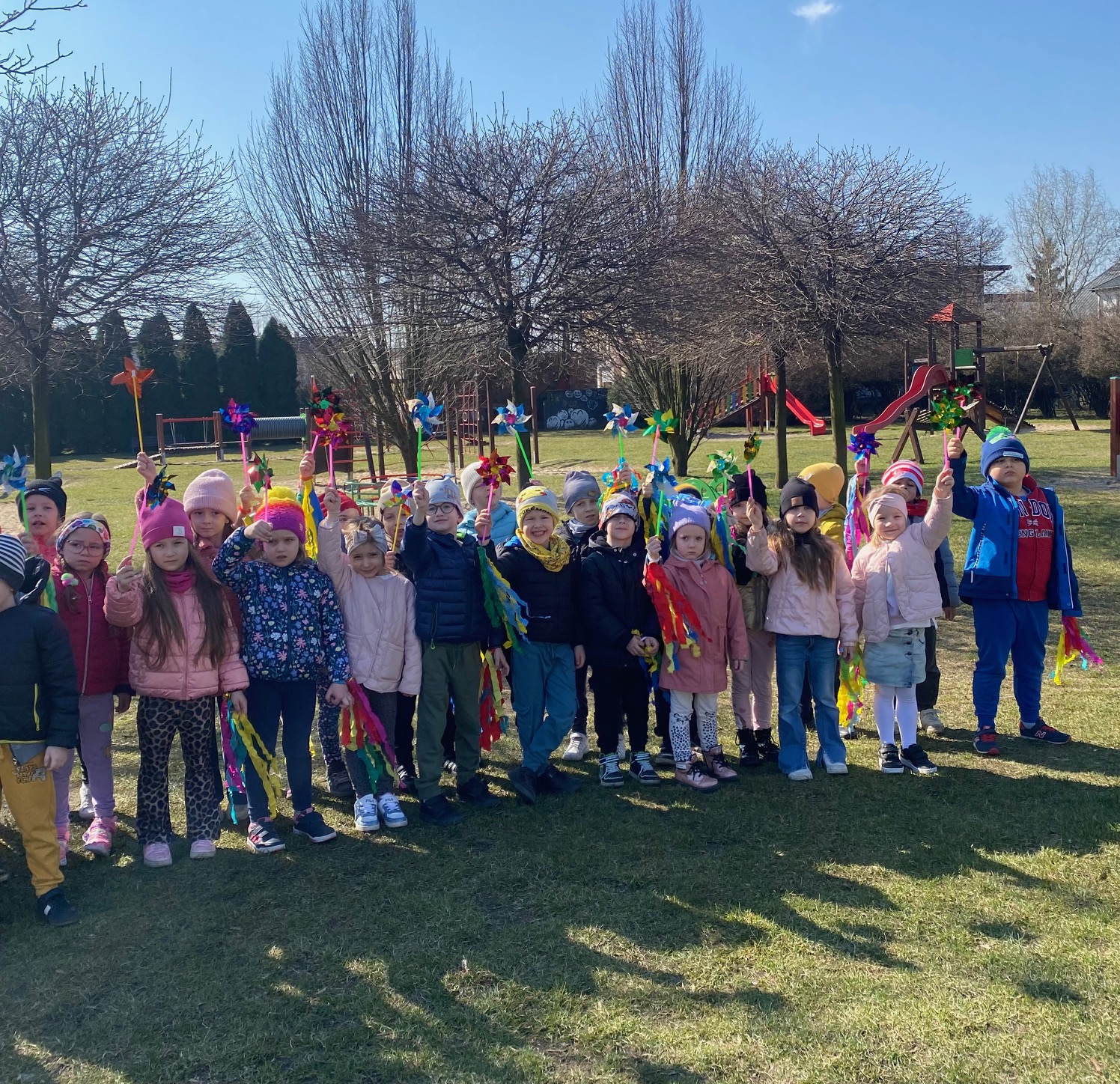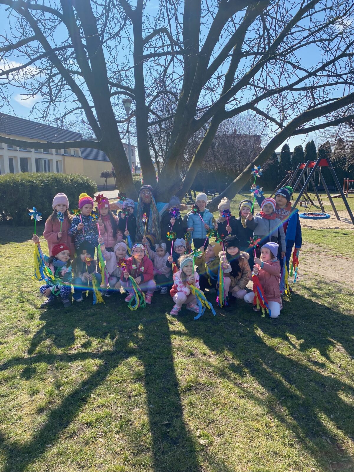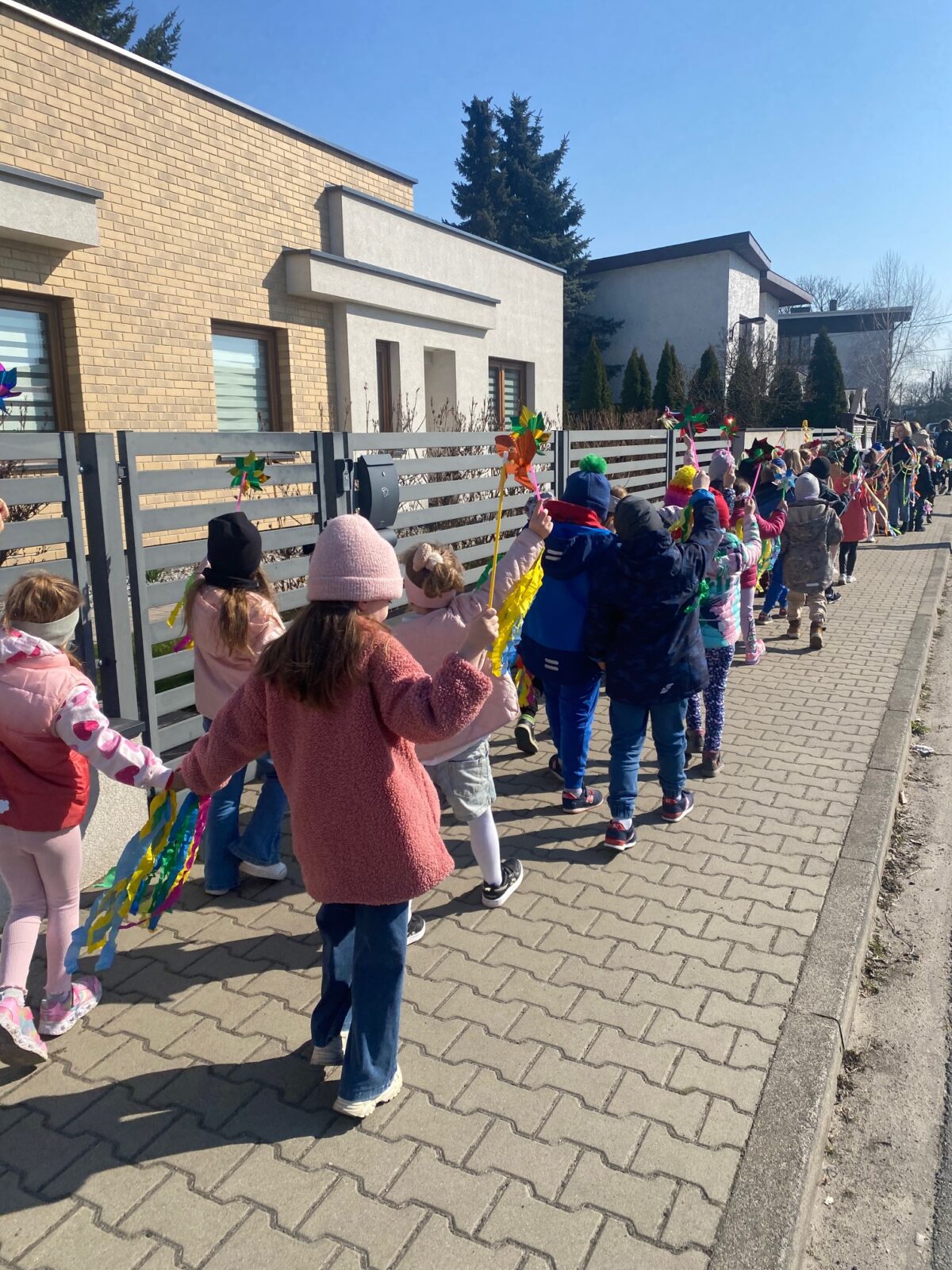 Ubrane w barwne stroje, z wiatraczkami i wiosennymi ozdobami w dłoniach, maszerowały z uśmiechami na twarzach, ciesząc się piękną pogodą i budzącą się do życia przyrodą. Spacer był nie tylko radosnym powitaniem nowej pory roku, ale też świetną okazją do wspólnej zabawy i integracji grup.