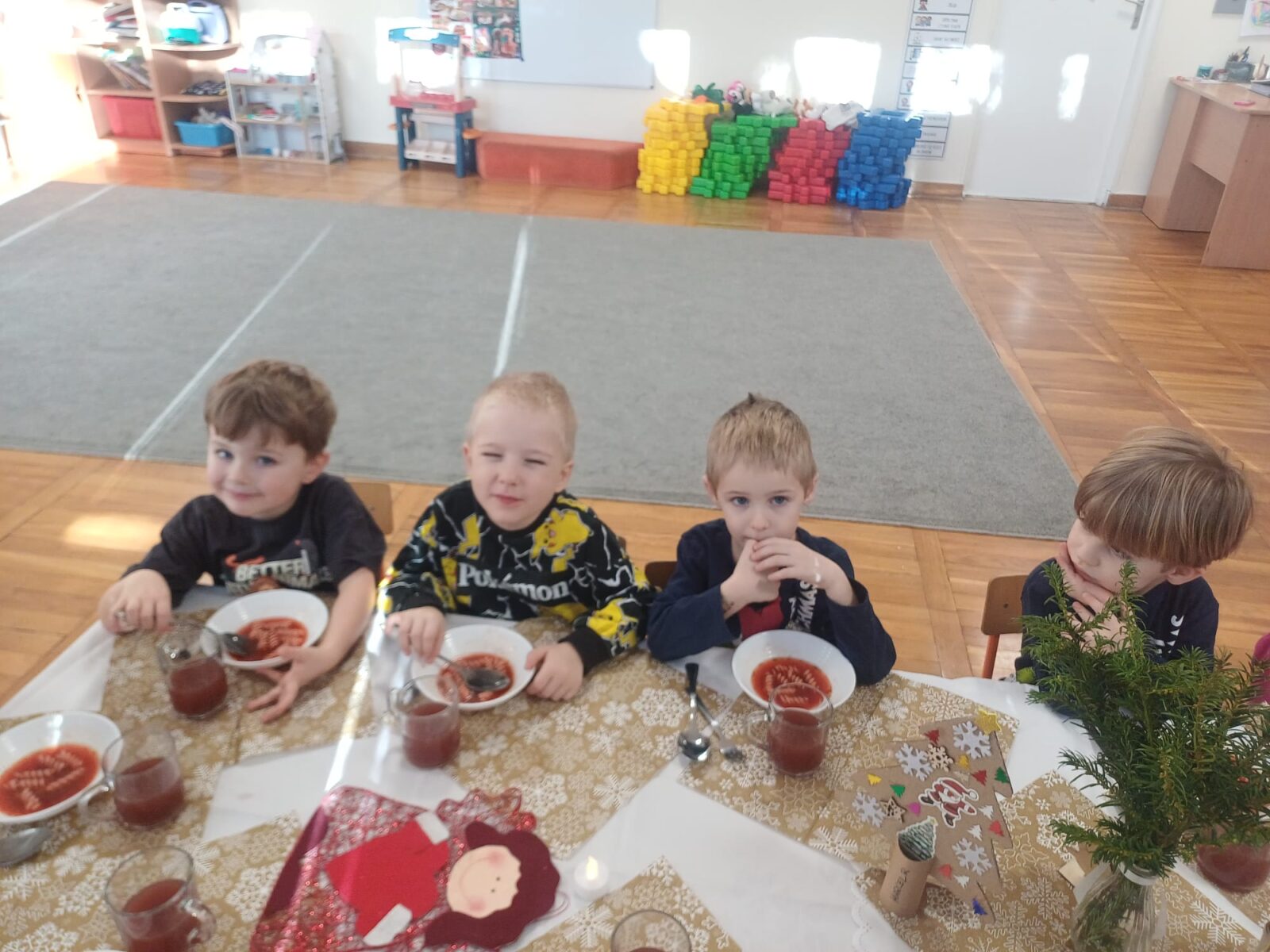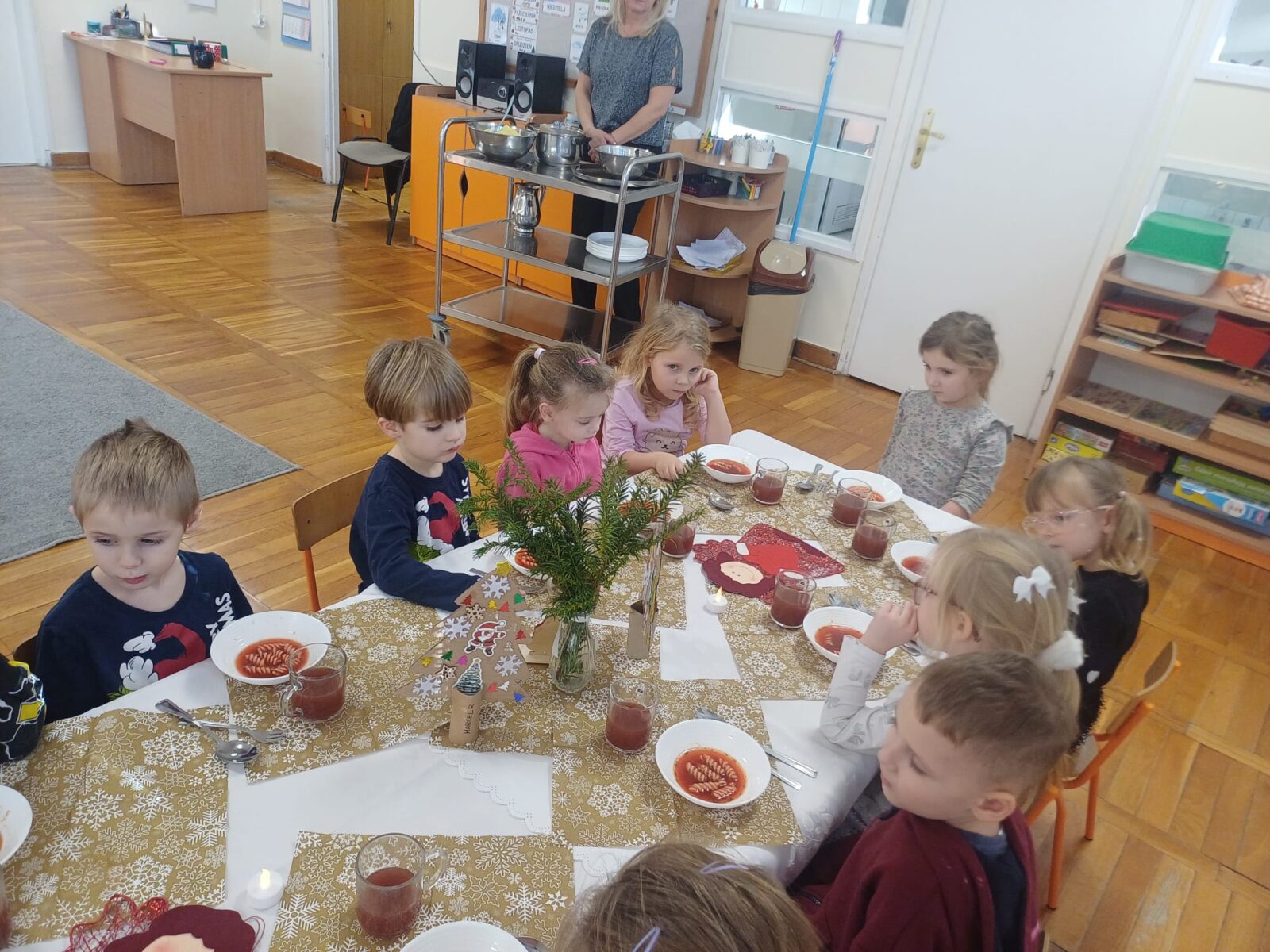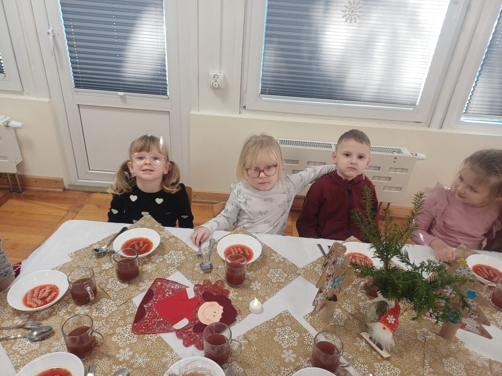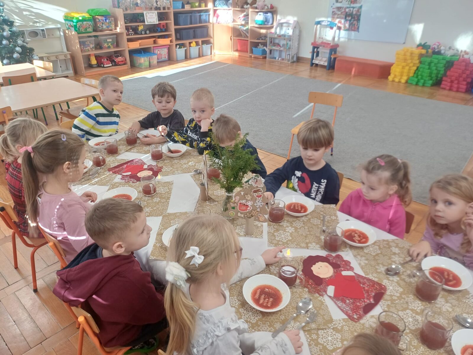 19 grudnia w naszym przedszkolu został zorganizowany wigilijny obiad. Stoły nakryto białym obrusem i przystrojono, a w jadłospisie na ten dzień znalazły się wigilijne potrawy. Po odpoczynku na dzieci czekała mała niespodzianka – foliowe balony do samodzielnego nadmuchania. Była to doskonała okazja do ćwiczeń mięśni okrężnych ust przez zabawę.