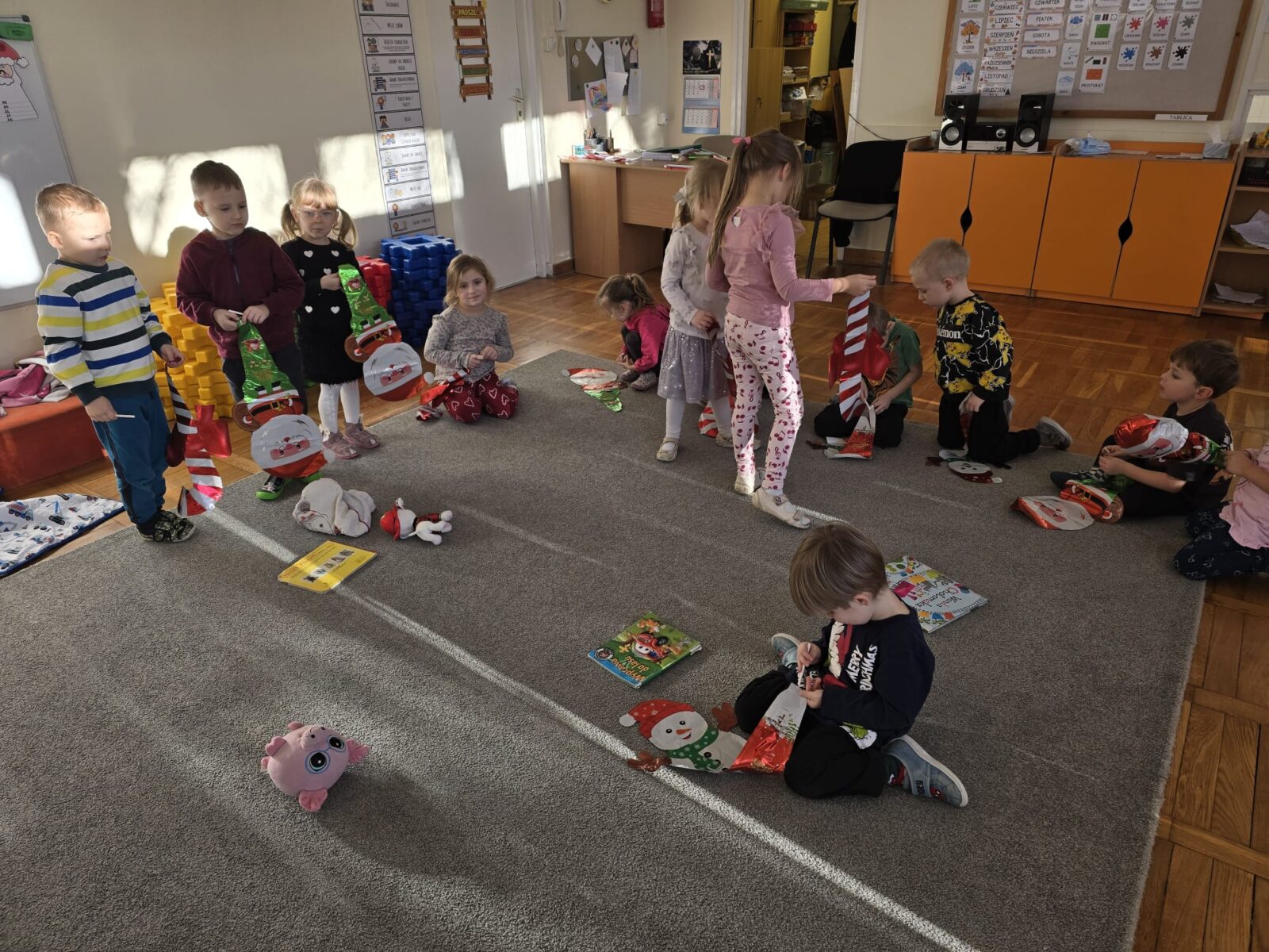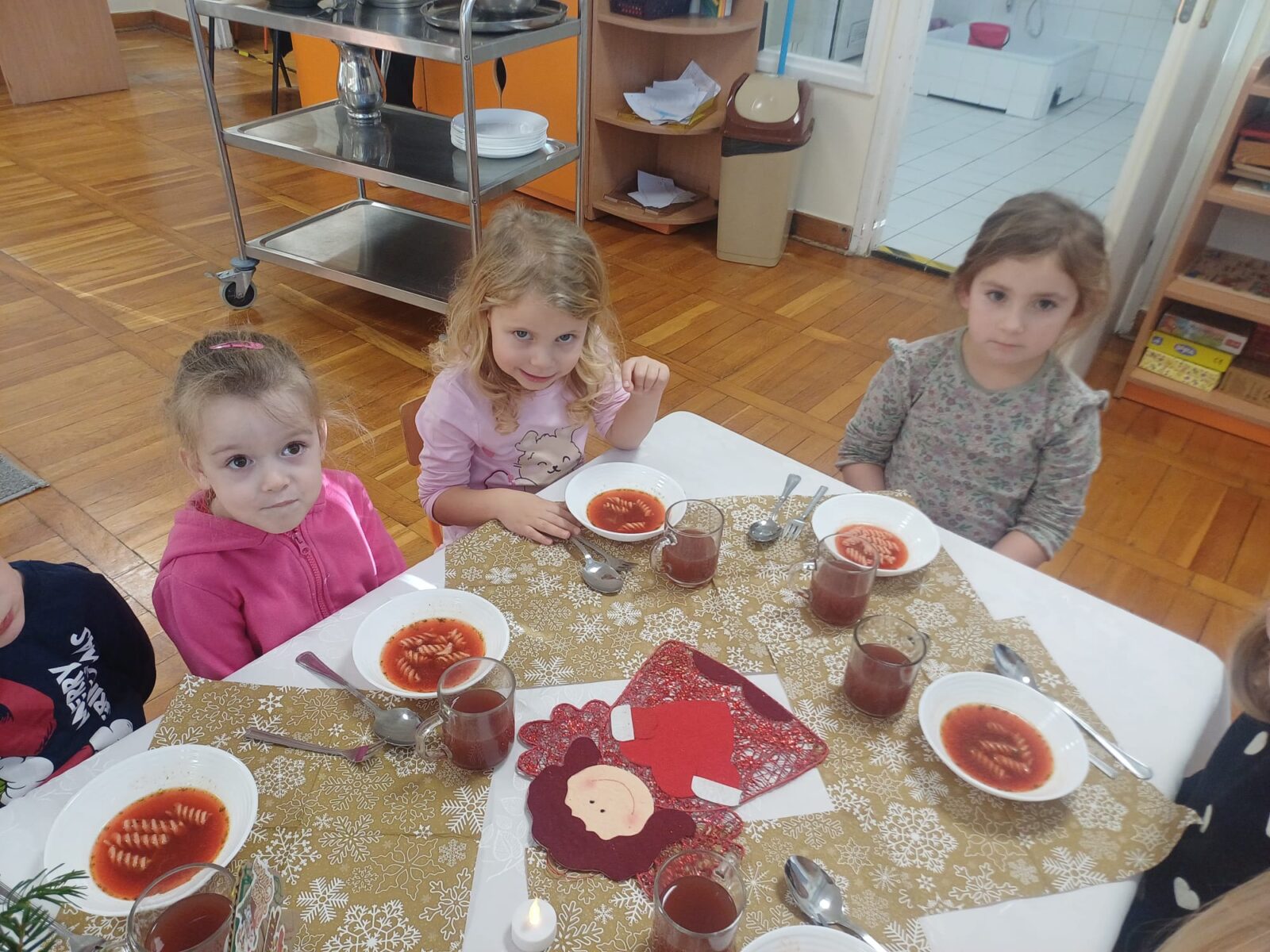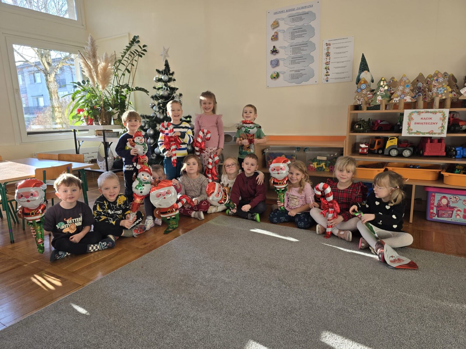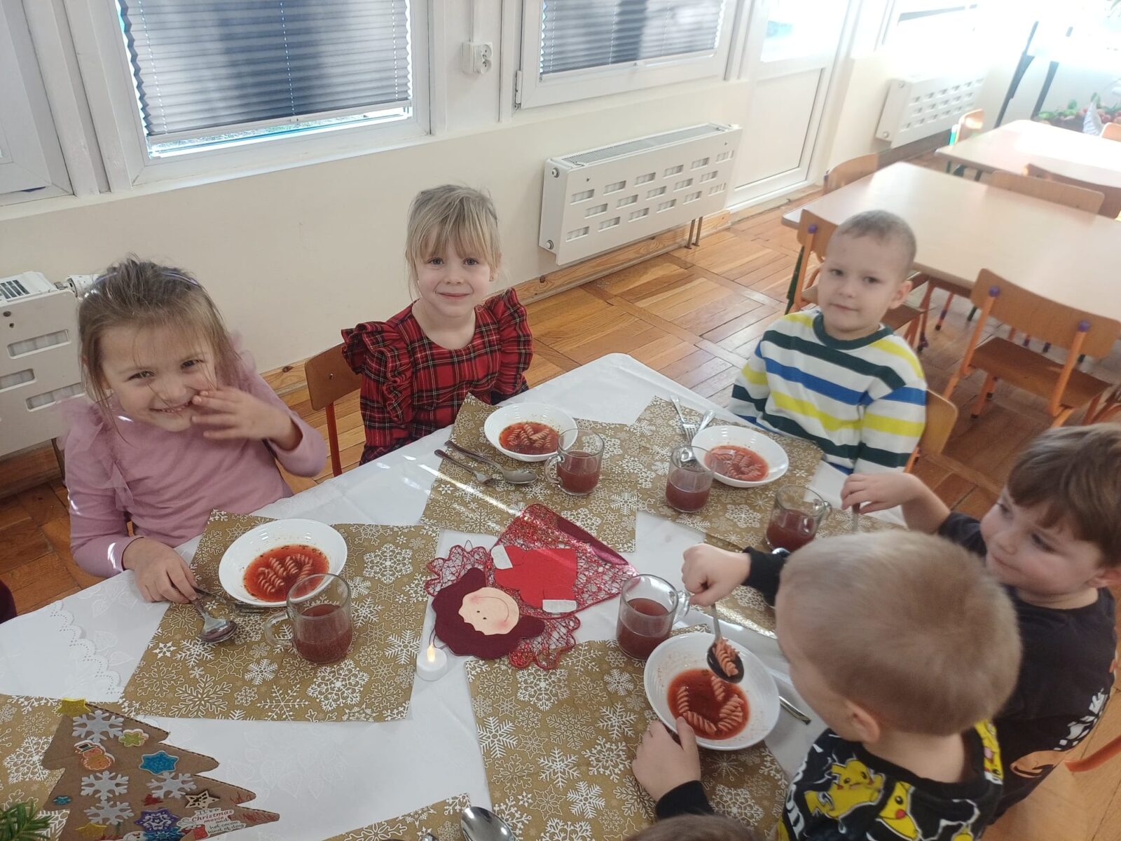 19 grudnia w naszym przedszkolu został zorganizowany wigilijny obiad. Stoły nakryto białym obrusem i przystrojono, a w jadłospisie na ten dzień znalazły się wigilijne potrawy. Po odpoczynku na dzieci czekała mała niespodzianka – foliowe balony do samodzielnego nadmuchania. Była to doskonała okazja do ćwiczeń mięśni okrężnych ust przez zabawę.