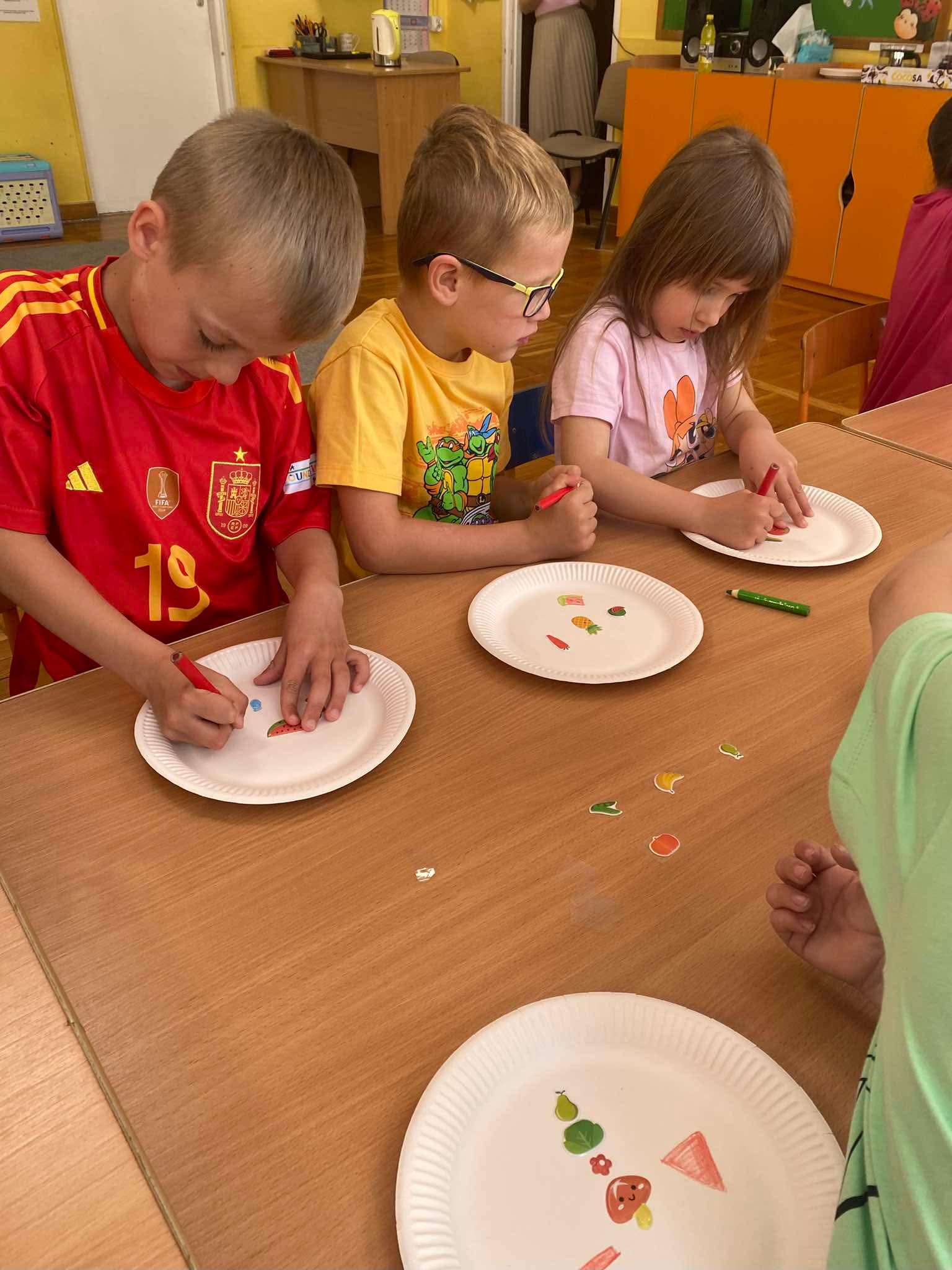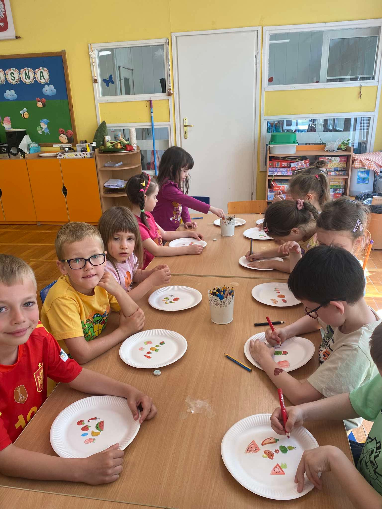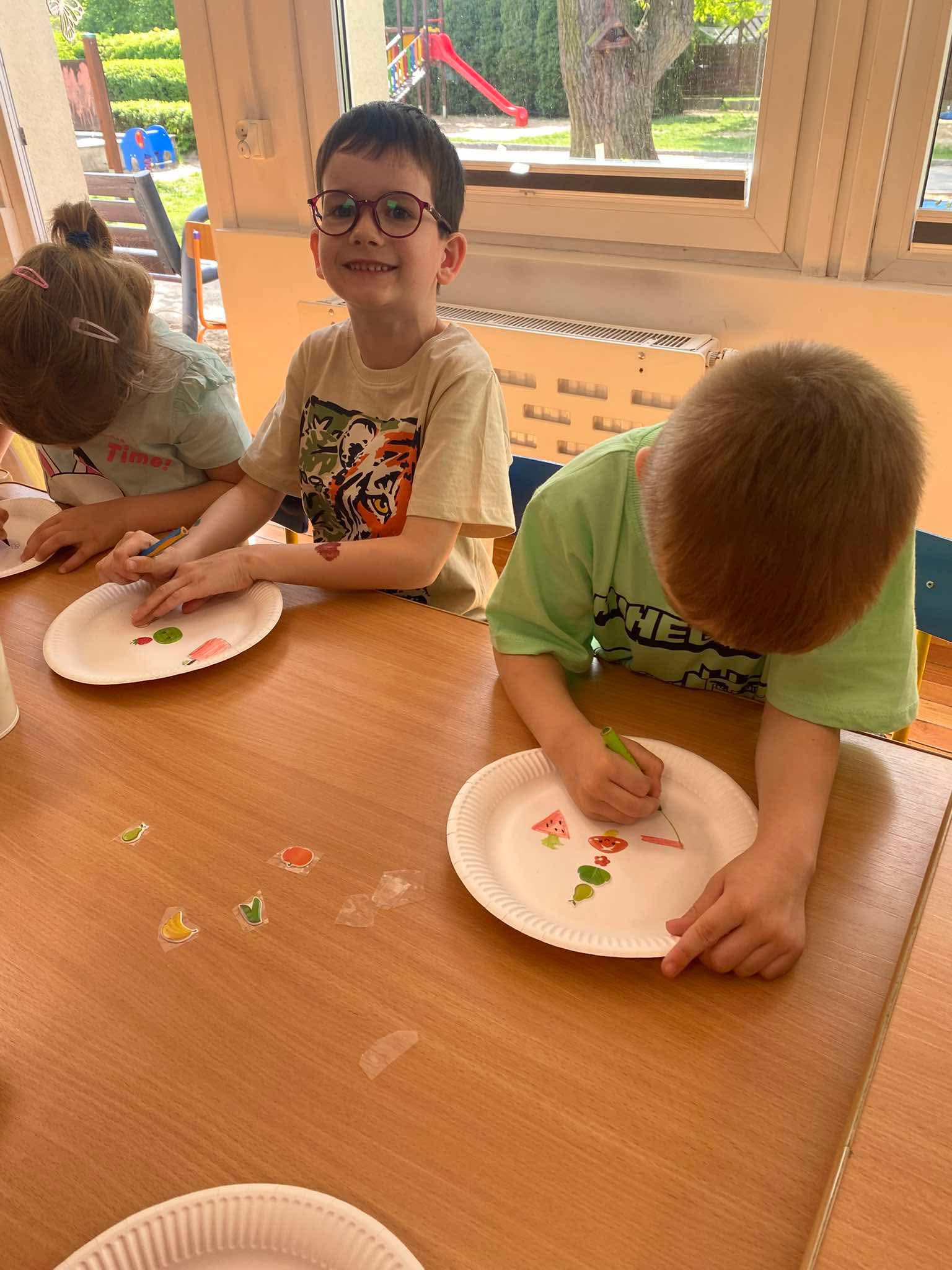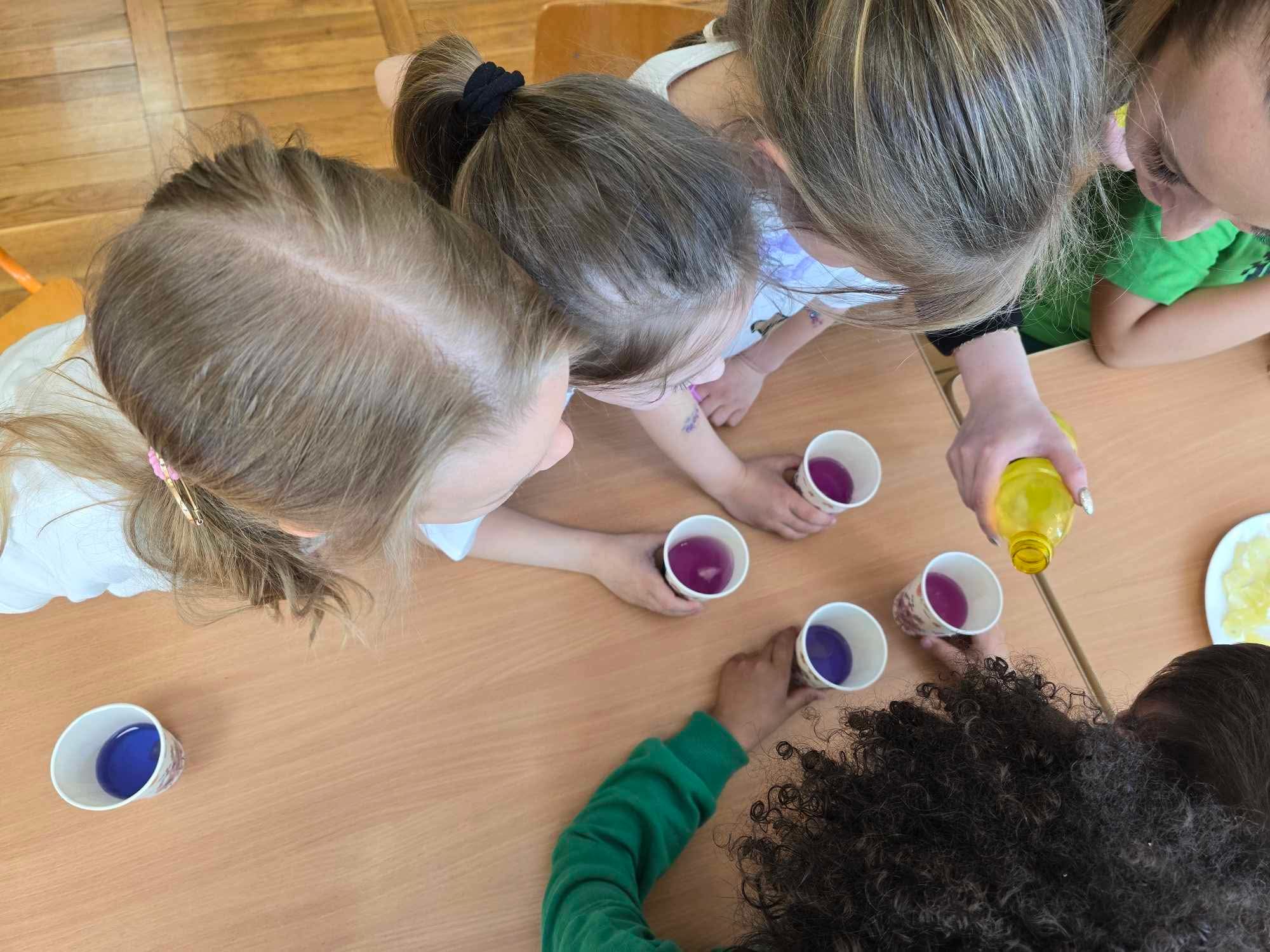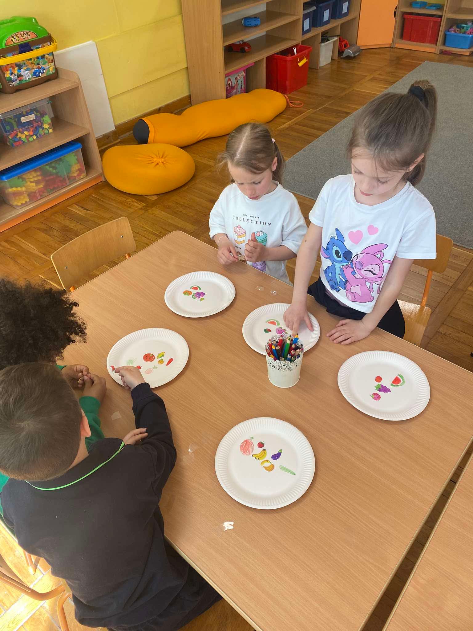29 kwietnia grupę Żuczki odwiedził dietetyk – Pani Monika, która przedstawiła dzieciom podstawowe zasady prawidłowego odżywiania. Spotkanie zaczęło się od pokazania wielu warzyw i owoców oraz ich wartości odżywczych. Dzieci dowiedziały się, dlaczego należy ograniczyć słodycze i słodkie napoje, a zwiększyć ilość spożywanych owoców i warzyw. Przedszkolaki zapoznały się również ze „Zdrowym talerzem”, czyli co i w jakich proporcjach powinno się na nim znaleźć. Następnie dzieci z pomocą Pani dietetyk wykonały taki talerz przyklejając na niego naklejki przedstawiające owoce i warzywa. Dzięki doświadczeniu z cytryną i kwaskiem cytrynowym dzieci poszerzyły swoją wiedzę odkrywczą.