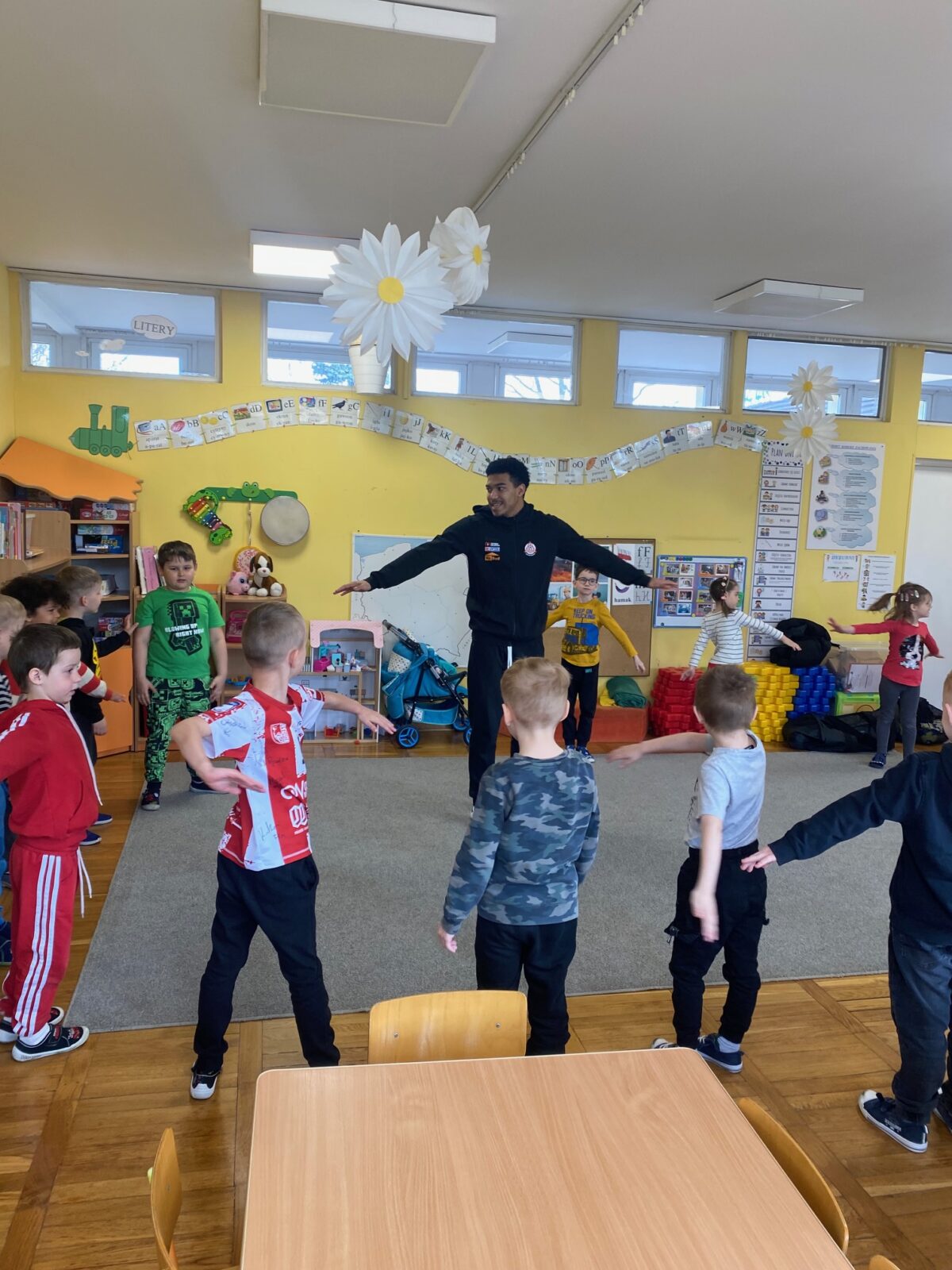 Podczas spotkania dzieci aktywnie uczestniczyły w ćwiczeniach i zabawach ruchowych, rozwijając swoją sprawność motoryczną oraz umiejętność współpracy w zespole. Przedszkolaki uczyły się także komunikacji niewerbalnej poprzez znaki używane w grze oraz poznawały zasady kulturalnego kibicowania – z szacunkiem do rywali i radością z każdej dobrej akcji.