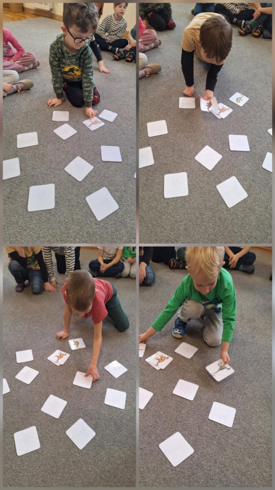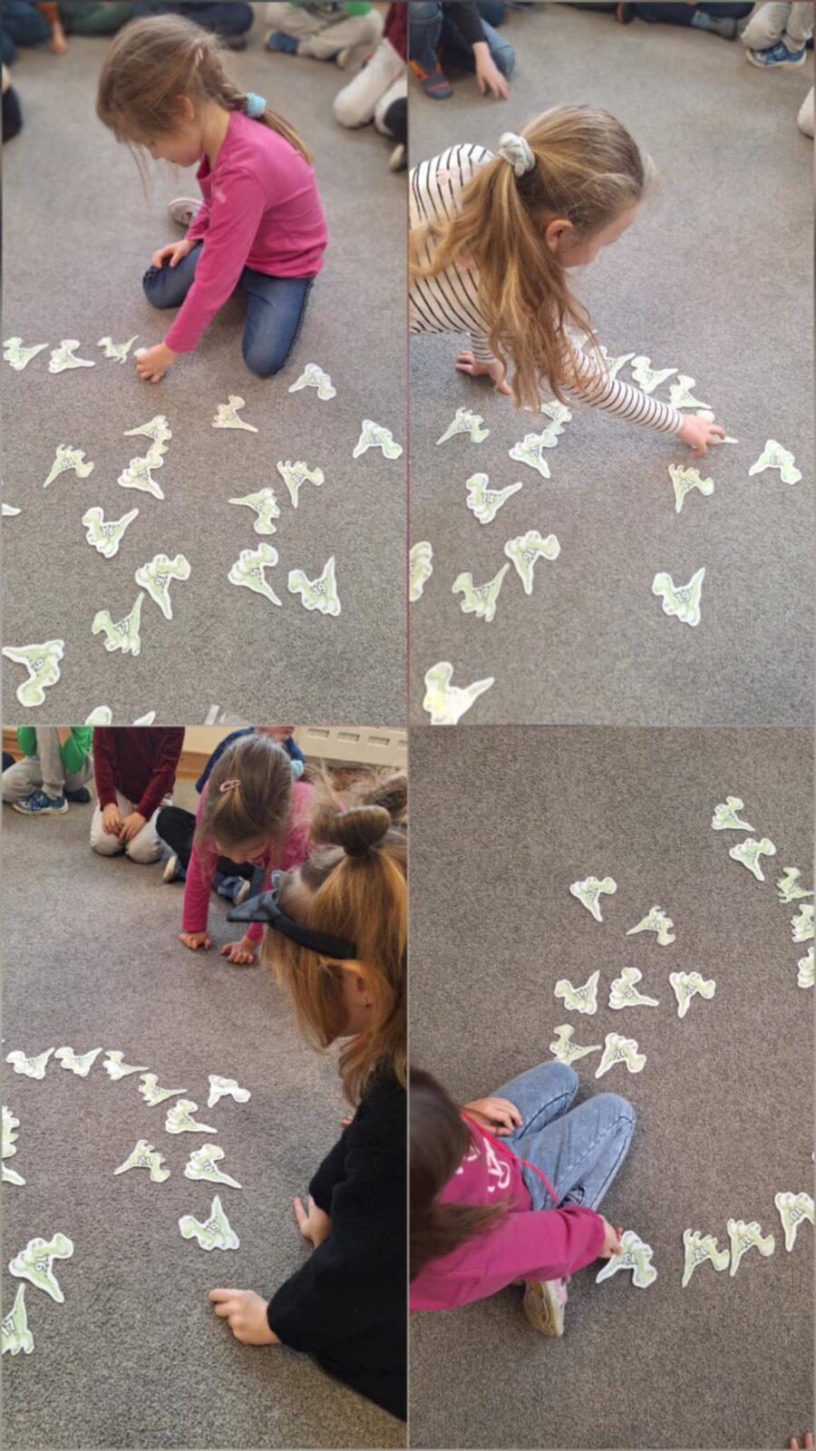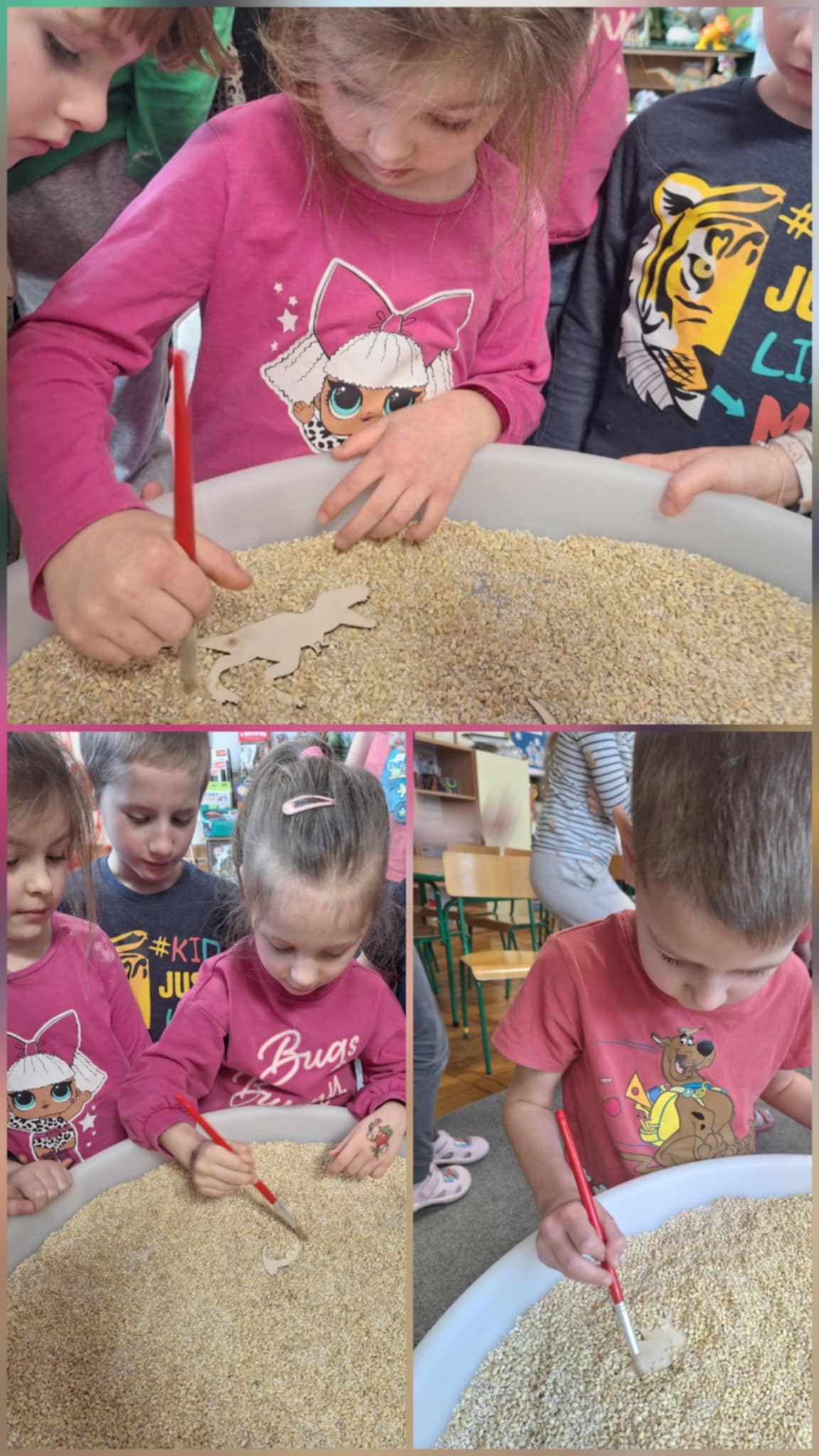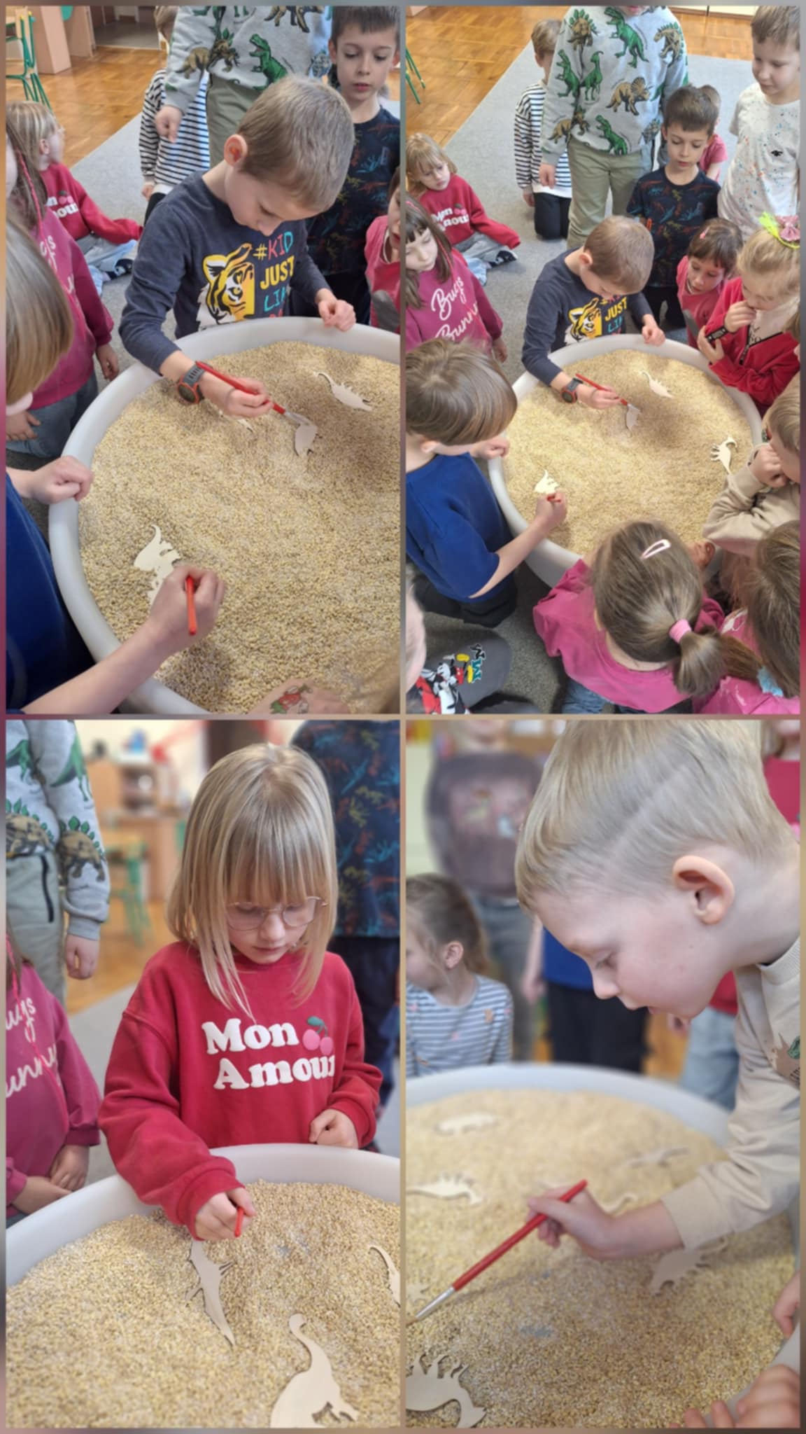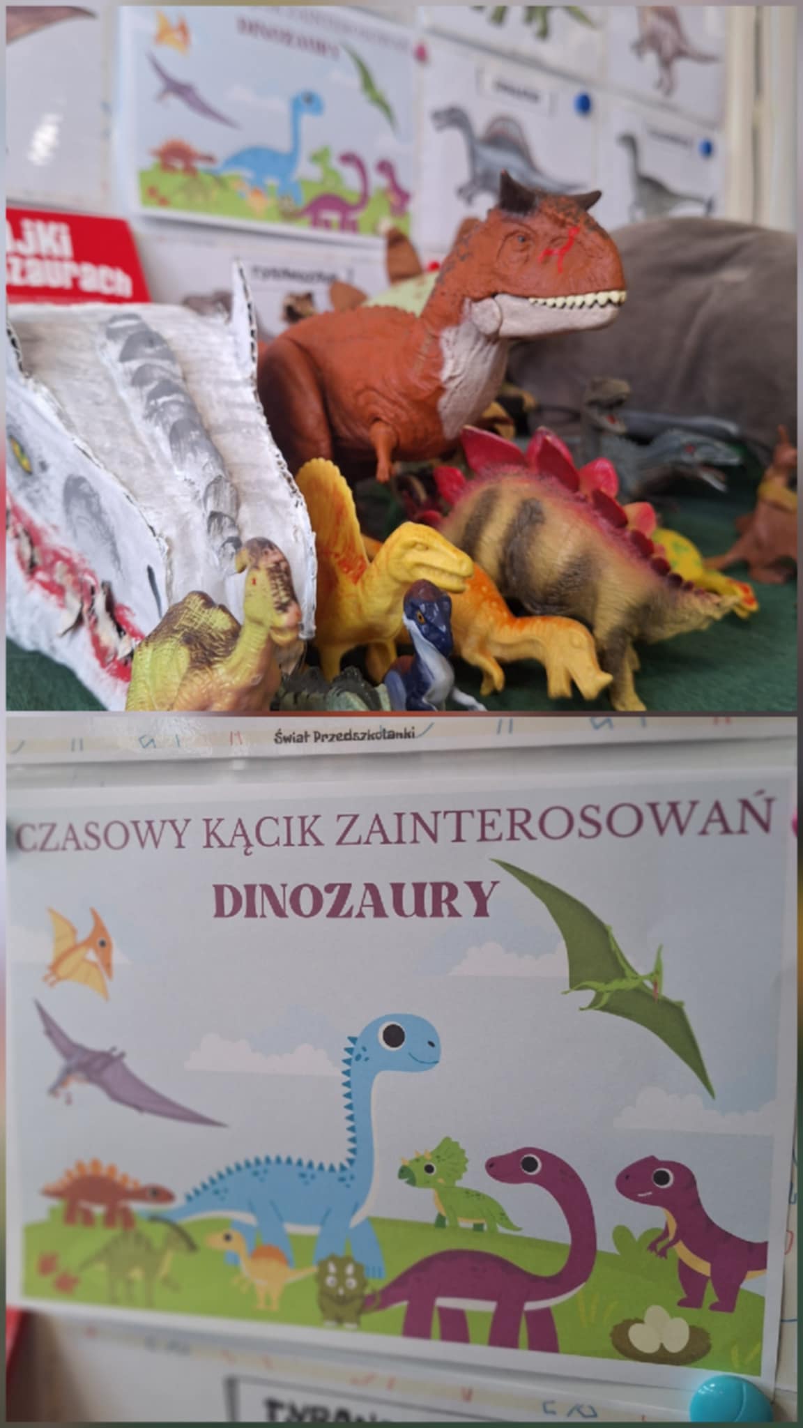 W lutym nasz czasowy kącik zainteresowań zamienił się w świat pradawnych zwierząt. Fascynujące, prehistoryczne gady, które żyły na Ziemi miliony lat temu – dinozaury. Były to zarówno gigantyczne roślinożercy (np. zauropody), jak i drapieżne mięsożercy (np. T-rex). Dzieci doskonale orientują się w ich nazwach, wielkościach i kulinarnych upodobaniach. Motylki kącik zainteresowań stworzyły z przyniesionych z domu figurek, puzzli, książek, atlasów, maskotek, kart, gier dotyczących tych pradawnych zwierząt. Podczas zajęć poznaliśmy wszystkie najważniejsze informacje dotyczące dinozaurów oraz ludzi, którzy odkrywają ich szkielety. Poćwiczyliśmy przeliczanie, zagraliśmy w memory z dinozaurami a na koniec dzieci zamieniły się w paleontologów i mogły same odkryć szkielety ulubionych gadów.