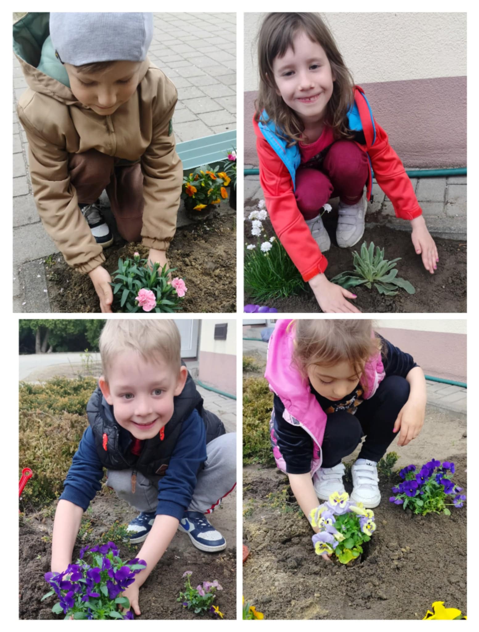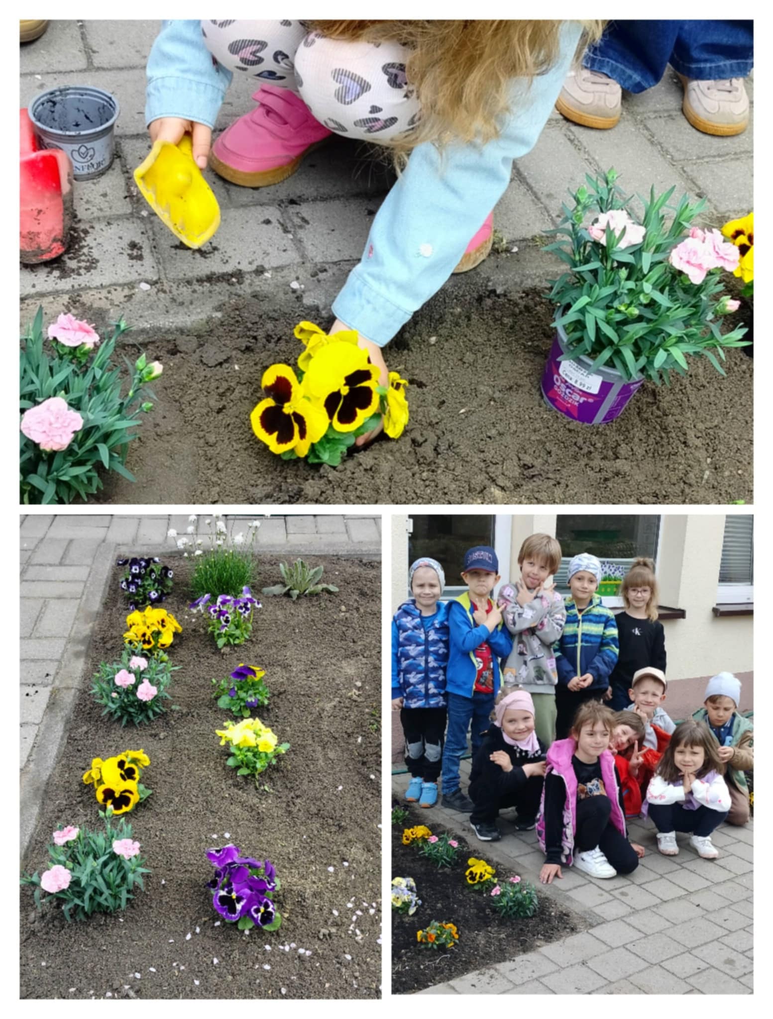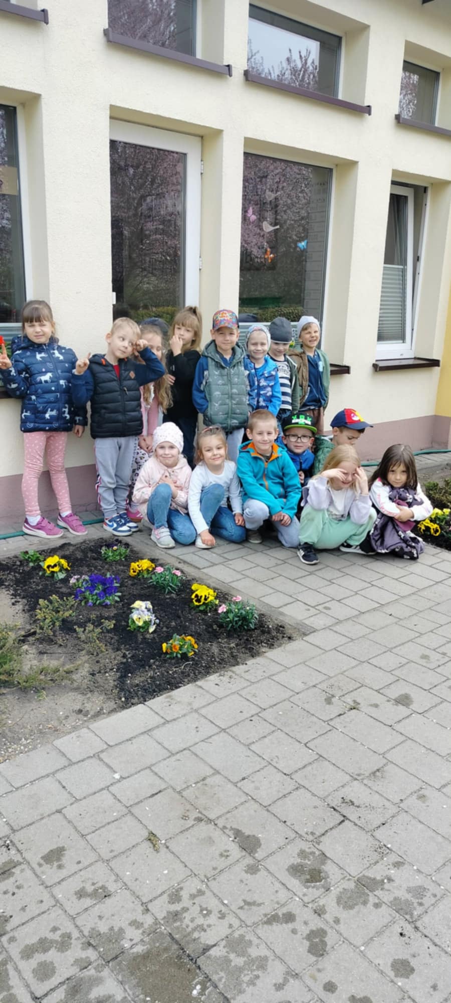 Jak co roku dzieci z naszej grupy tworzyły wiosenny ogródek przy sali przedszkolnej. Każde dziecko przyniosło sadzonki kwiatów, które wsadziliśmy przed oknami naszej sali. Dzieci będą mogły codziennie obserwować jak rosną kwiaty, będą dbać i podlewać roślinki aby jak najdłużej ozdabiały wejście do przedszkola.