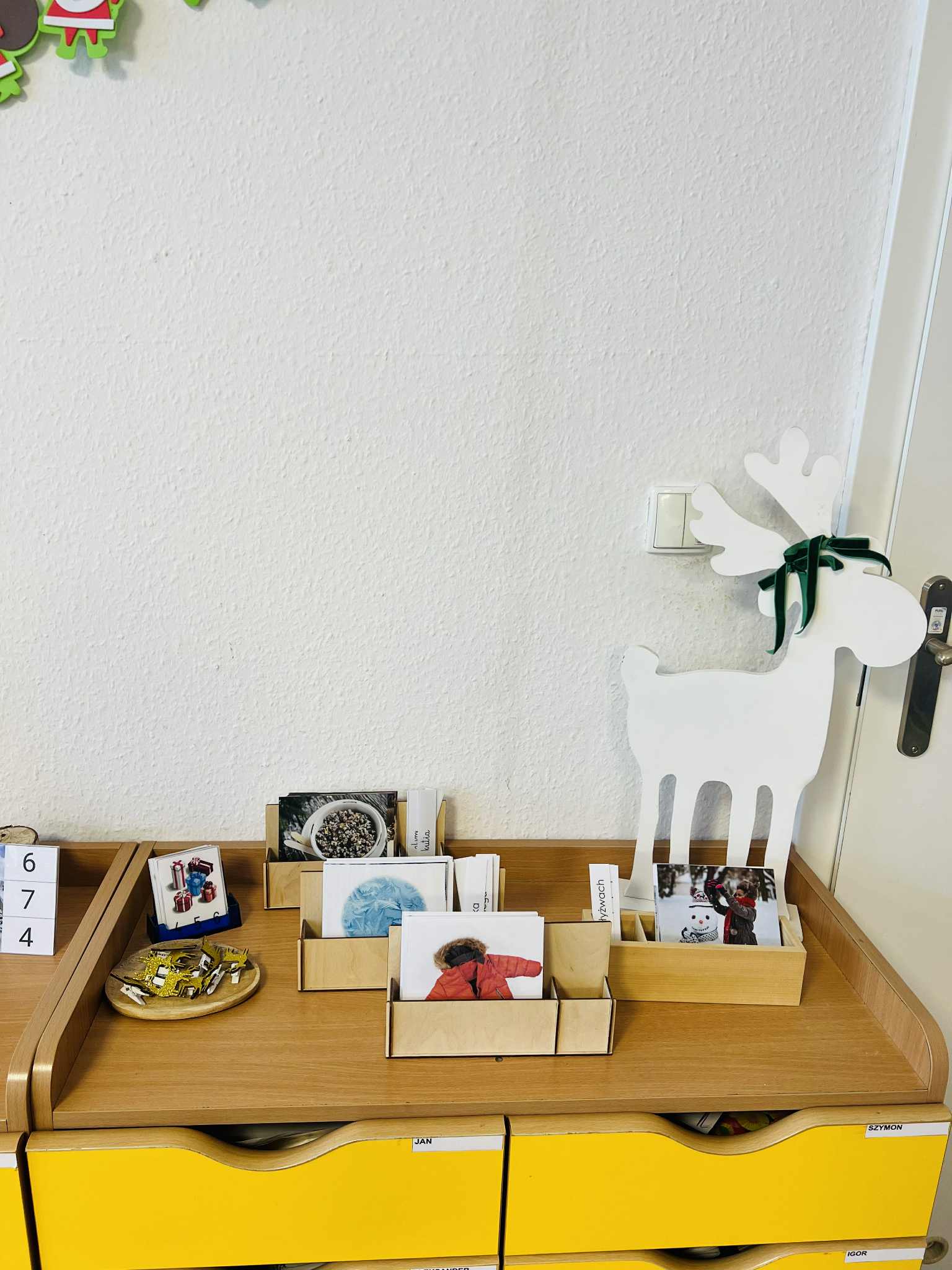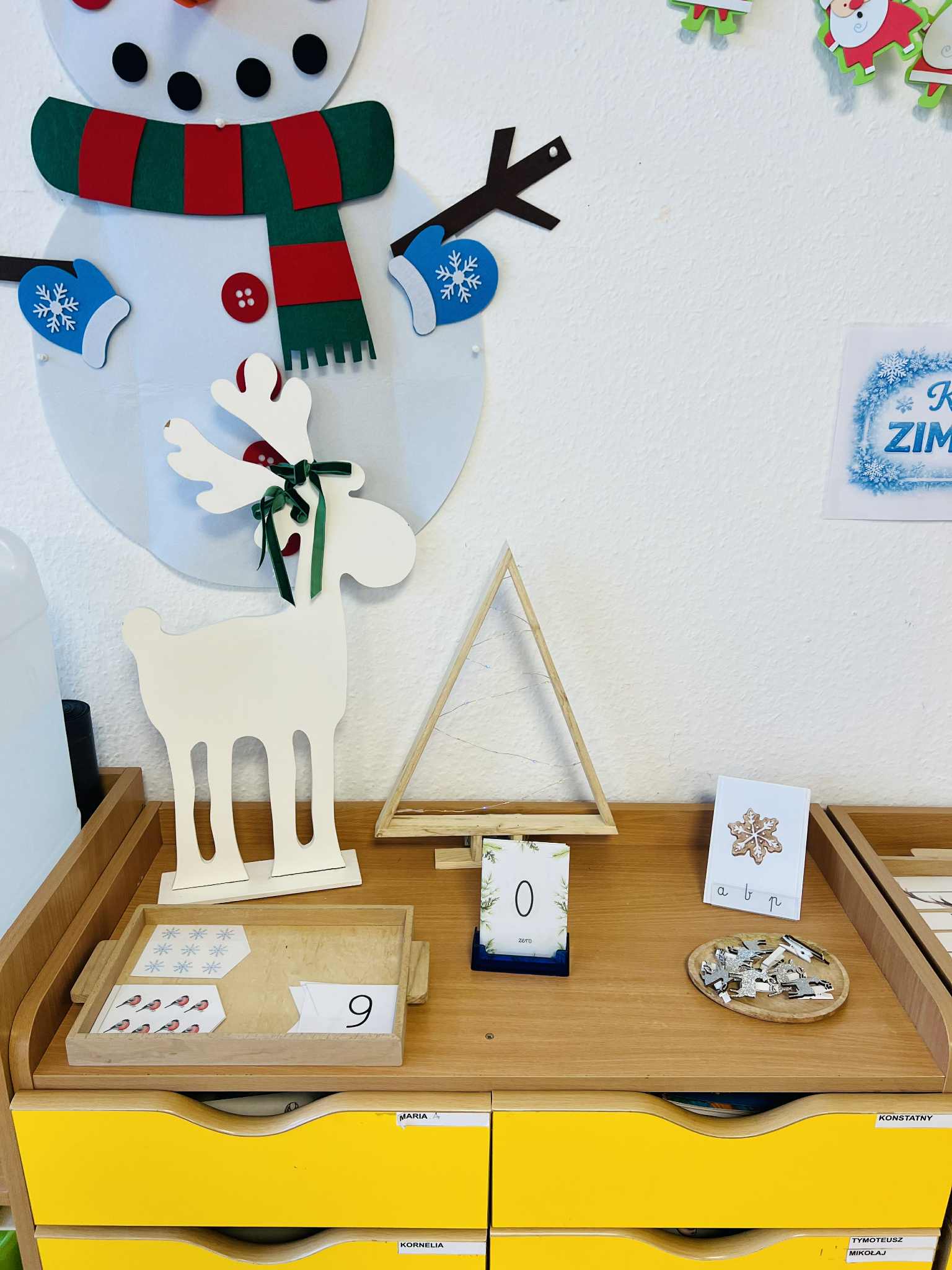 W sali został zorganizowany zimowy kącik tymczasowy, który wprowadza dzieci w tematykę pory roku – zimy. Kącik zawiera elementy związane z zimą, takie jak ilustracje tematyczne, prace plastyczne dzieci oraz materiały przyrodnicze. Dodatkowo znajdują się w nim karty pracy rozwijające umiejętności matematyczne, m.in. liczenie, porównywanie ilości, klasyfikowanie oraz orientację przestrzenną. Celem kącika jest rozwijanie zainteresowań dzieci, wzbogacanie słownictwa, utrwalanie pojęć matematycznych oraz stworzenie przyjaznej przestrzeni do samodzielnych działań, obserwacji i swobodnych rozmów na temat zimowych zjawisk.