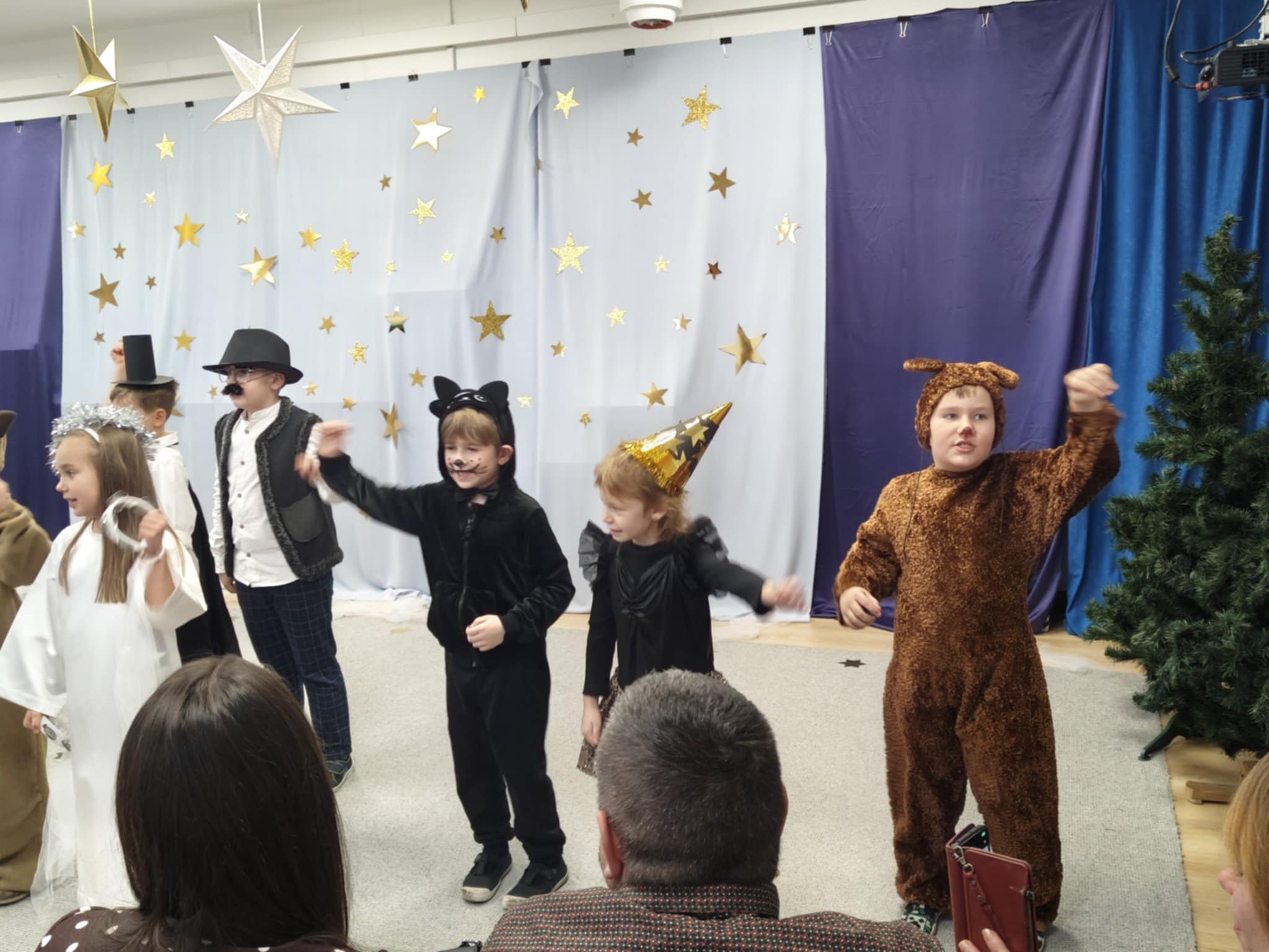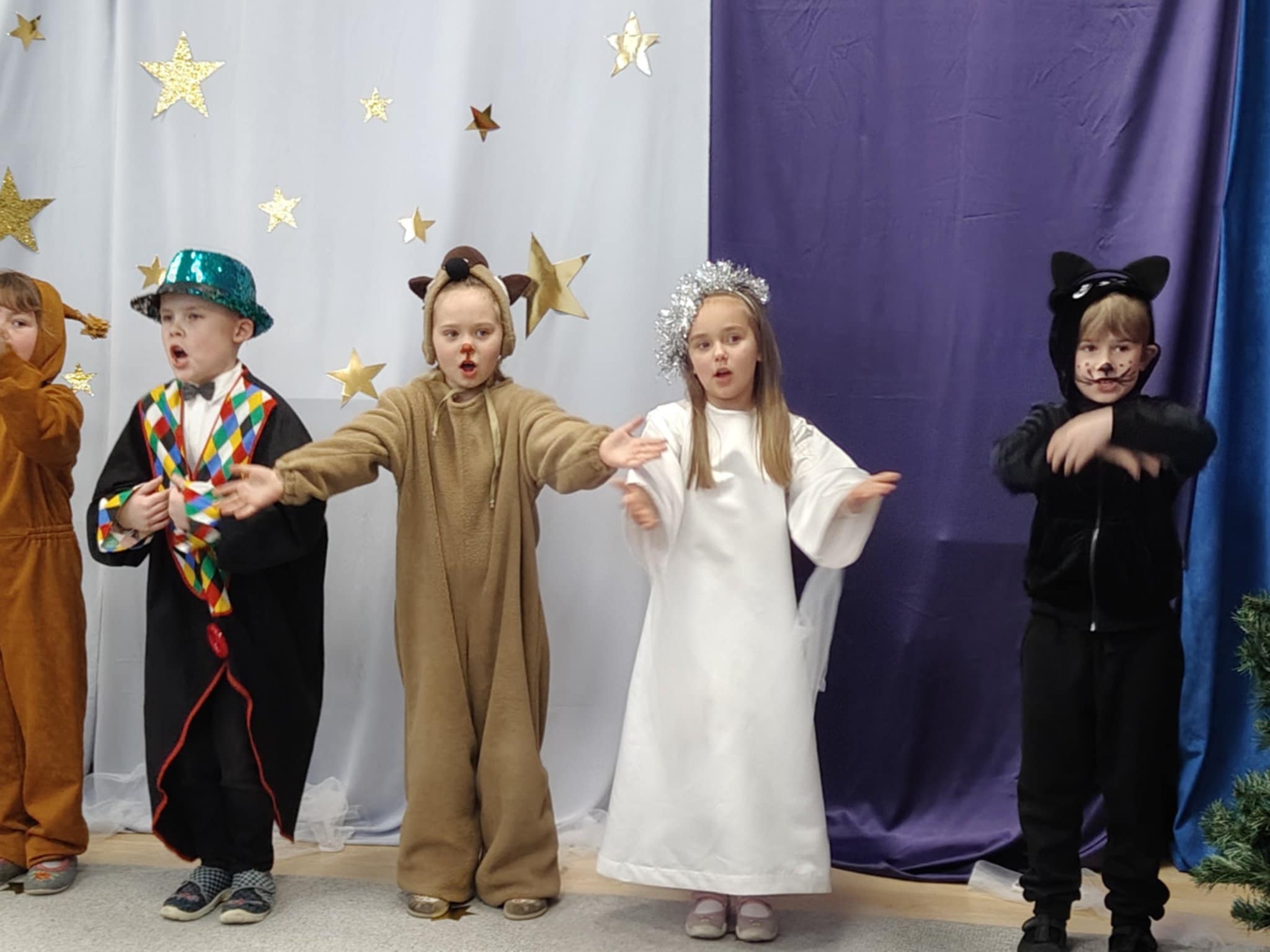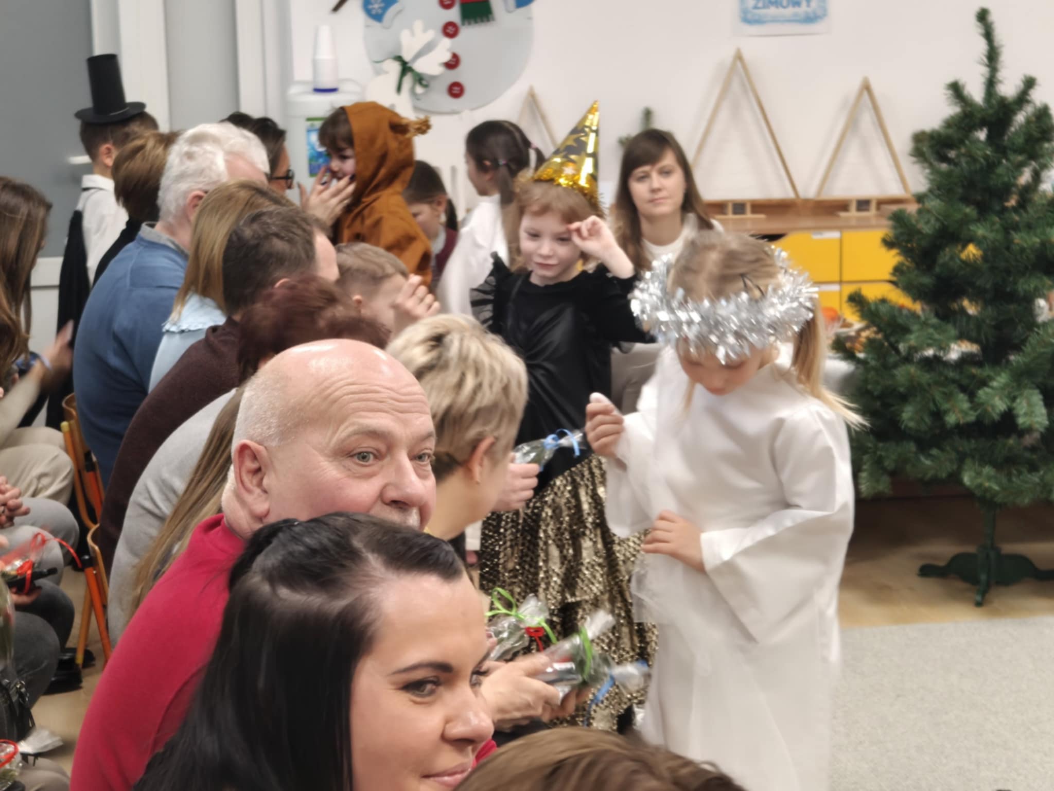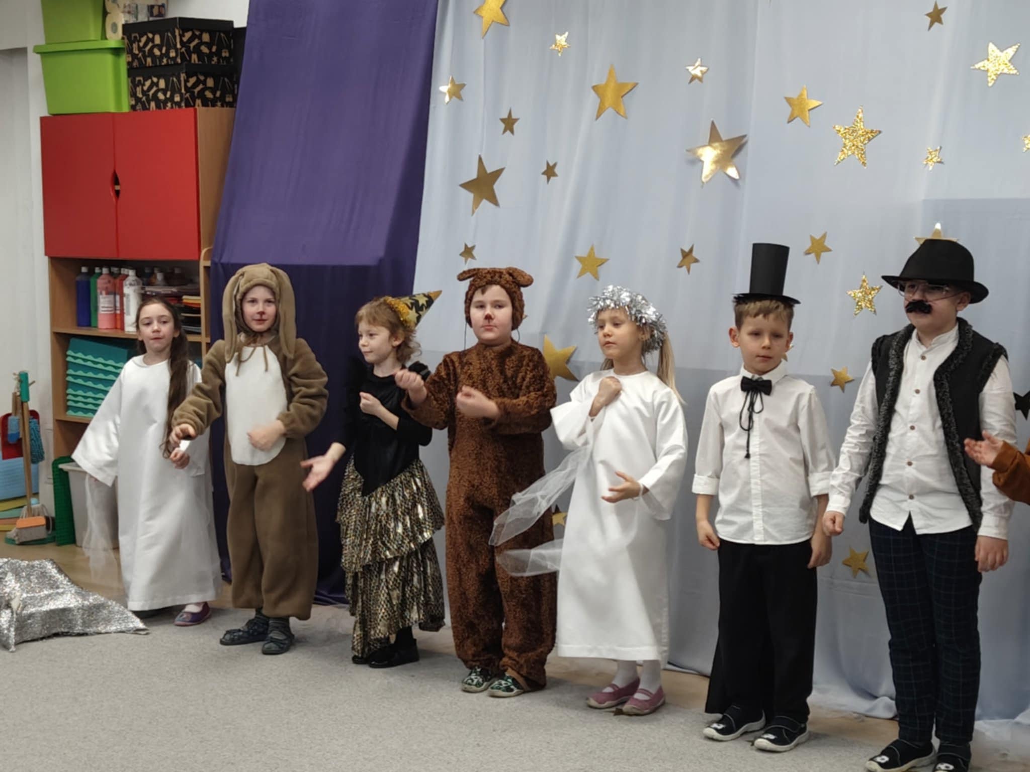 Słowami tej piosenki dzieci z gr. Montesorki przywitały zaproszonych Rodziców i Dziadków, którzy przybyli do przedszkola w zimowe-wtorkowe popołudnie – 20.stycznia. Wcielając się w role: Śnieżynek, Pani Zimy, Nocy, Nowego i Starego Roku, Sylwestra oraz zwierząt mali aktorzy zaprezentowali Gościom przygotowywane od kilku tygodni przedstawienie pt.,,Bajka Noworoczna”. Dzieci z wielkim zaangażowaniem wcieliły się w prezentowane role, śpiewały okolicznościowe piosenki, wykonały układy taneczne. Nie zapominając o zbliżającym się Dniu Babci i Dziadka mali artyści przedstawili ponadto krótki program adresowany do najstarszych uczestników spotkania. Wszystkim Babciom i Dziadkom jeszcze raz składamy najserdeczniejsze życzenia, zdrowia, nieustającej energii i pociechy z wnuków. ![]()