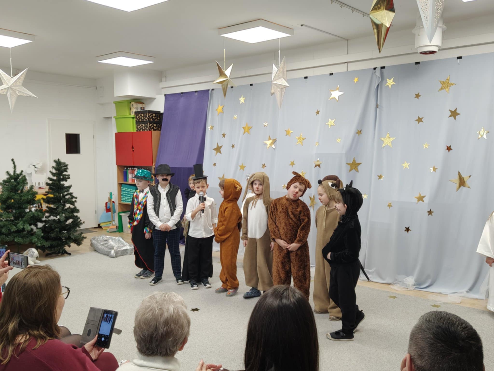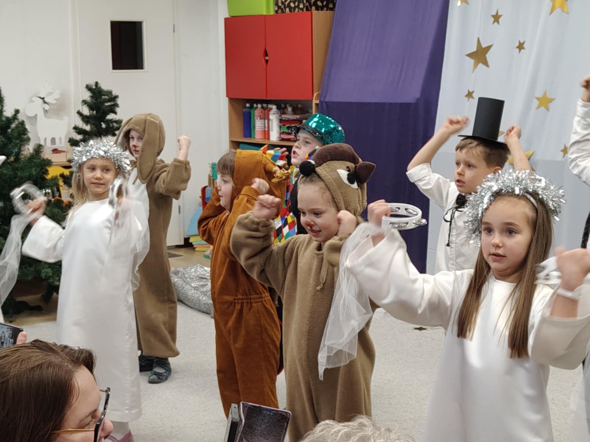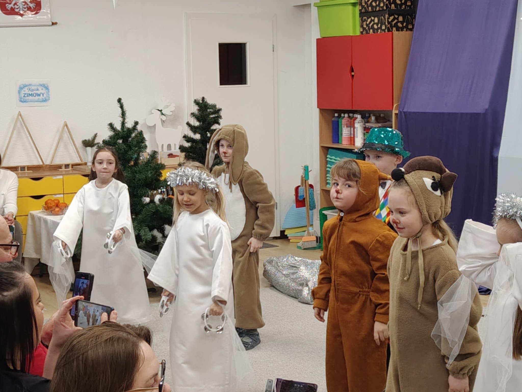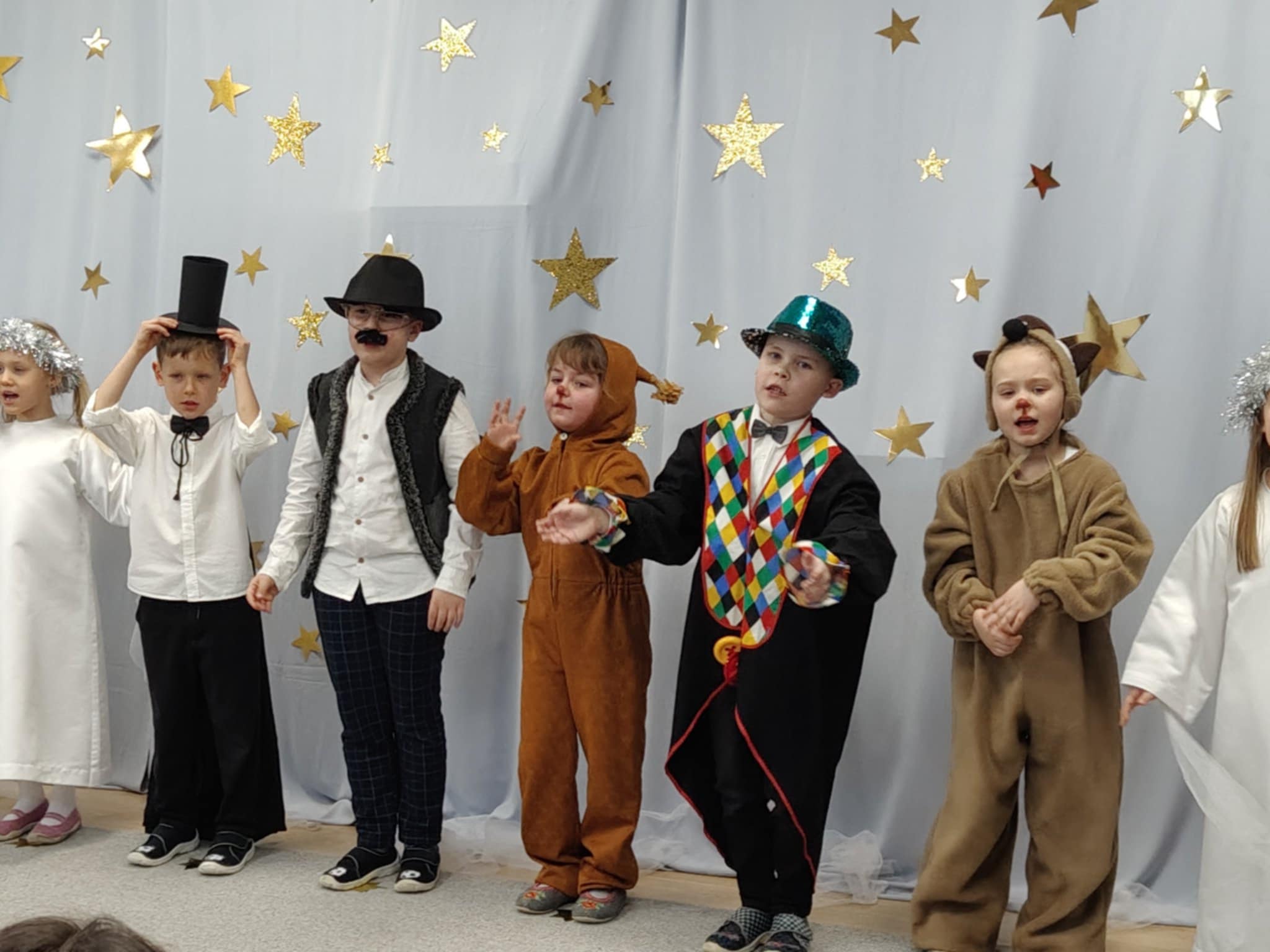 Słowami tej piosenki dzieci z gr. Montesorki przywitały zaproszonych Rodziców i Dziadków, którzy przybyli do przedszkola w zimowe-wtorkowe popołudnie – 20.stycznia. Wcielając się w role: Śnieżynek, Pani Zimy, Nocy, Nowego i Starego Roku, Sylwestra oraz zwierząt mali aktorzy zaprezentowali Gościom przygotowywane od kilku tygodni przedstawienie pt.,,Bajka Noworoczna”. Dzieci z wielkim zaangażowaniem wcieliły się w prezentowane role, śpiewały okolicznościowe piosenki, wykonały układy taneczne. Nie zapominając o zbliżającym się Dniu Babci i Dziadka mali artyści przedstawili ponadto krótki program adresowany do najstarszych uczestników spotkania. Wszystkim Babciom i Dziadkom jeszcze raz składamy najserdeczniejsze życzenia, zdrowia, nieustającej energii i pociechy z wnuków. ![]()