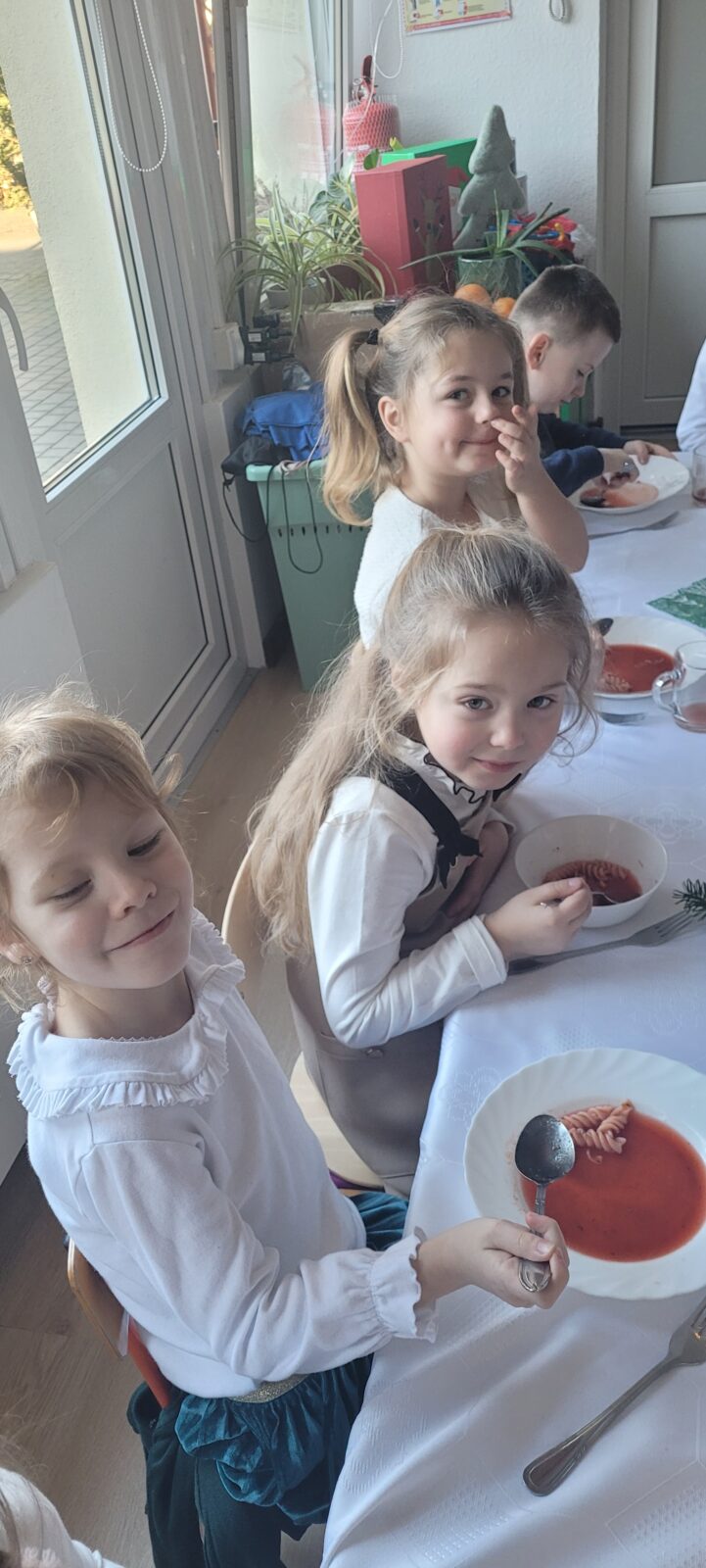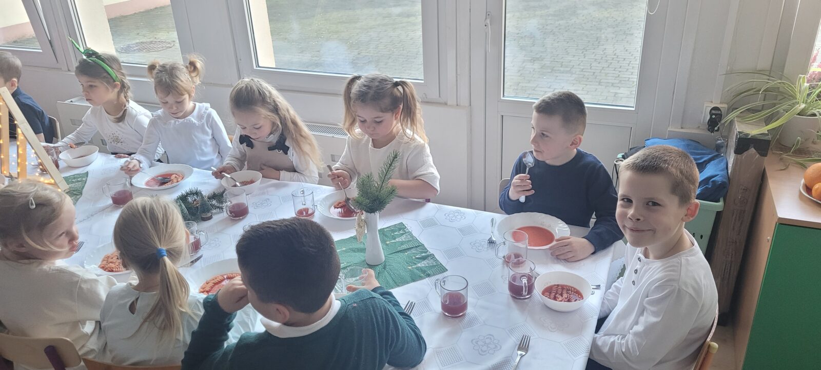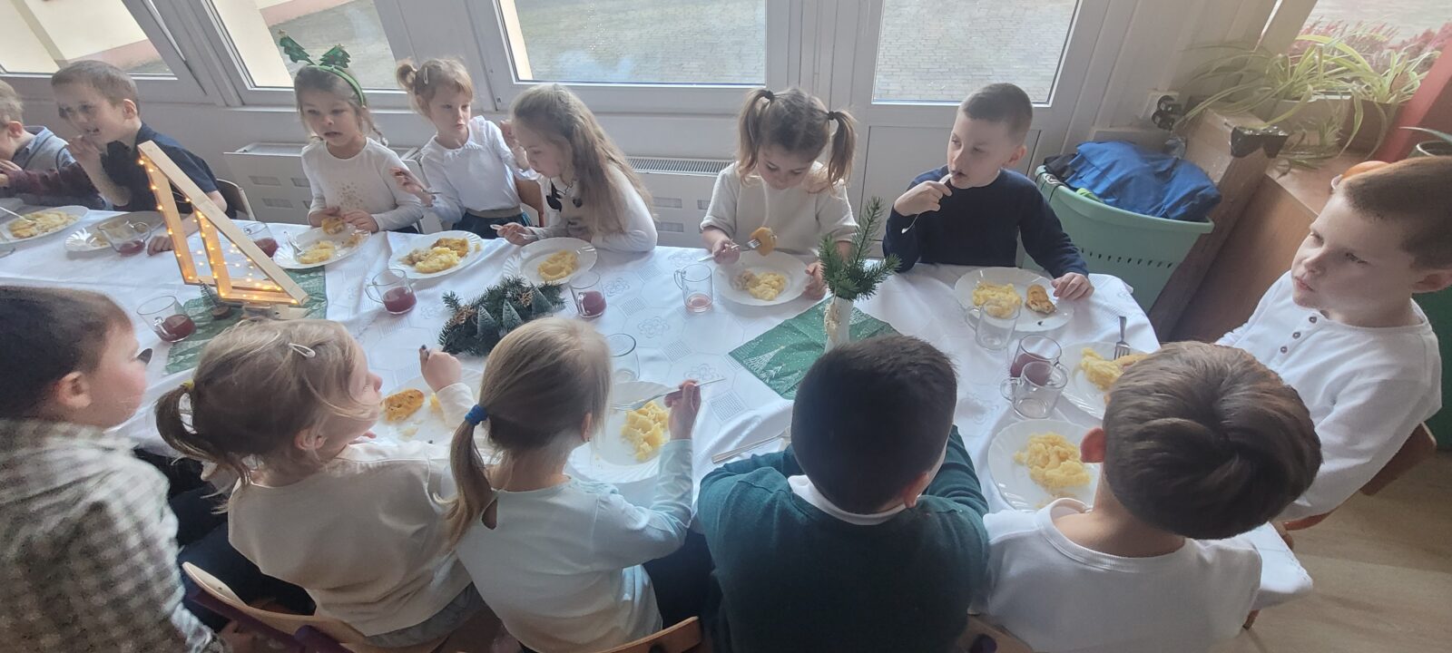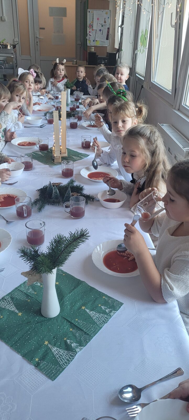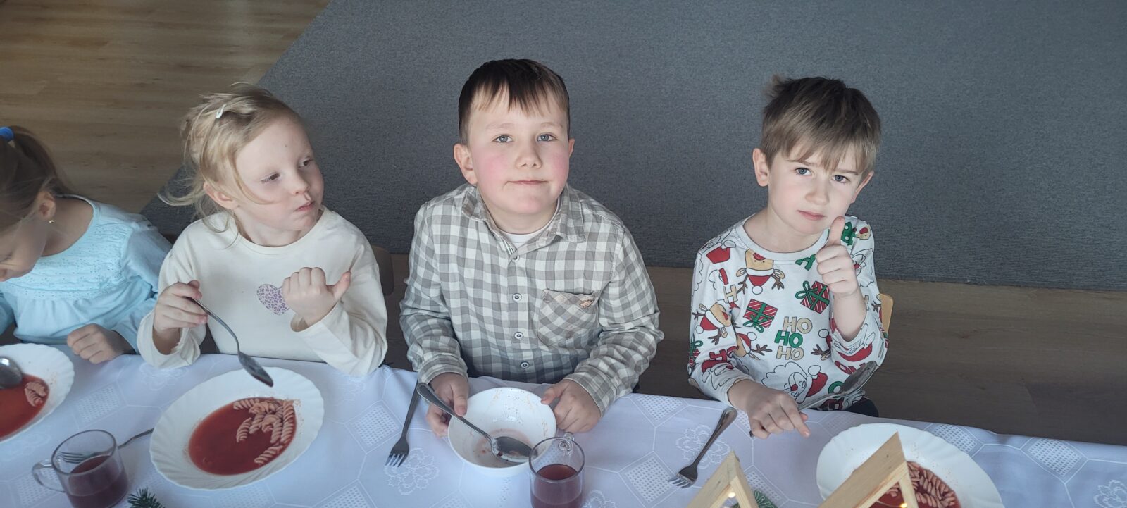 W piątek (19 grudnia) grupa Montessorki i Świerszcze wspólnie zasiadły do świątecznego, wigilijnego obiadu. Przy tej okazji dzieci miały okazję uczestniczyć w różnych obrzędach świątecznych: łamanie opłatkiem i składanie życzeń, śpiewanie kolęd i próbowanie przygotowanych potraw. Poprzez wspólne świętowanie mieliśmy okazję na wzmocnienie relacji w grupie i spędzenie czasu w wartościowy sposób.