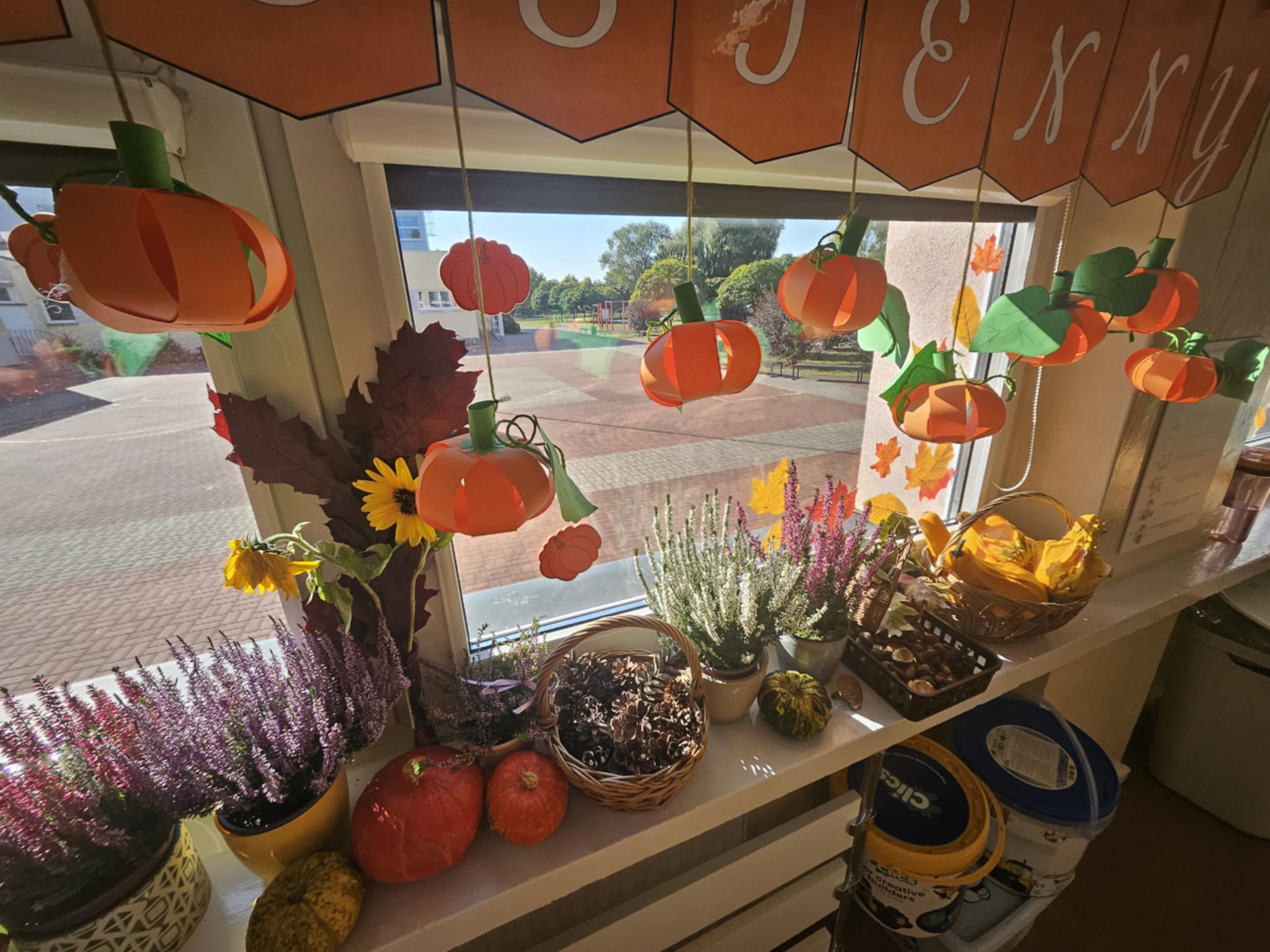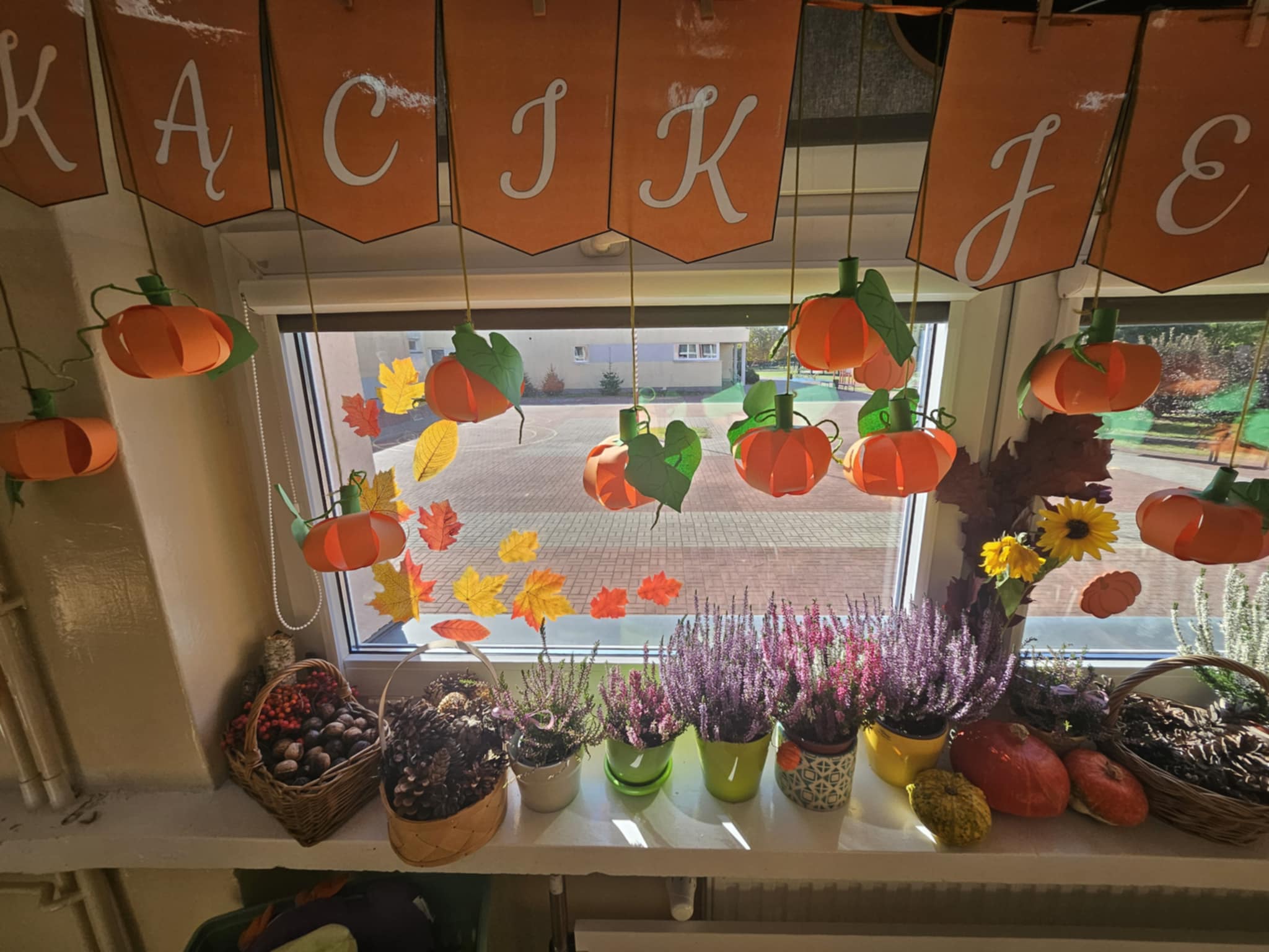 W naszej grupie powstał kącik jesienny, który ma na celu wprowadzenie dzieci w atmosferę tej pory roku oraz zachęcenie ich do poznawania zmian zachodzących w przyrodzie. Kącik został wspólnie przygotowany przez dzieci i nauczycieli. Znalazły się w nim: kolorowe liście i wrzosy, kasztany, żołędzie, szyszki, dynie, suszone kwiaty oraz gałązki z jarzębiną. Dzieci przynosiły dary jesieni z domu i z wycieczek do parku z rodzicami, a następnie wspólnie je segregowały i układały. Kącik pełni funkcję edukacyjną i estetyczną – pozwala dzieciom obserwować i dotykać naturalnych materiałów, rozwija spostrzegawczość, wzbogaca słownictwo oraz inspiruje do zabaw plastycznych i tematycznych. Kącik jesienny stał się także miejscem do codziennych rozmów o pogodzie, zwierzętach przygotowujących się do zimy oraz o zmianach zachodzących w otoczeniu. Dzięki niemu Ekoludki uczą się dostrzegać piękno przyrody i rozwijają szacunek do środowiska naturalnego. Dziękujemy Rodzicom za tak piękne dary jesieni, które zdobią naszą sale, a dzieciom za śliczne papierowe dynie, które dodają uroku naszemu kącikowi.
