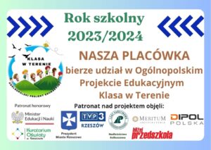 W roku szkolnym 2023/2024 dzieci z grupy „Biedronki” i „Motylki” realizowały projekt pt. „Klasa w terenie”. Liczba uczestników to 50 dzieci. W zadaniach uczestniczyły nauczycielki grup: Natalia Mańka, Adriana Bera, Agnieszka Śledzik i Magdalena Płaszczykowska. Dzieci były bardzo zaangażowane w realizację projektu. Każde zadanie realizowały chętnie, z wielkim zaangażowaniem i radością. Zadania z realizacji były zamieszczane na stronie Projektu na portalu społecznościowym Facebook przez Panią Natalię Mańkę oraz na stronie internetowej przedszkola.