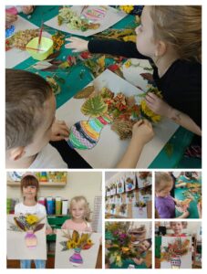 2. Plastyka w terenie- tworzenie prac z darów natury np. ludzików z kasztanów, pani wiosny/lata/jesieni, wazonów pełnych kwiatów/liści itp.