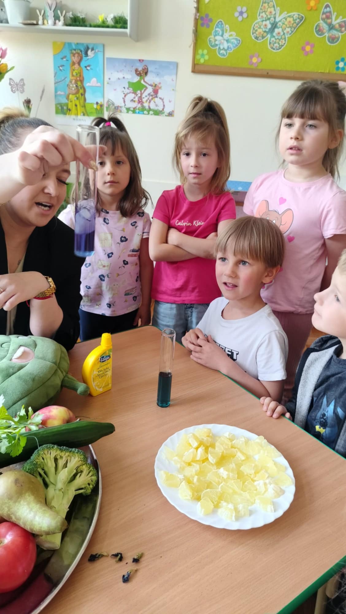 W II półroczu odbyło się również spotkanie z Panią dietetyk podczas którego wykonali doświadczenie tworząc „magiczną herbatę” w kolorze różowym i niebieskim za pomocą naturalnych produktów.