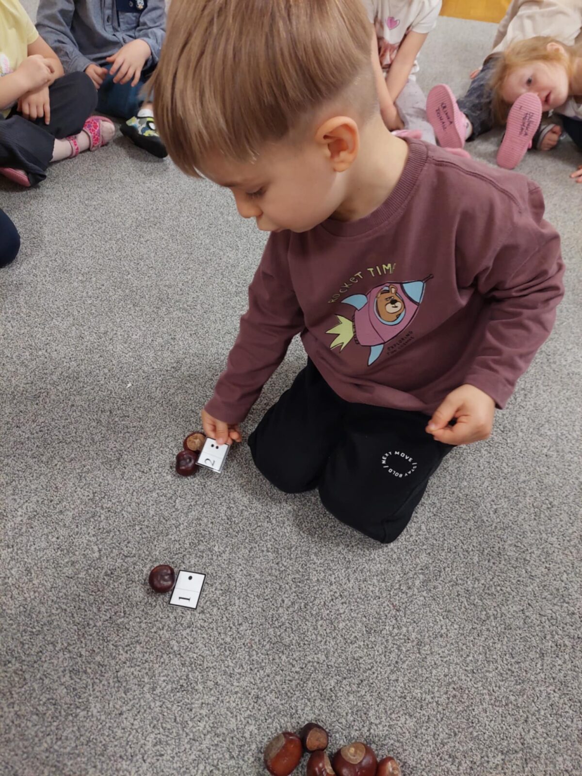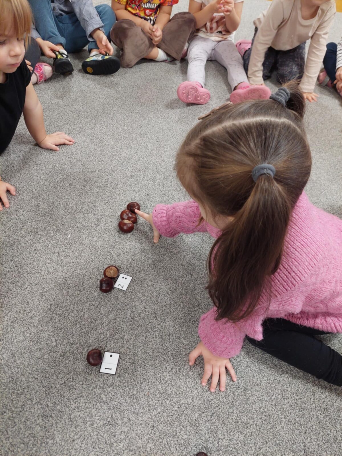 – przeliczanie elementów (np. kasztanów) i dopasowanie ich liczby do wartości na kartoniku,